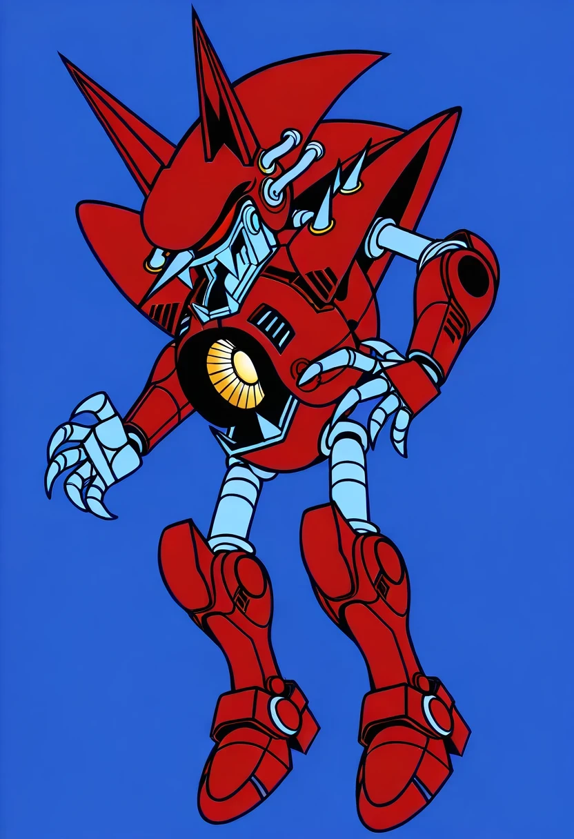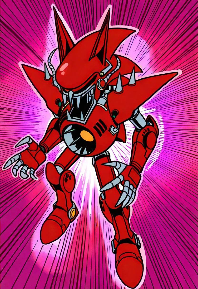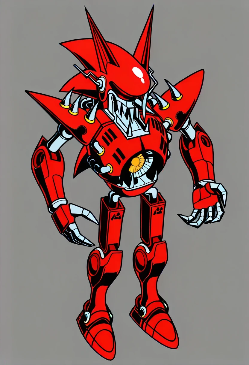 MetalSonicKai, 1boy, bigger more monstrous-looking, red body, long quills, long ears, long spikes, red separated eyes that are similar to a visor, long sharp nose, large mouth, sharp metal teeth, exposed tubes on body, mecha