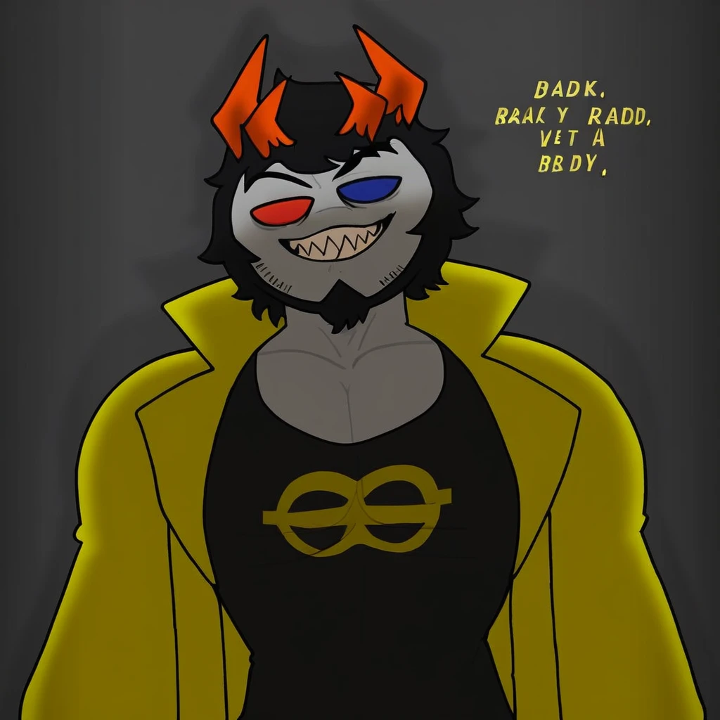 grey skin, black hair, short hair, heterochromia, red sclera, blue sclera, horns, muscular,