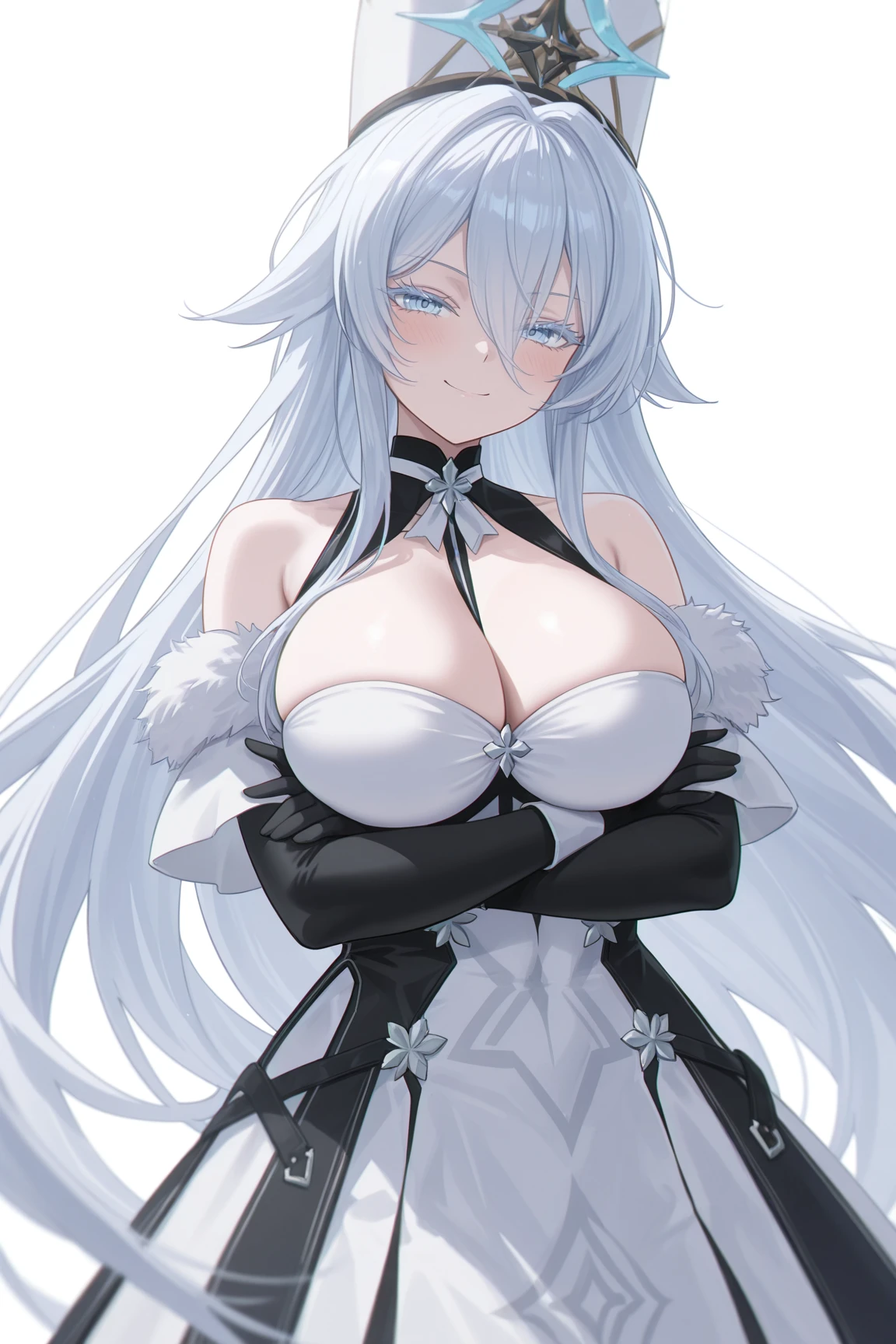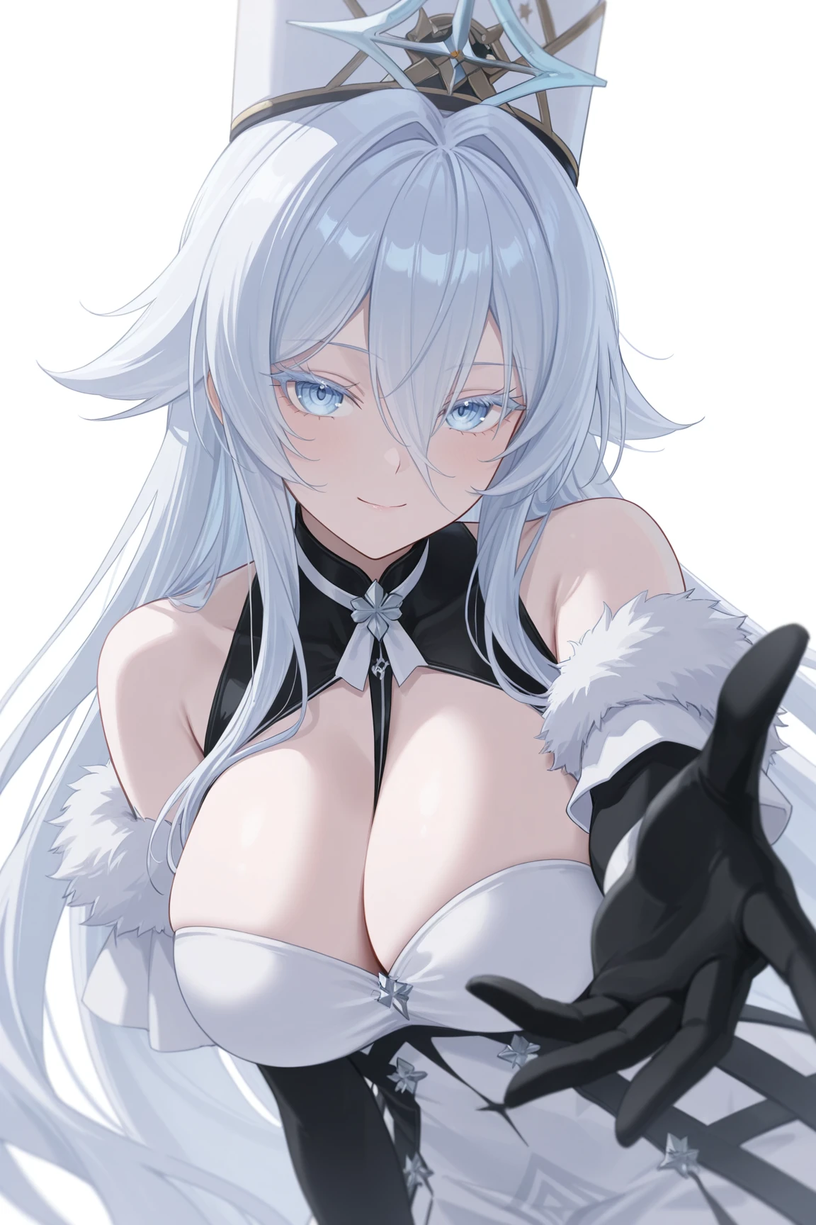 white_uniform, detached_sleeves, black_elbow_gloves, cleavage, fur-trim, bare-shoulders