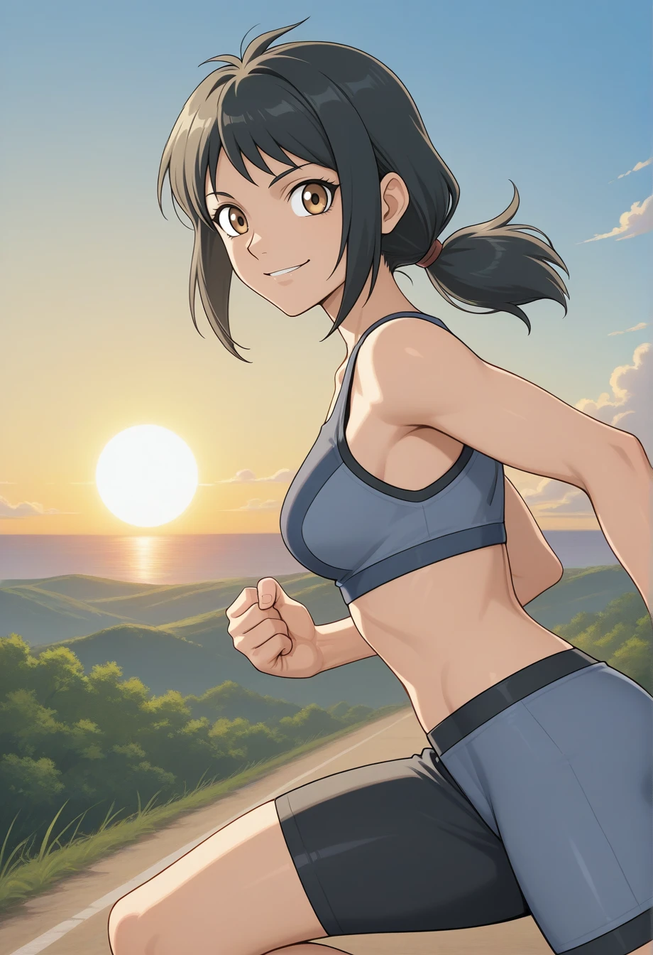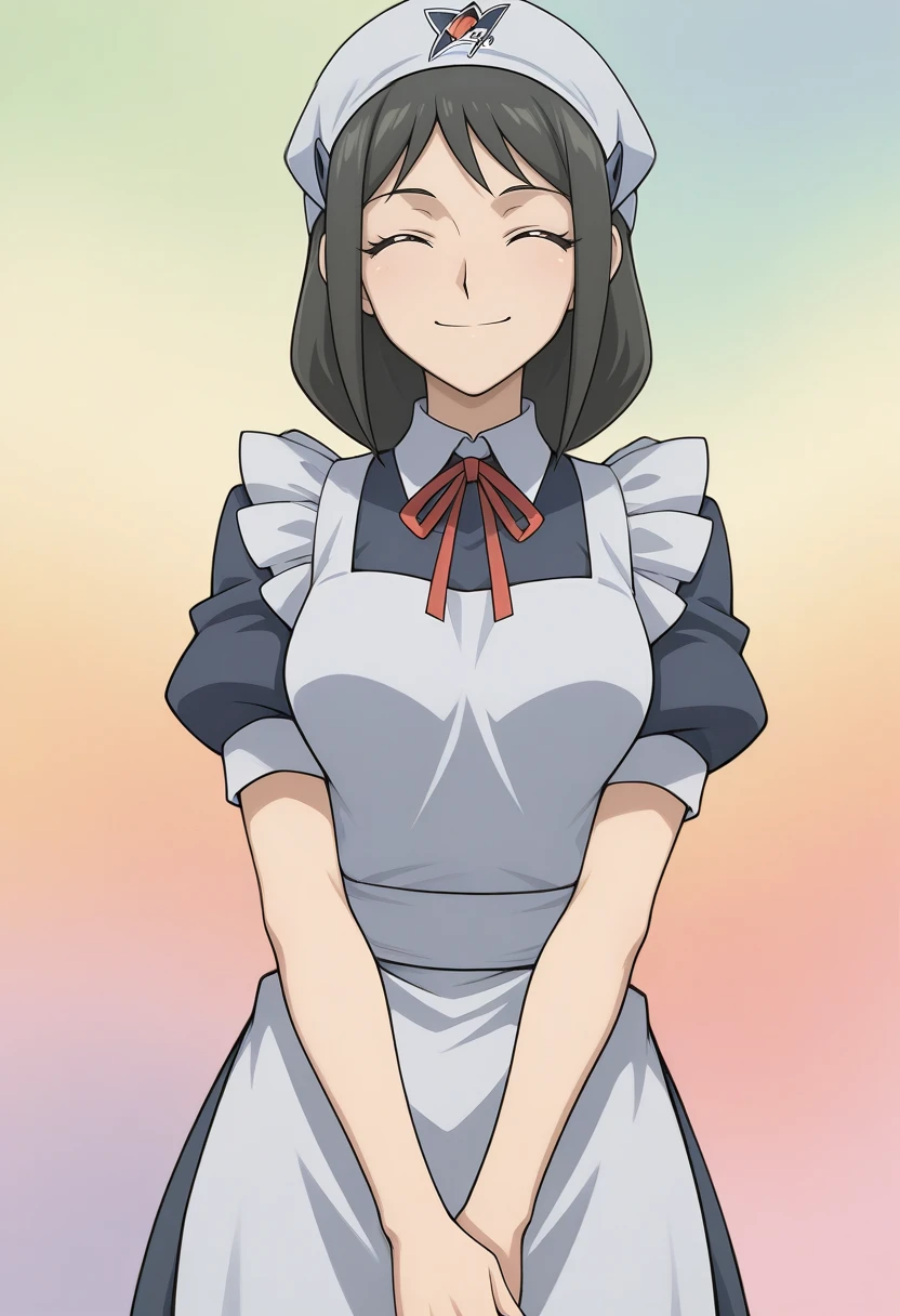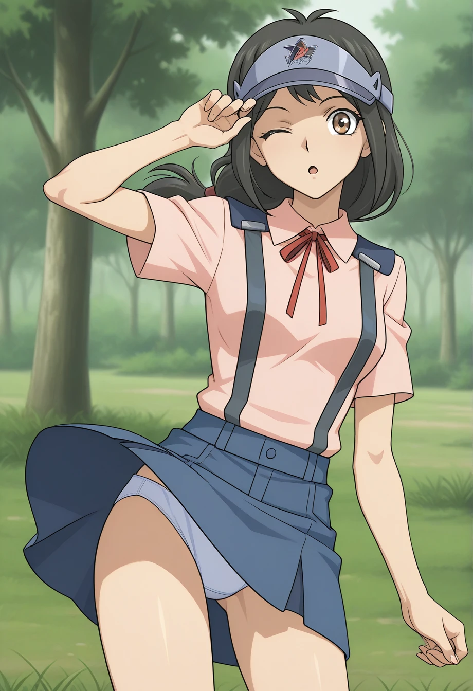 sadiegx, 1girl, solo, hazel eyes, grey hair, low ponytail, pink shirt, red ribbon tie, suspenders, blue skirt, visor cap