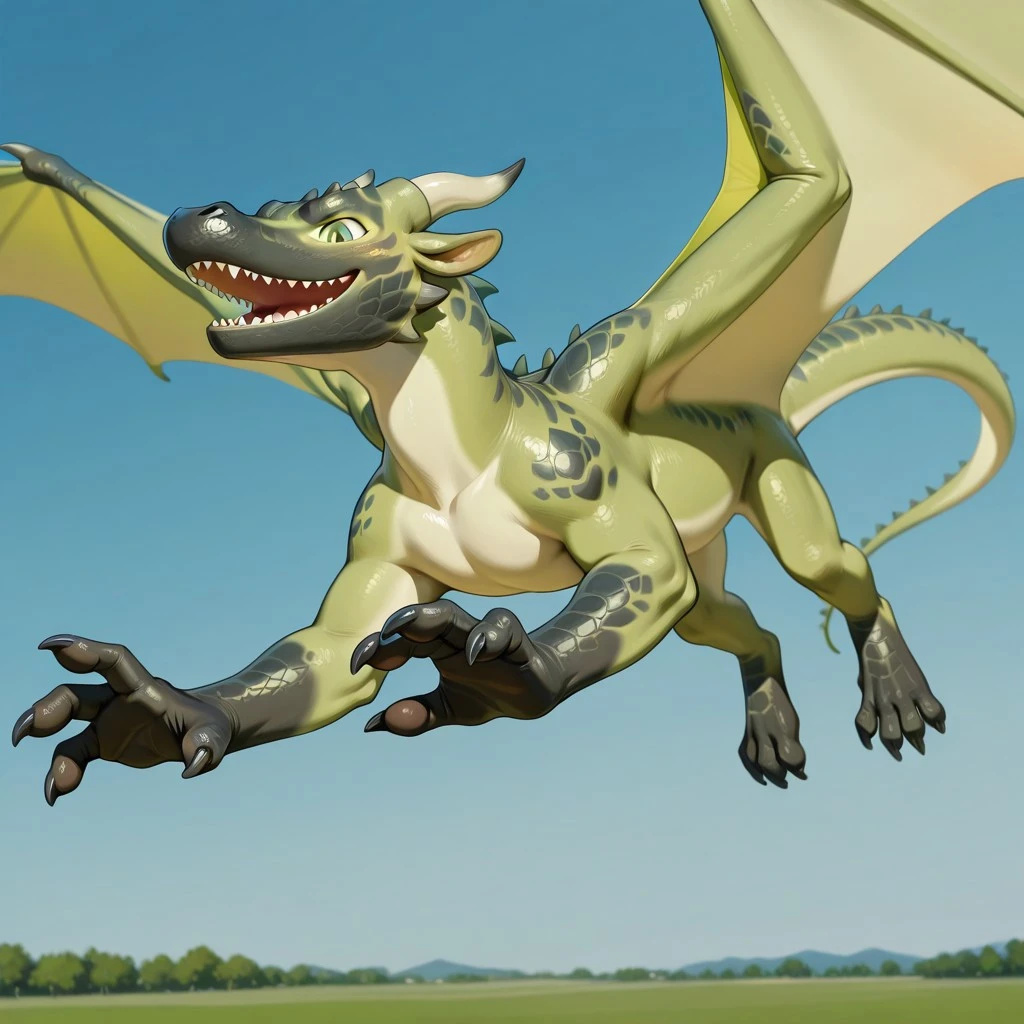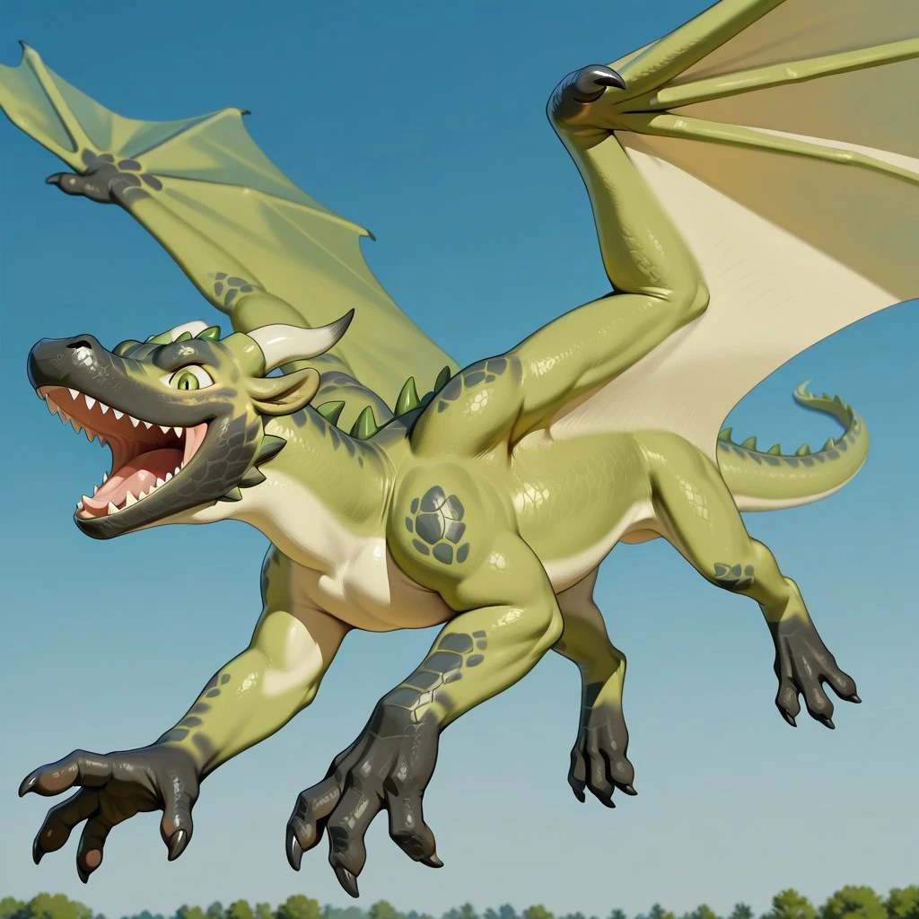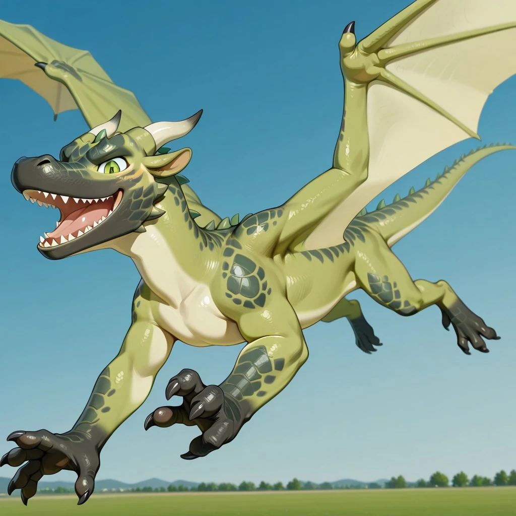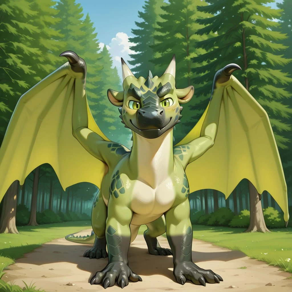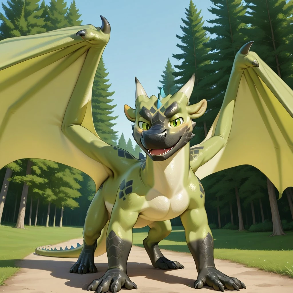 dragon, western dragon, green eyes, green and black skin, dragon horns, dragon wings, dragon tail, back spikes, claws,