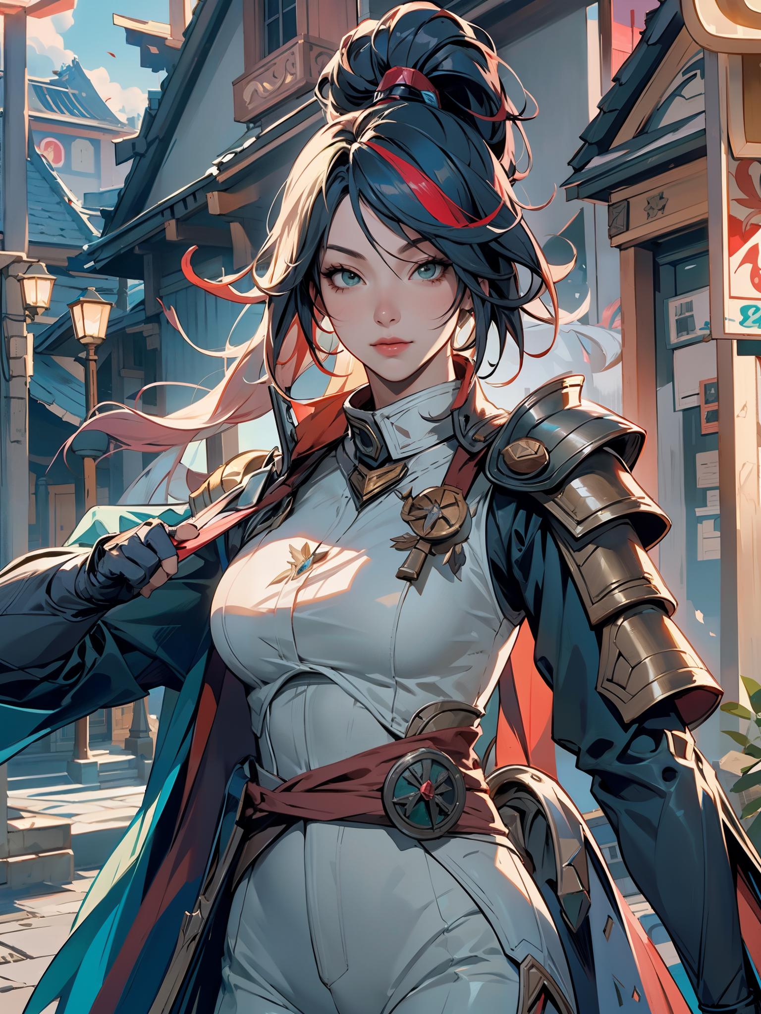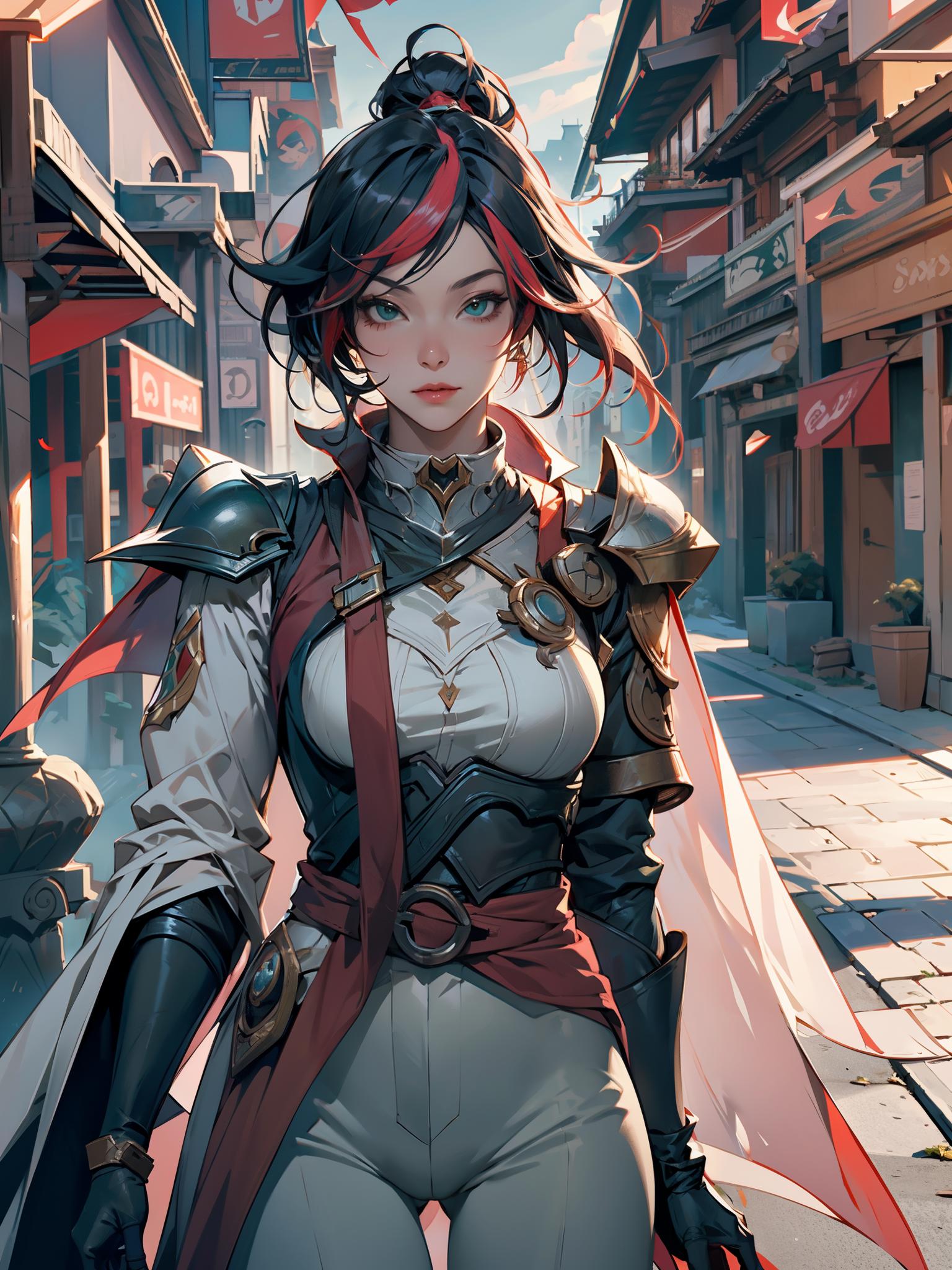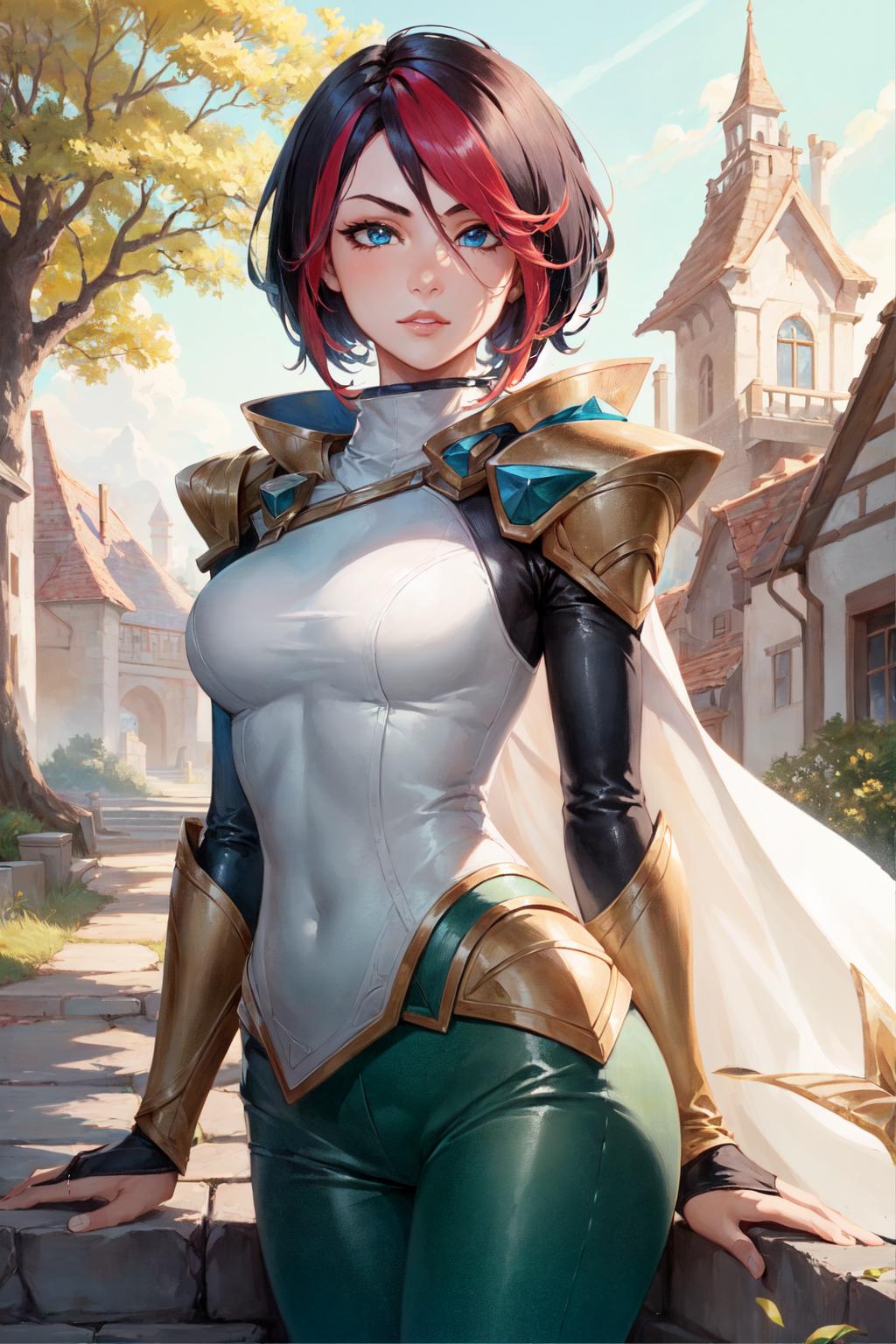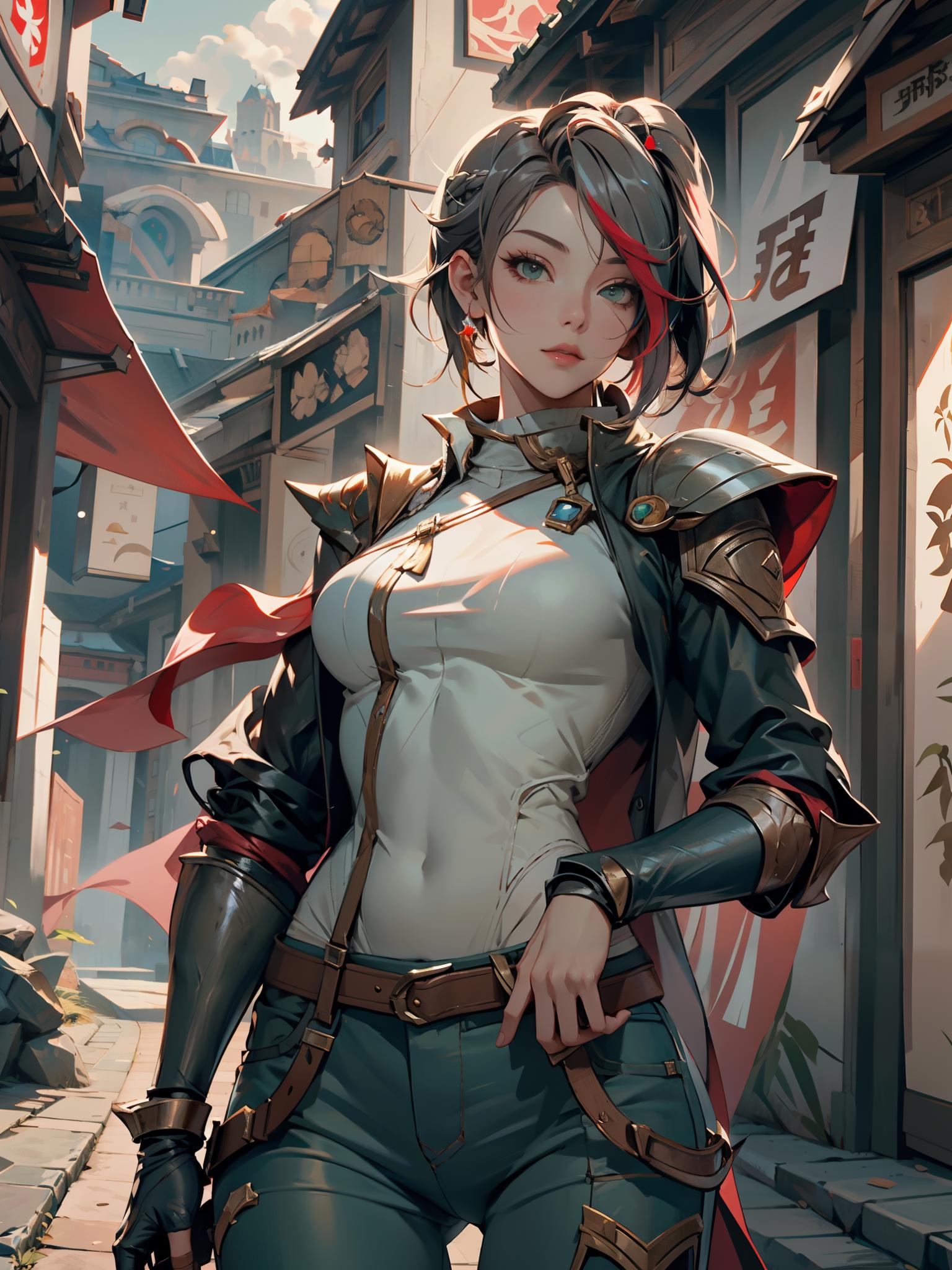 optional tags: streaked hair, white bodysuit, green pants, armor