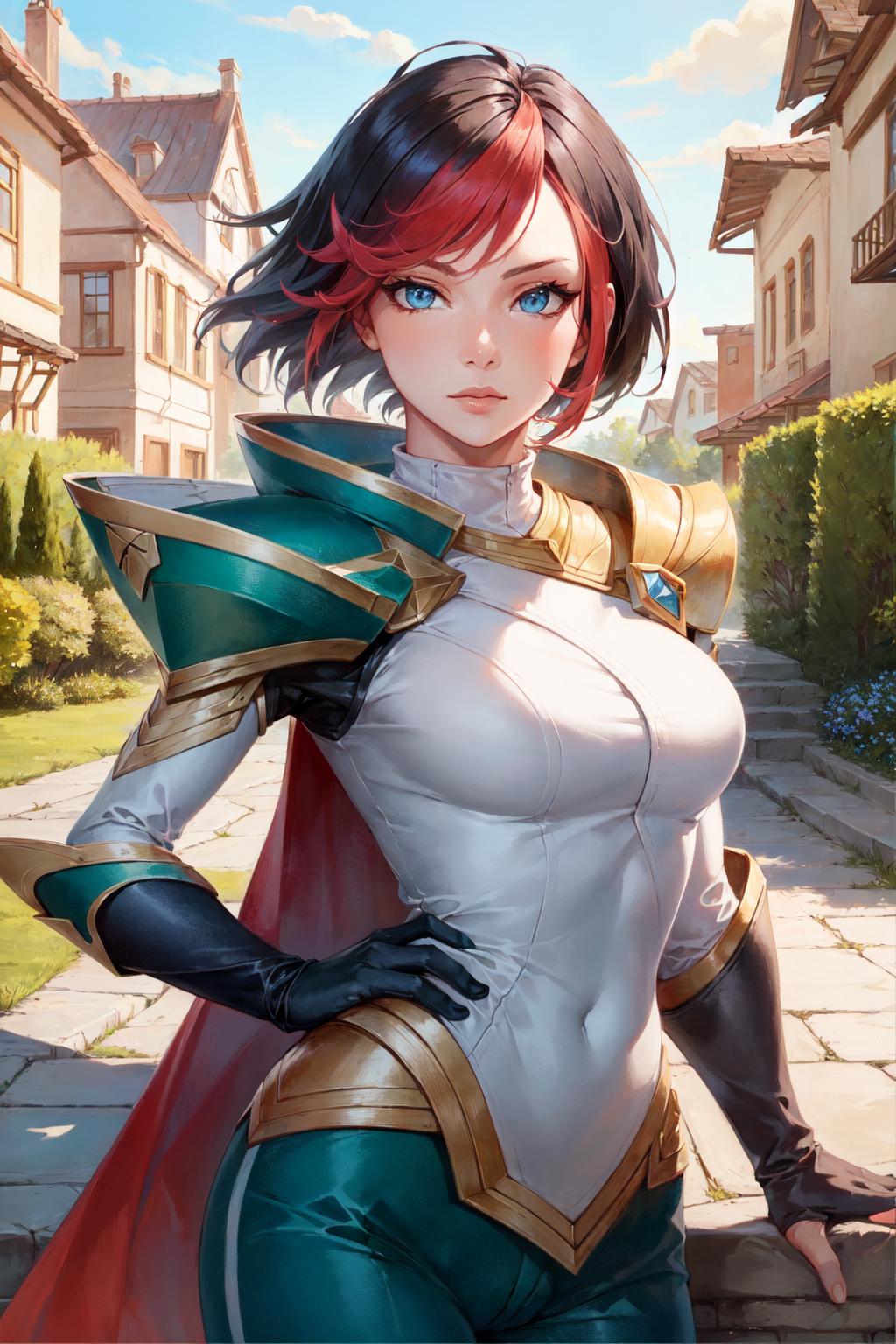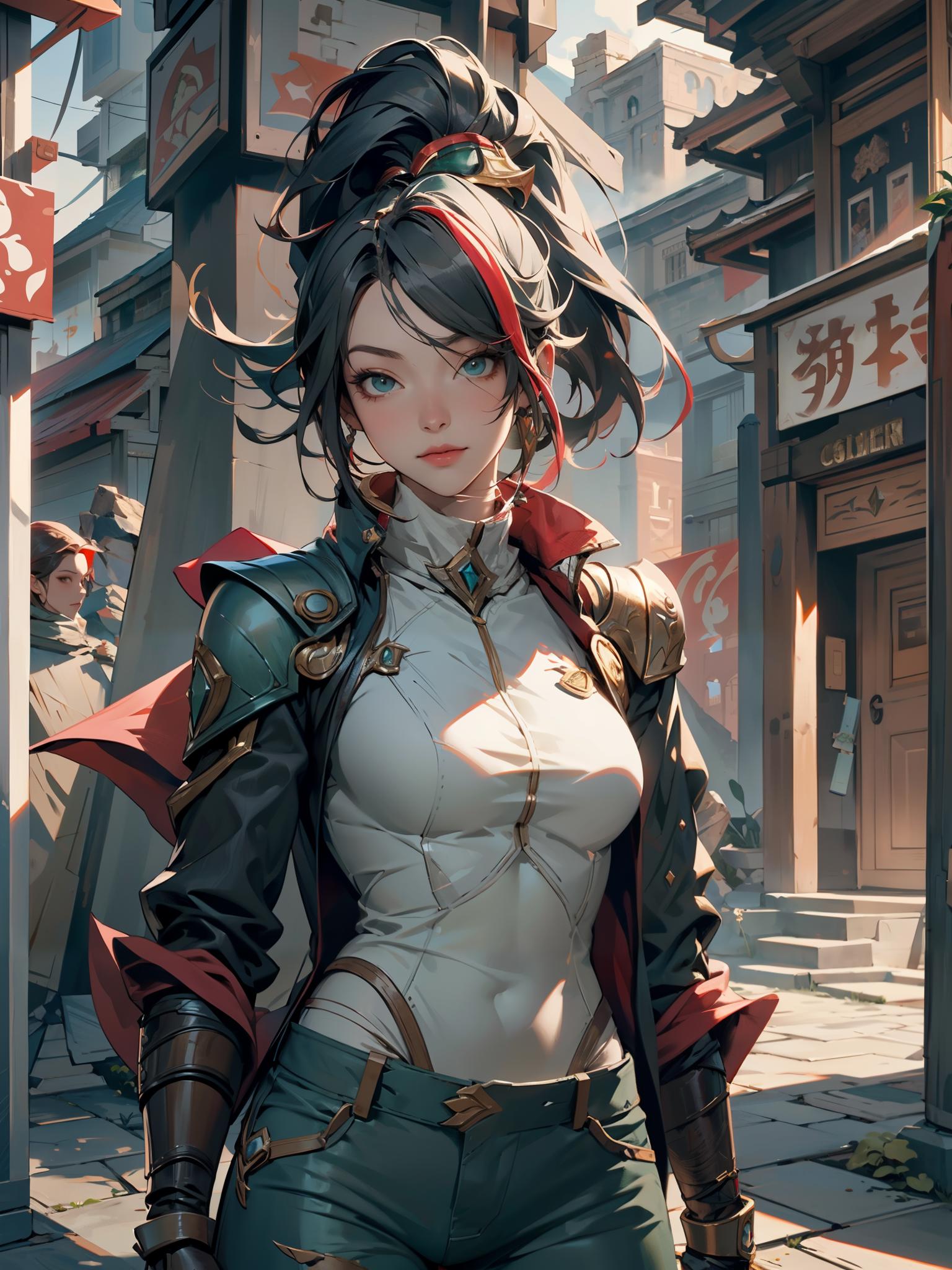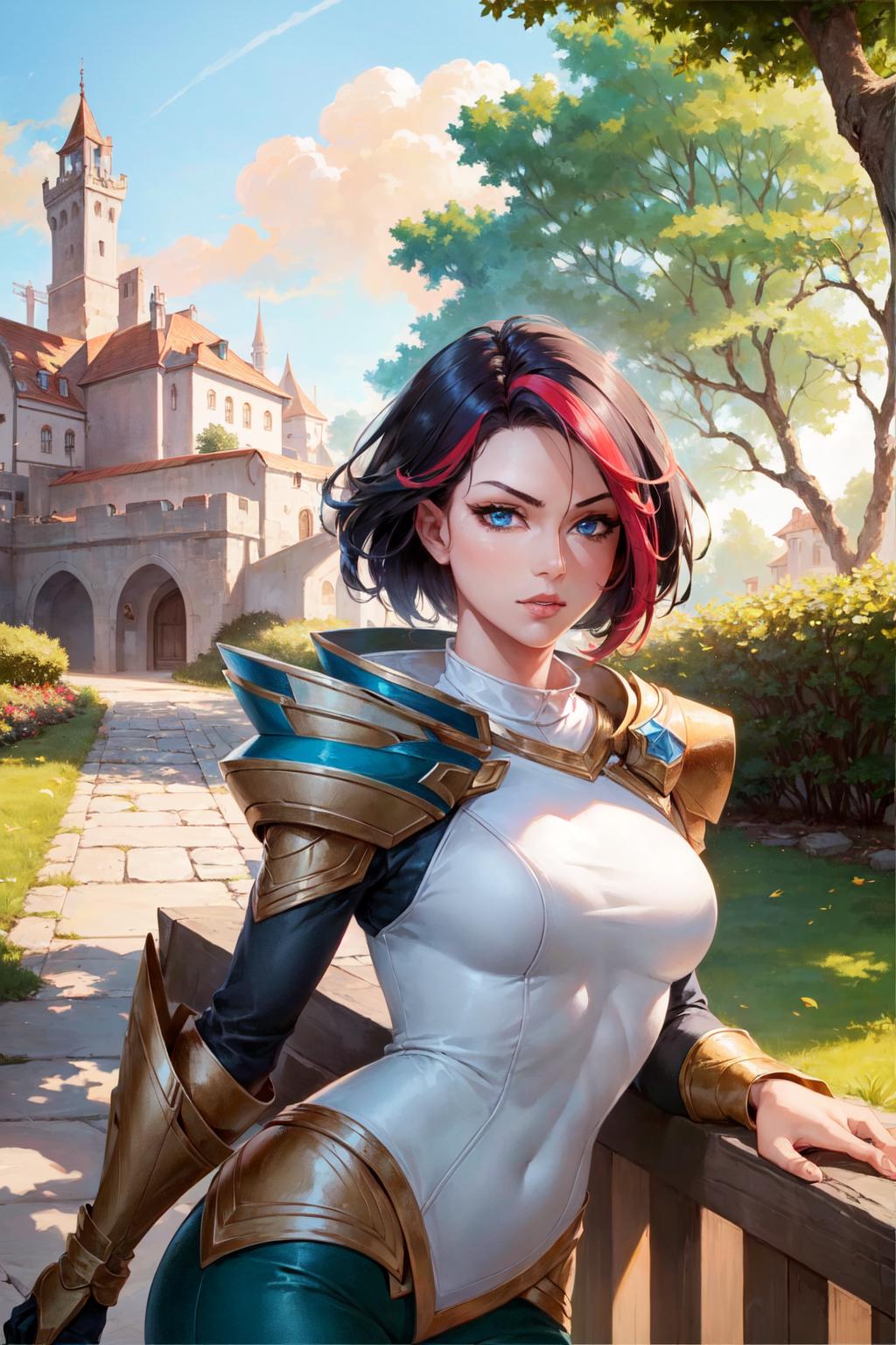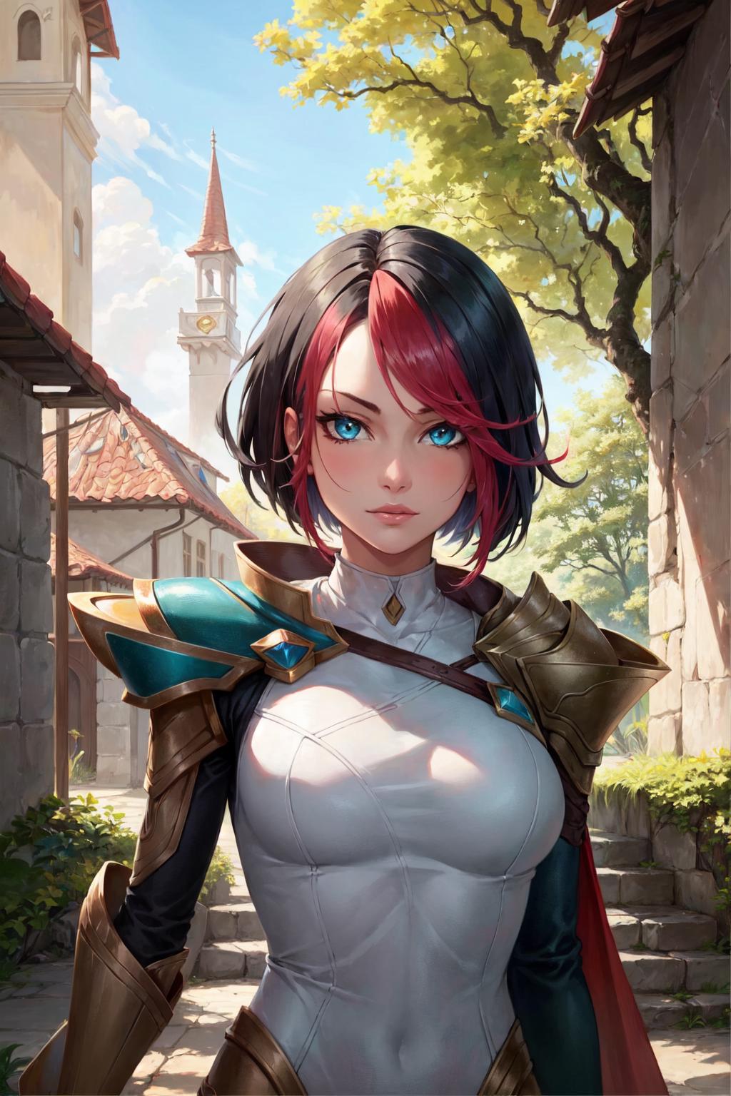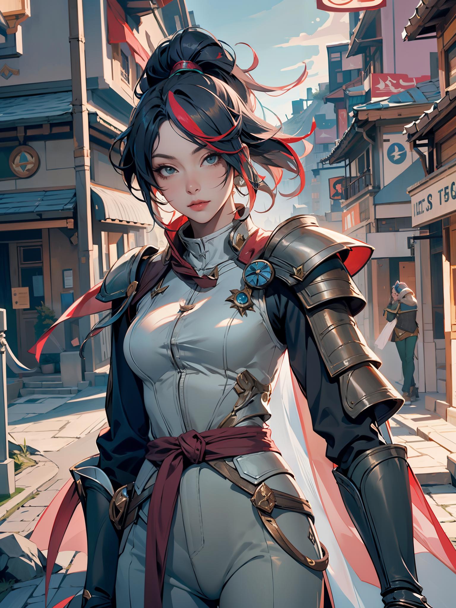 optional tags: streaked hair, white bodysuit, green pants, armor