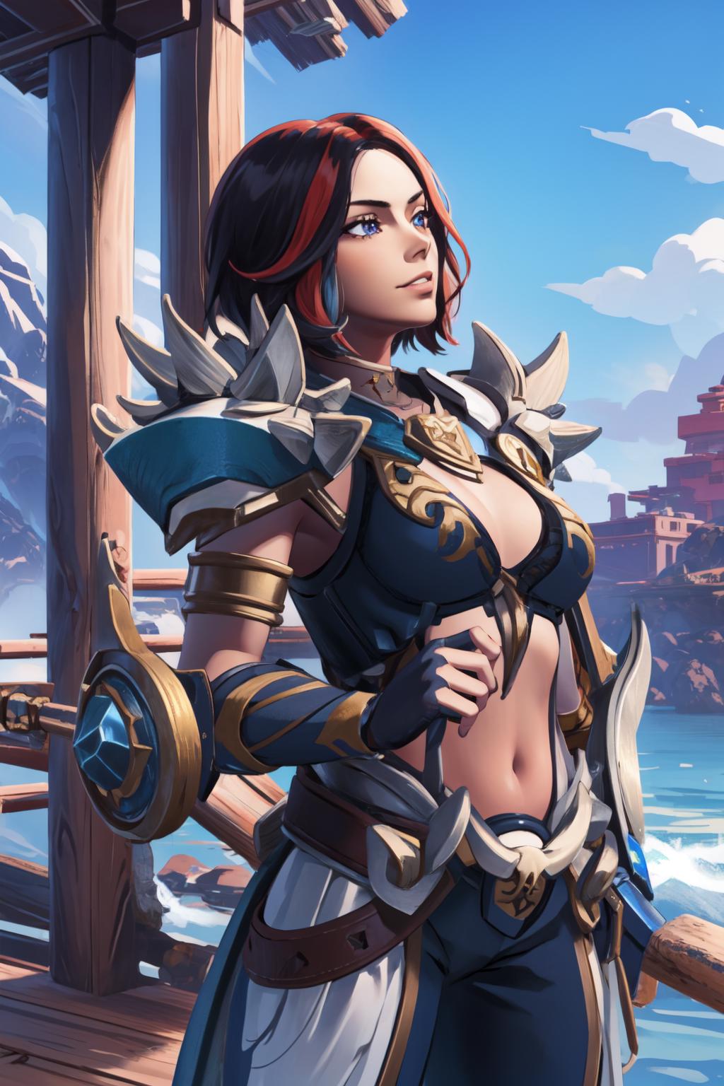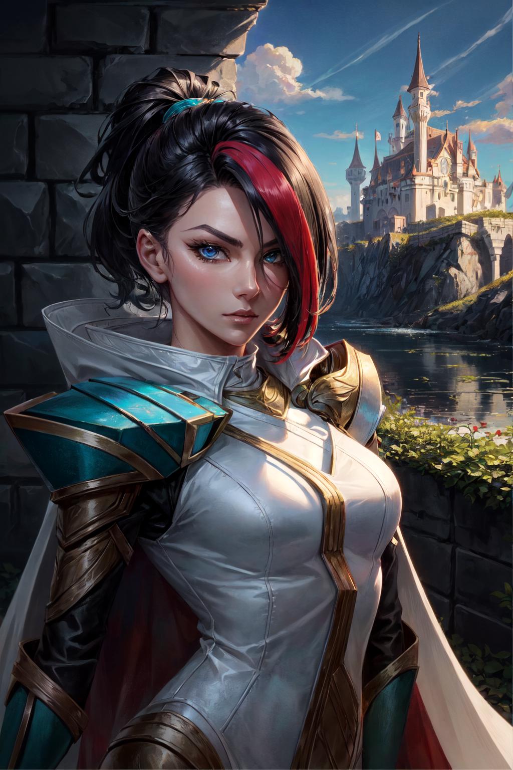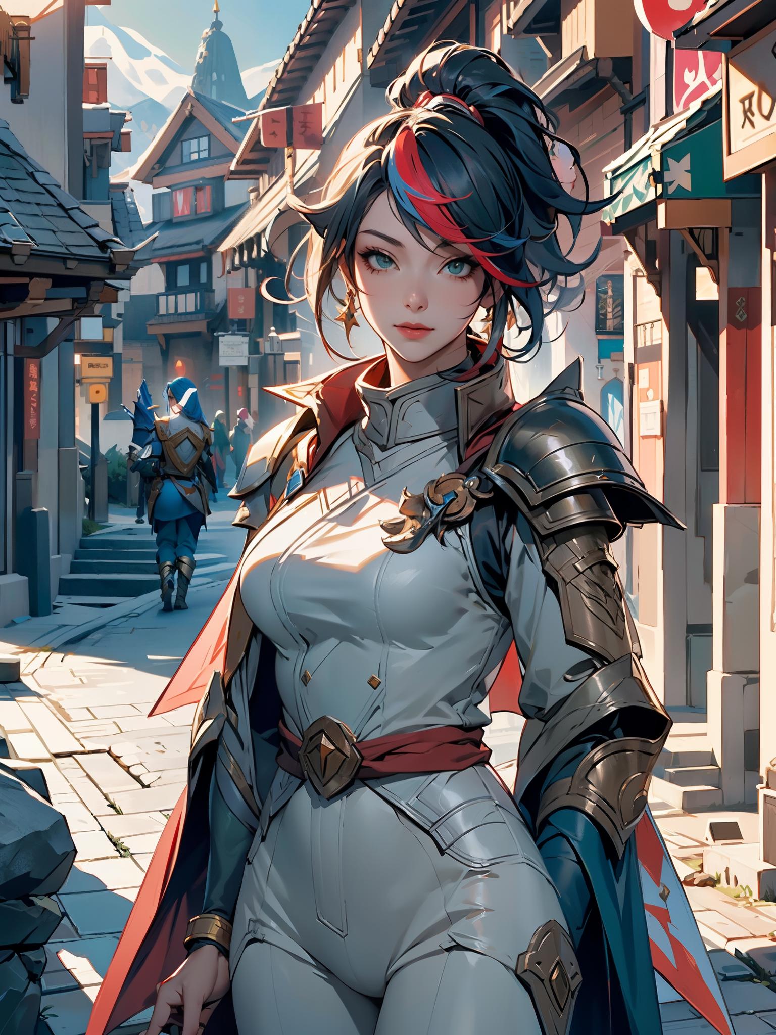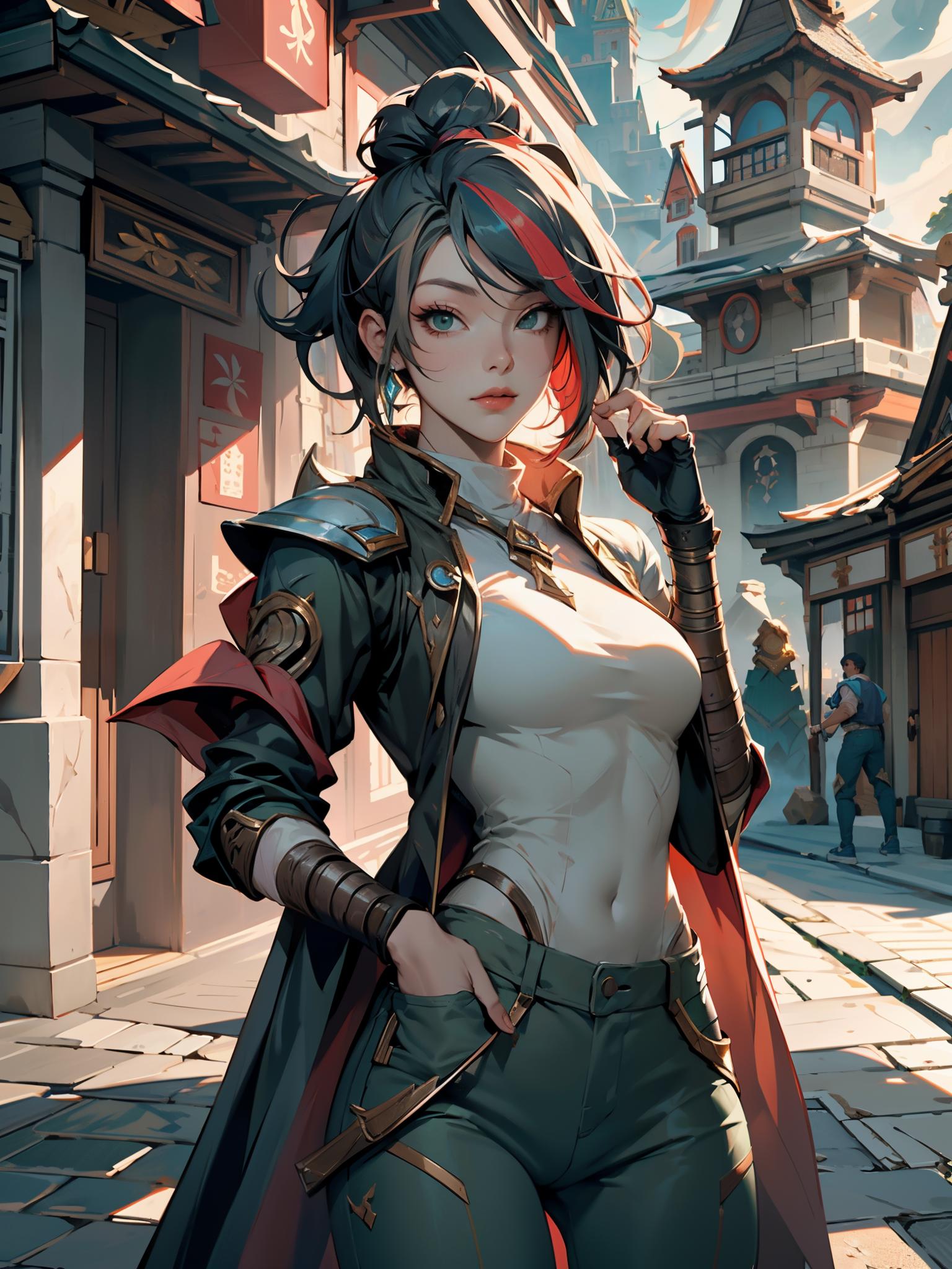 optional tags: streaked hair, white bodysuit, green pants, armor