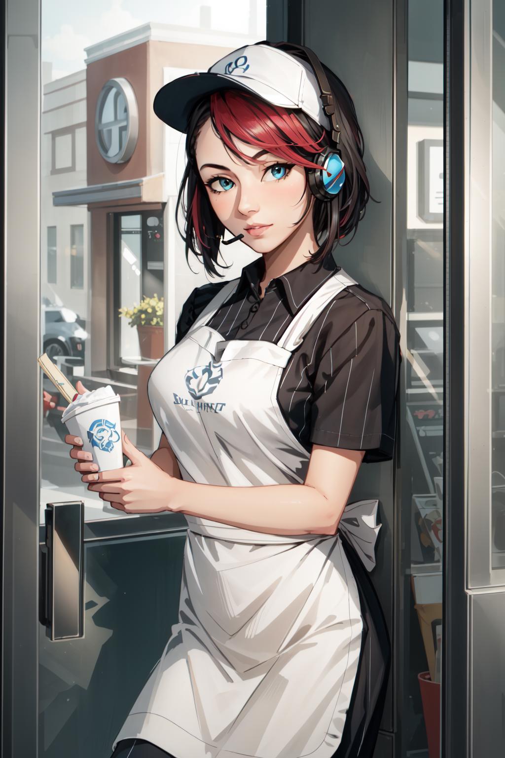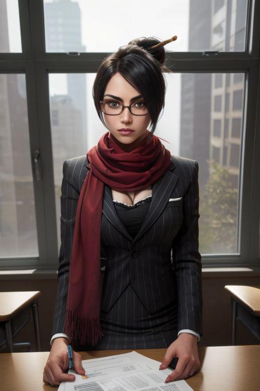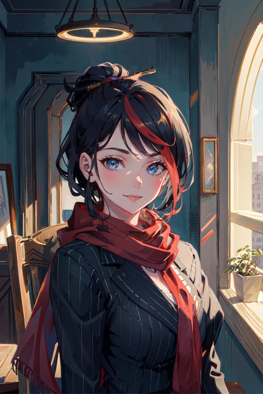 optional tags: pinstripe suit, skirt, red scarf, multicolored hair, hair stick, black thighhighs