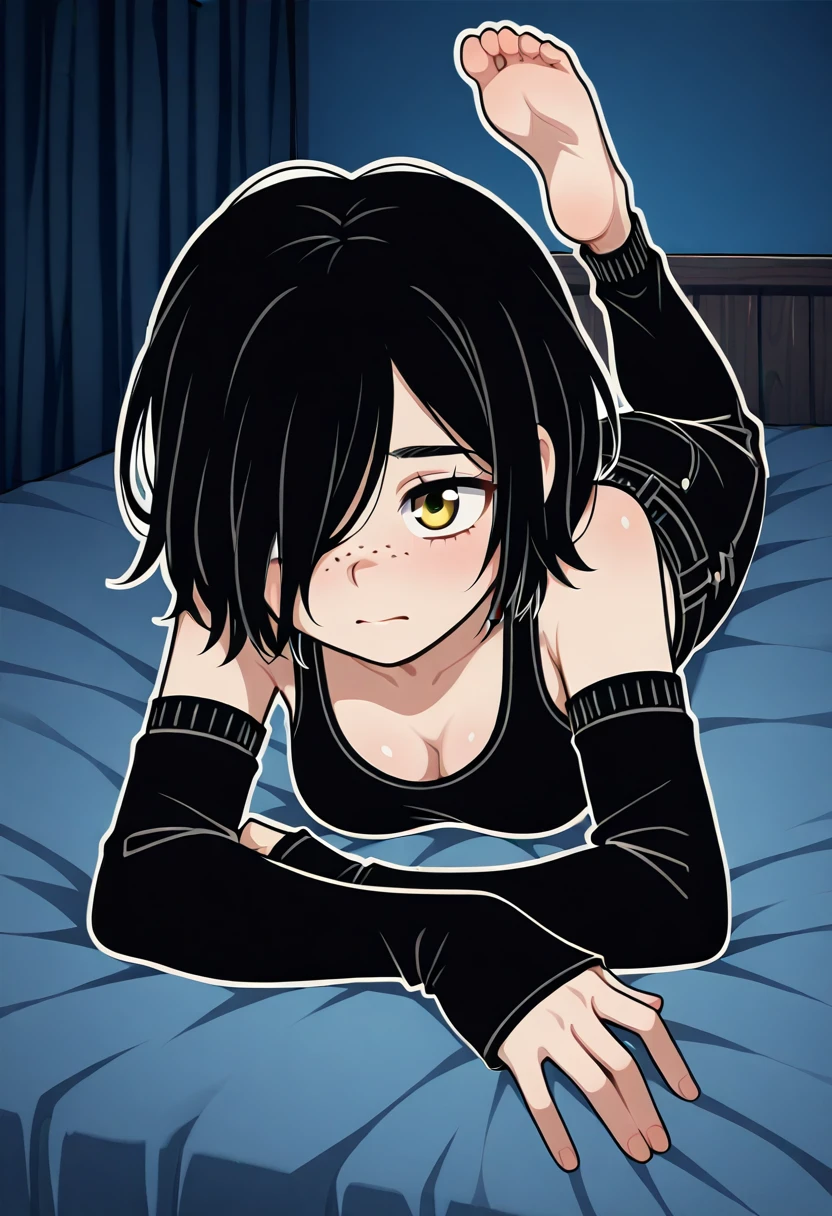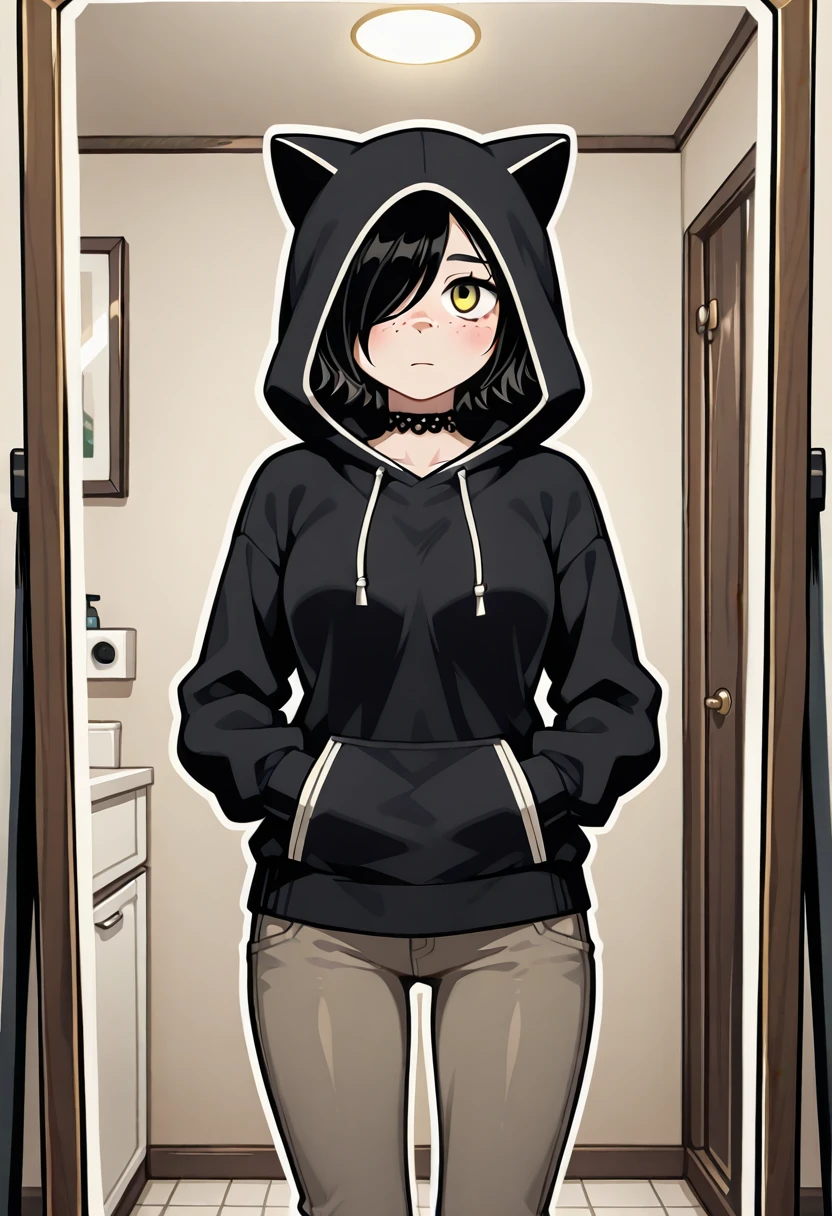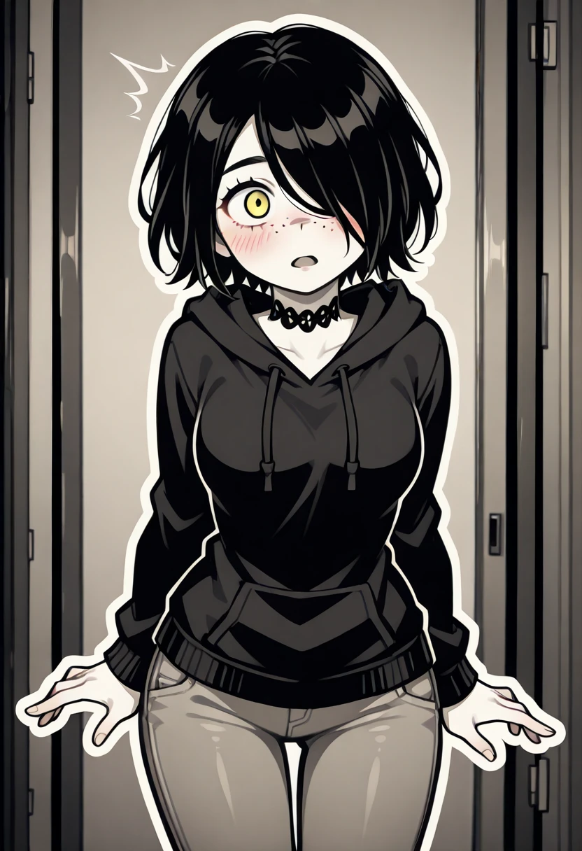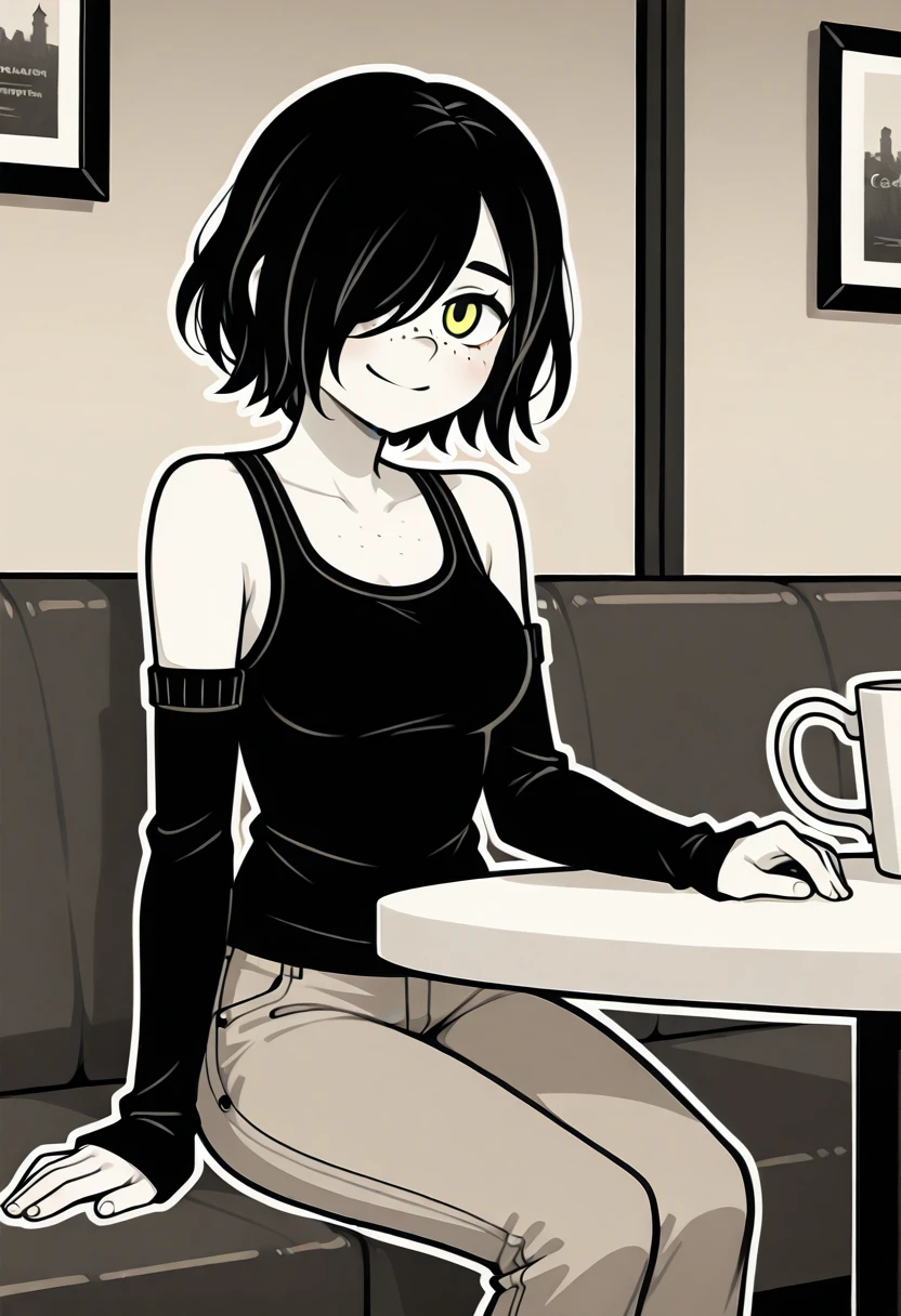 Julia, 1girl, solo, white outline, short hair, black hair, hair over one eye, yellow eyes, freckles, medium breasts