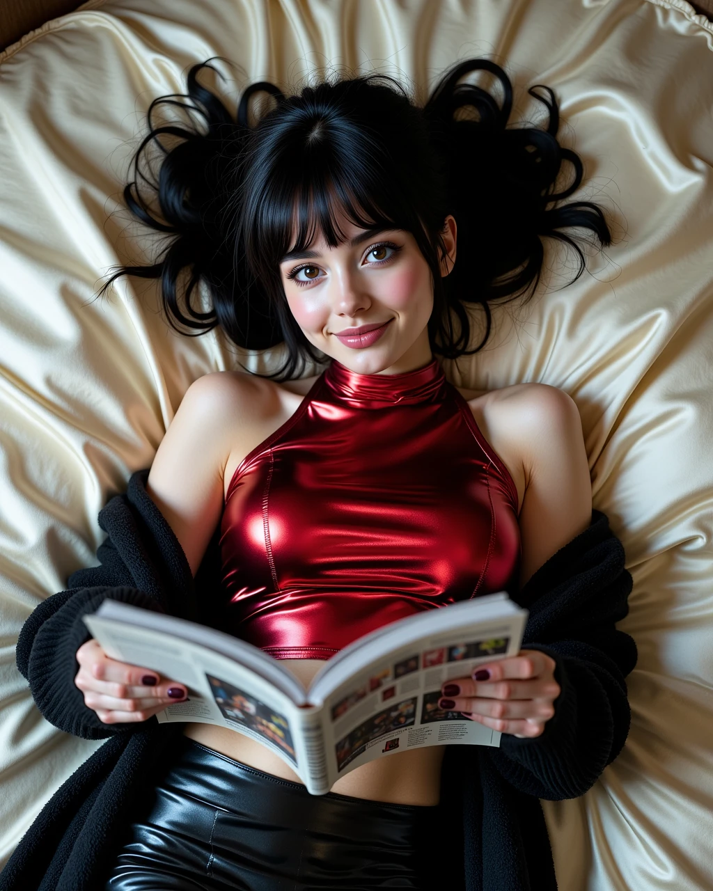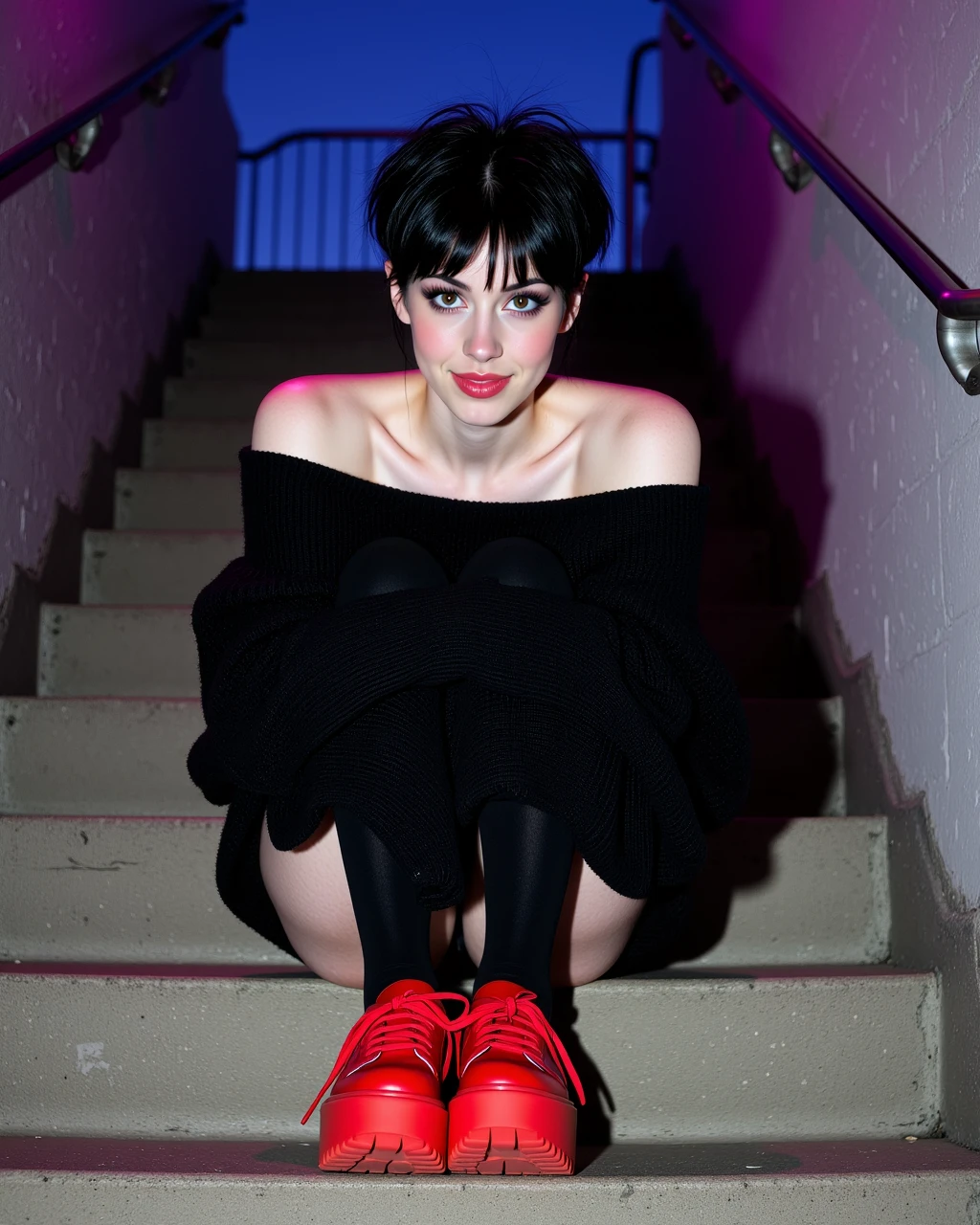 m4llgoth, a cute age 18 teen girl sitting on basement stairs leading up, harsh flash from below casting upward shadows, seductive pout mixed with fear, wearing black velvet corset top and black pleated skirt, chunky black platform bootsm4llgoth, a cute age 18 teen girl sitting on bed holding black skull mug, wearing sheer black mesh top over black corset and shiny black vinyl pleated skirt, messy high bunm4llgoth, 20-year-old woman sitting on mall bench with legs crossed, black velvet top with pentagram harness, long black skirt, crystal necklace, hair in high ponytail with bright turquoise streaks, purple-streaked bangs, storefronts blurred behindCheck the meta/comfy workflows on all the sample images for more inspo.