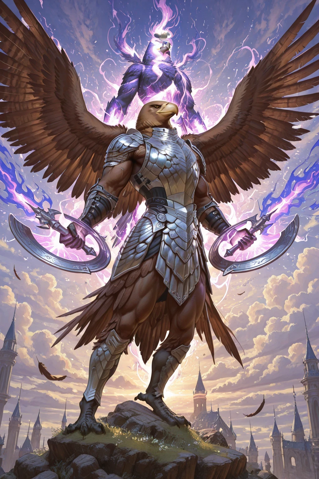 Clothing/Armor: feathered armor, knight pauldrons, avian headdress, flowing cape, metallic gauntlets