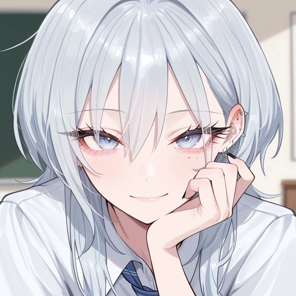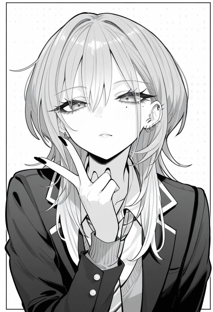 Haimiya, long hair, piercings, ear jewelry, black nails, beauty mark under eye, long eyelashes, silver hair,