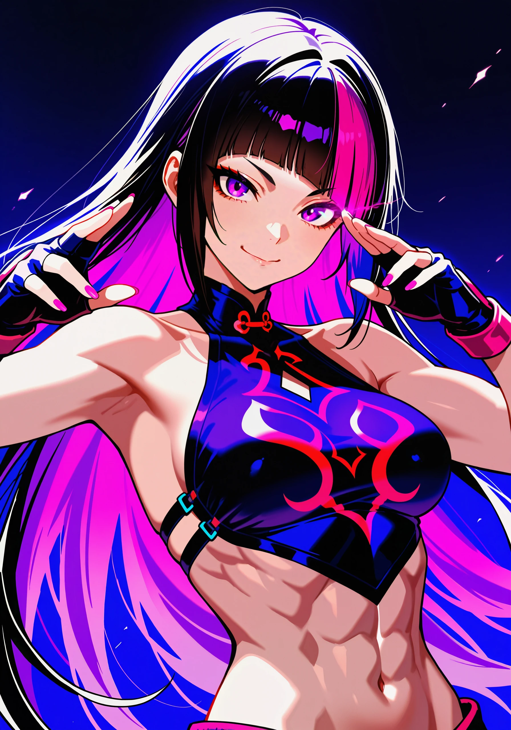 This LoRA creates images in a bold, cel-shaded anime style with a distinct "chromy" and colorful aesthetic.