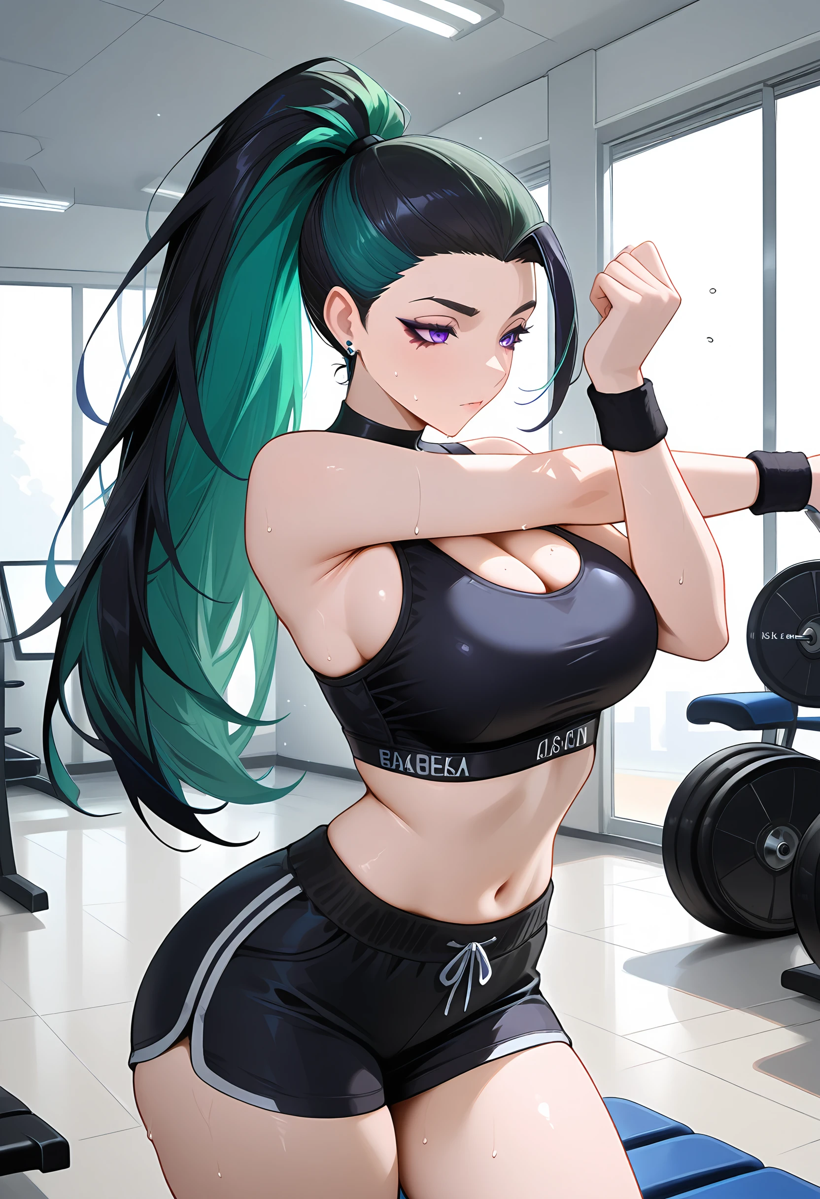 kaisabaddestxl, earrings, jewelry, jacket, ponytail, long hair, purple eyes, off shoulder, crop top, multicolored hair, (green hair:1.1), black hair, black tight pants, bare shoulders, wide hips,