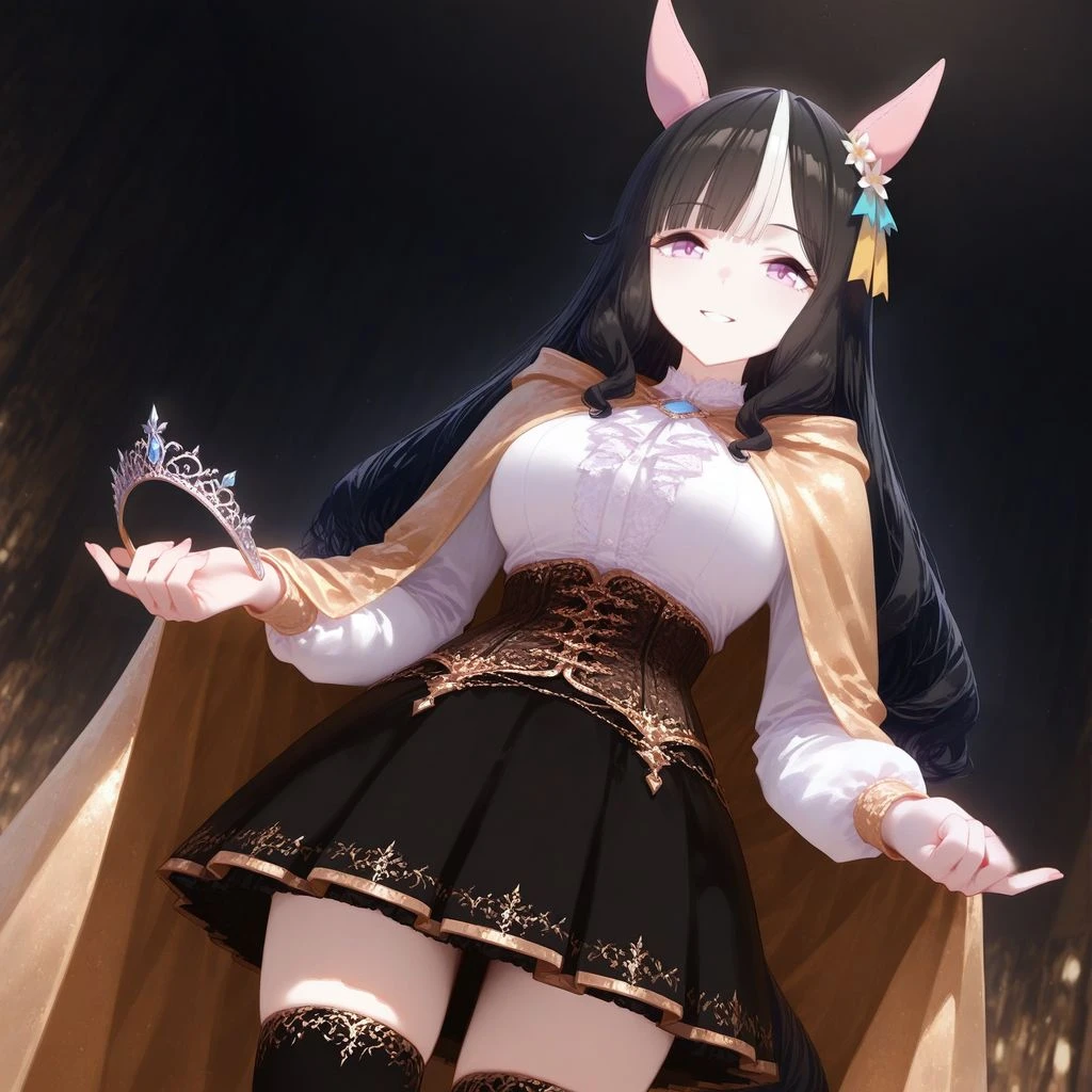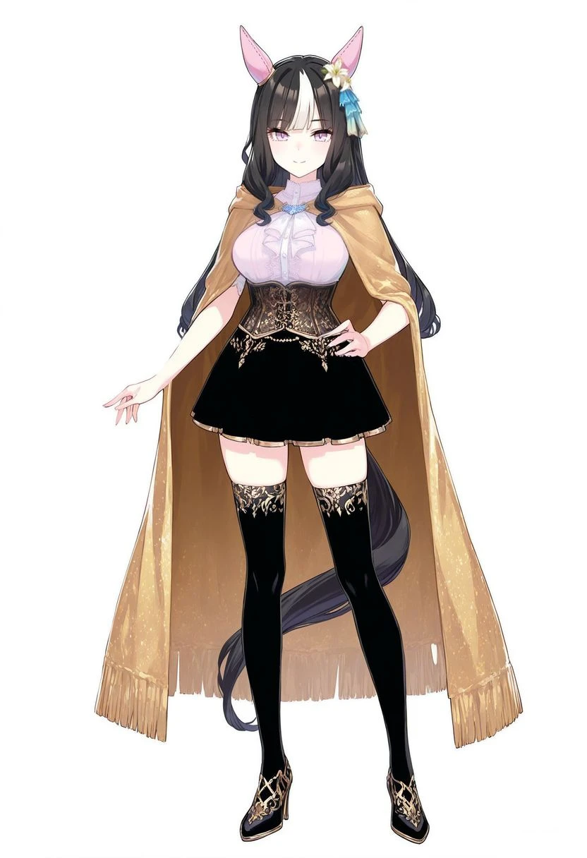 tesko gaby \(umamusume\), horse ears, ear covers, ear ornament, black hair, long hair, streaked hair, tsurime, pink eyes, horse tail, black skirt, black thighhighs, corset, gold cloak, miniskirt, white shirt, high heels