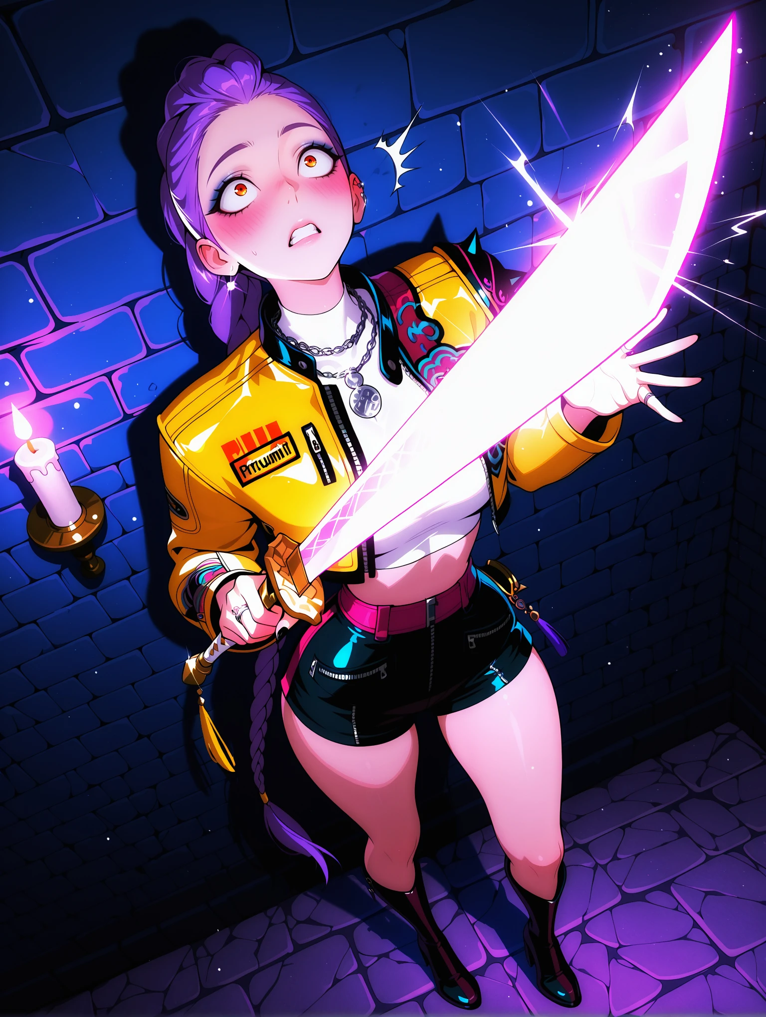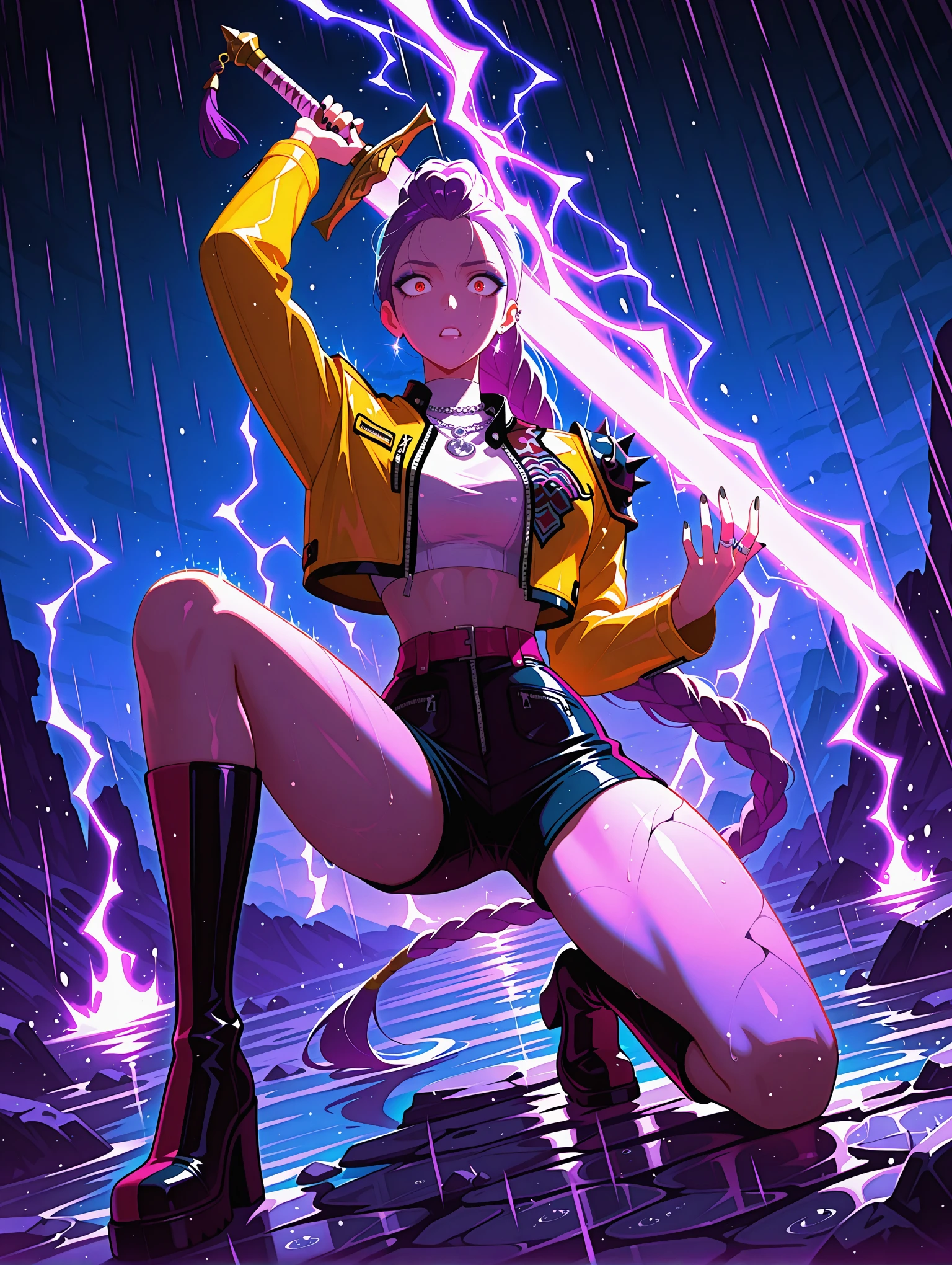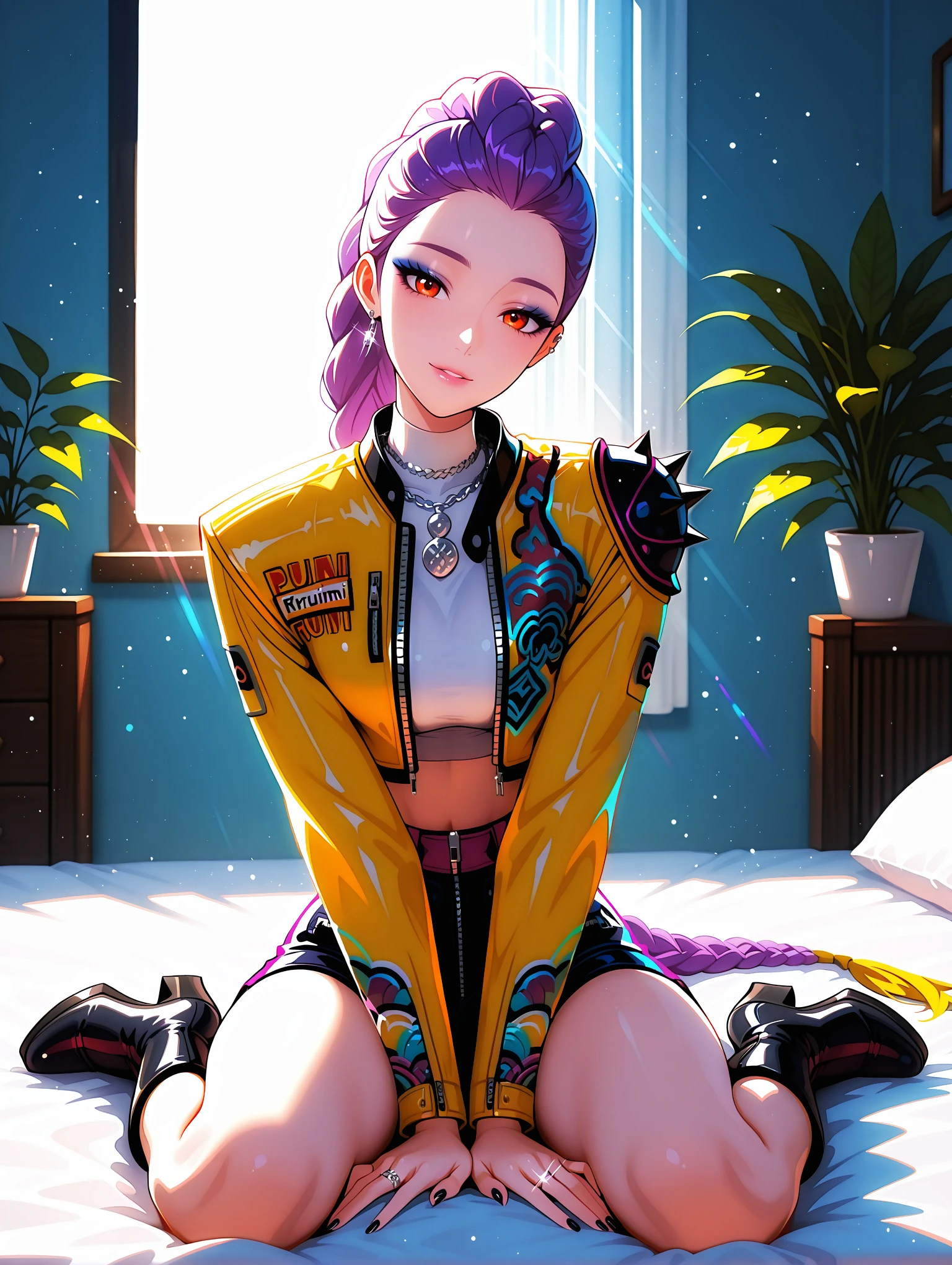 Outfit Prompts : makeup, jacket, earrings, necklace, crop top, black shorts, push up shorts, yellow jacket, cropped jacket, ring, ear piercing, spikes, belt, black nails, knee boots, high heel boots