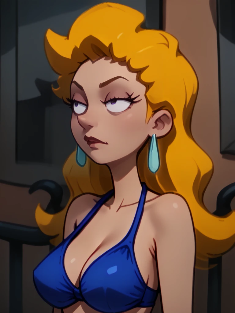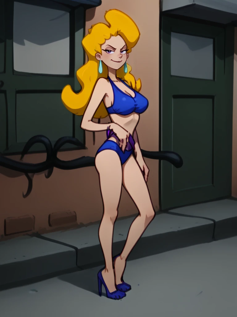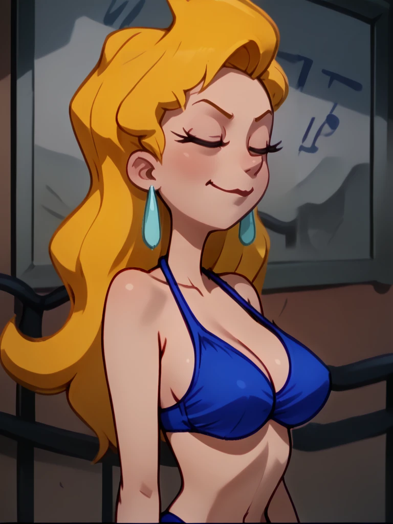 1girl, blonde hair, long hair, blush, purple swimsuit, makeup, bikini, solo, sitting, swimsuit, closed eyes, high heels, banana