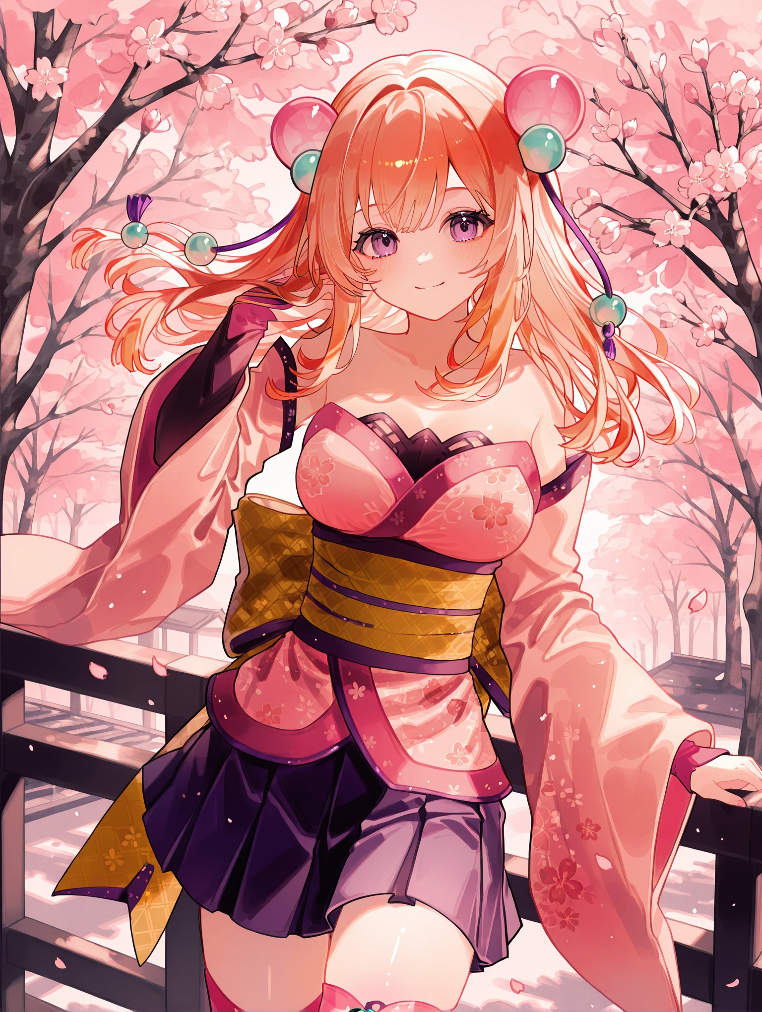 pink sleeveless kimono, floral print, pink thighhighs, blue anklet, okobo, yellow obi, purple pleated skirt, framed breasts, layered sleevesMay not be the best, but there's only so many times I can re-train and I accidentally deleted the entire dataset. x.x