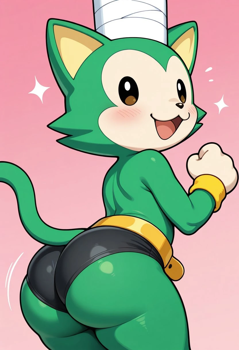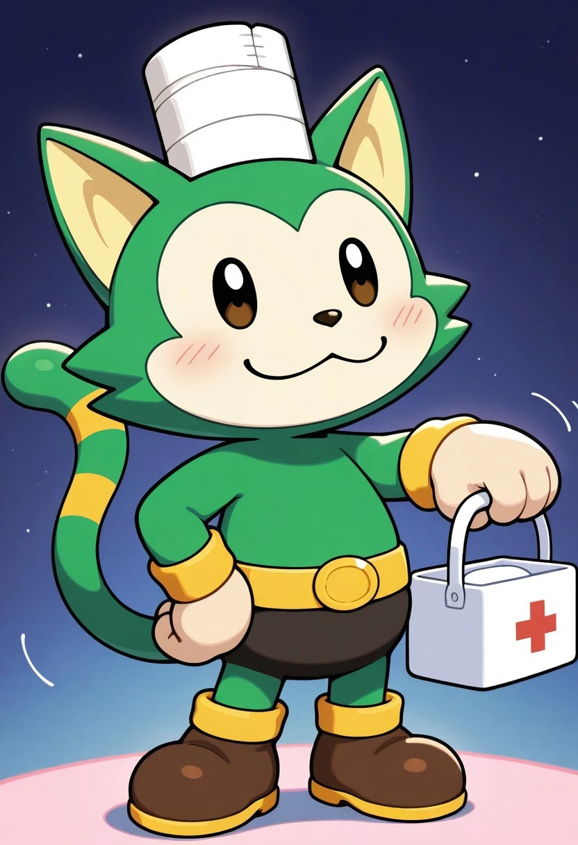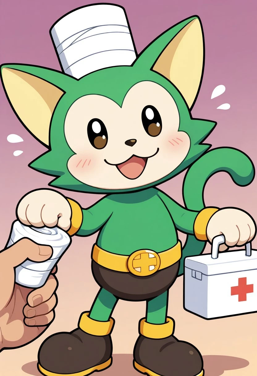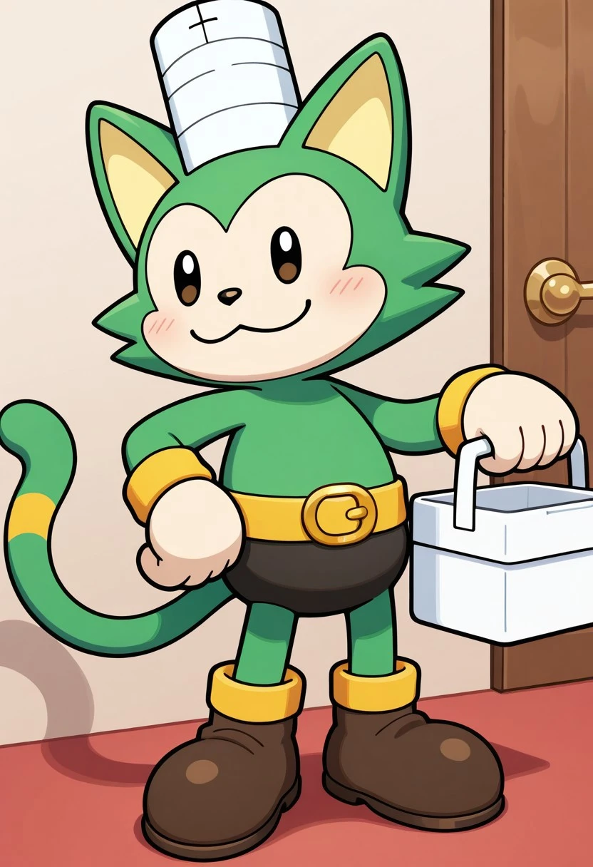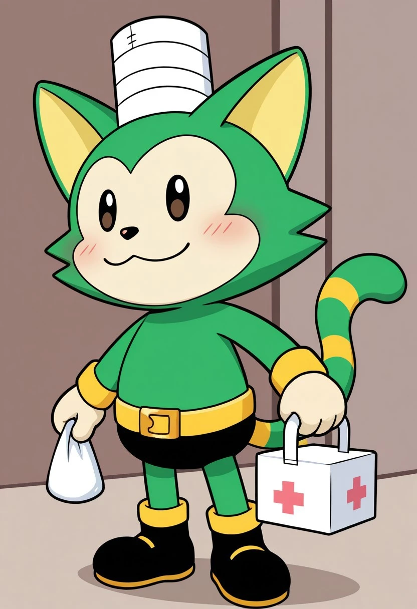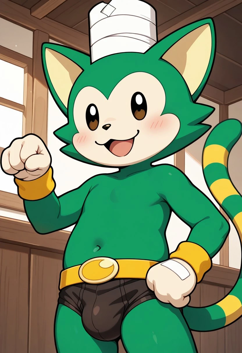 black bottom, yellow belt, green tail with yellow stripes, male, bandage roll on head, yellow wristband on hand, cat, anthro, solo, green body, tan face, tan hands, black boots, black briefs, black nose, dot eyes, bandage roll top on head, green cheek tufts, yellow inner ears, blush