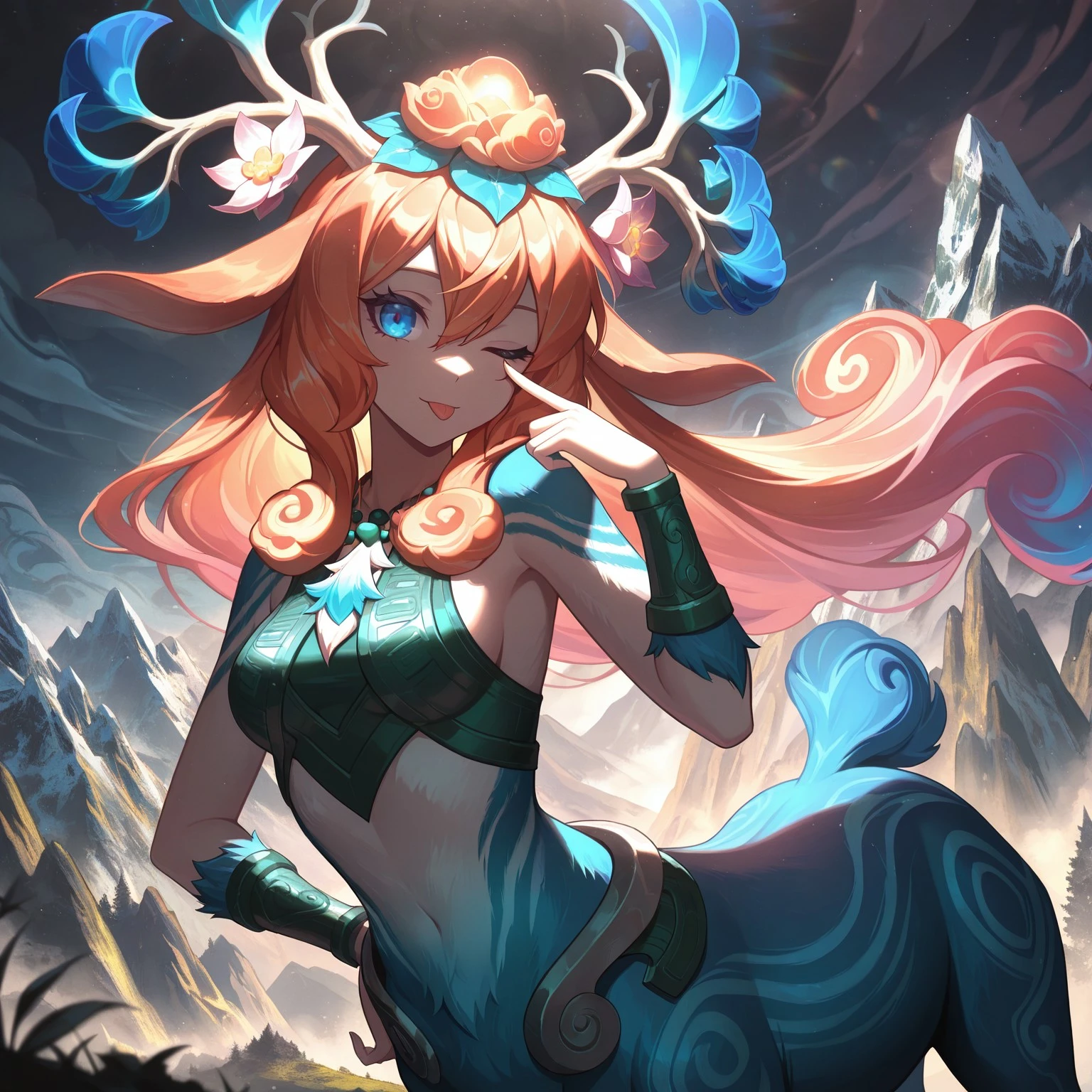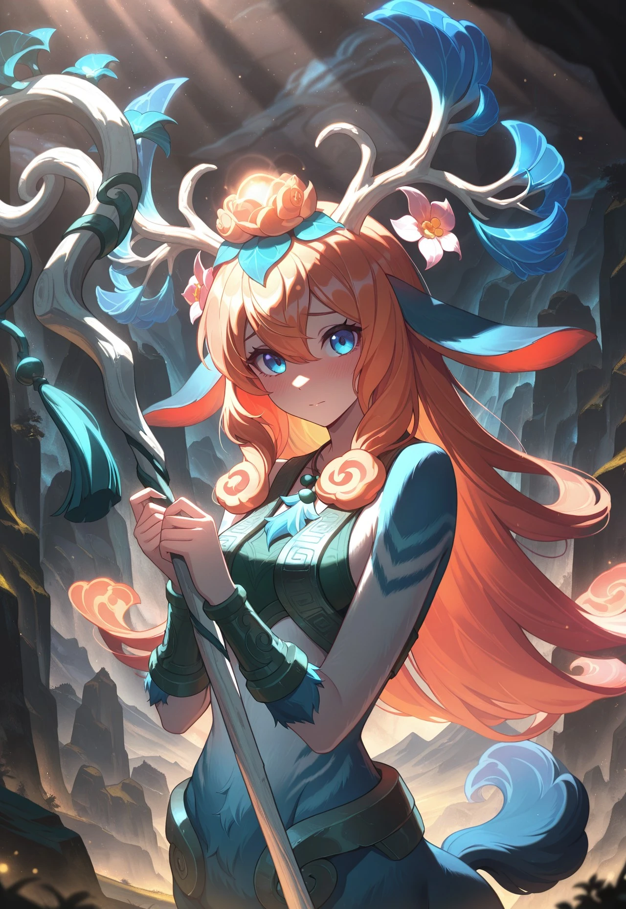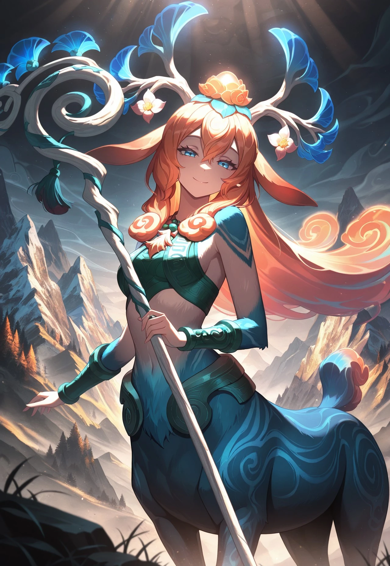 SHSlillia, centaur girl, antlers, orange hair, gradient hair, hair ornaments, hair flower, blue eyes, ceremonial clothing, tight green crop top, bare shoulders, necklace, blue fur lower body, holding staff,