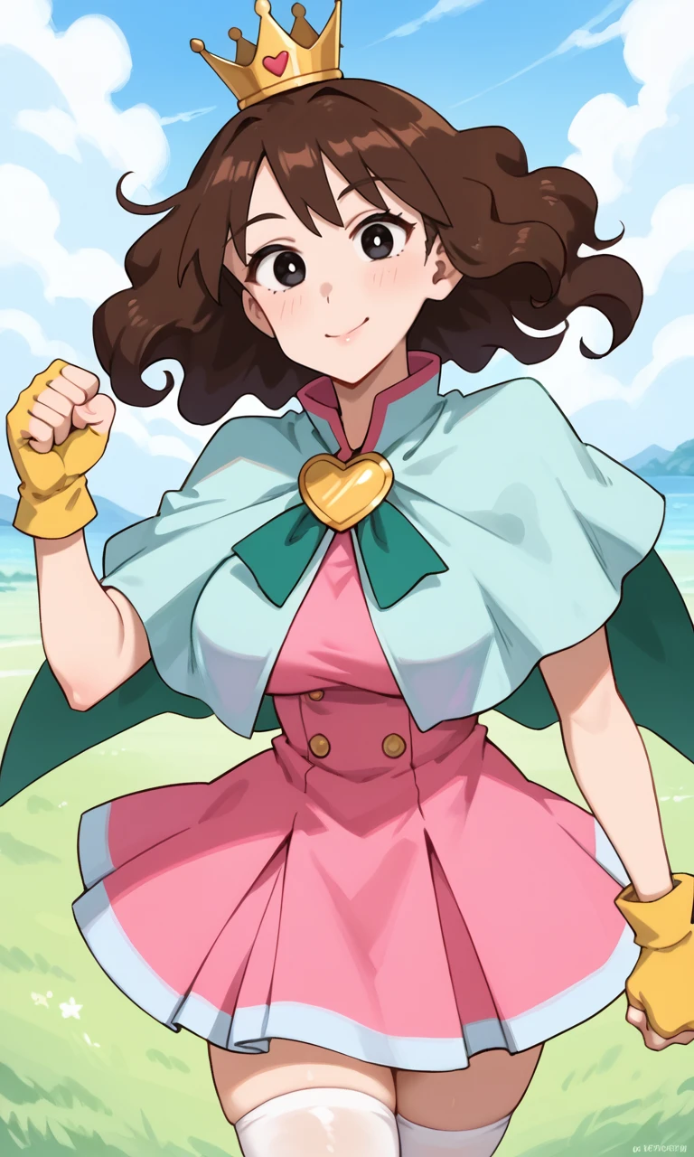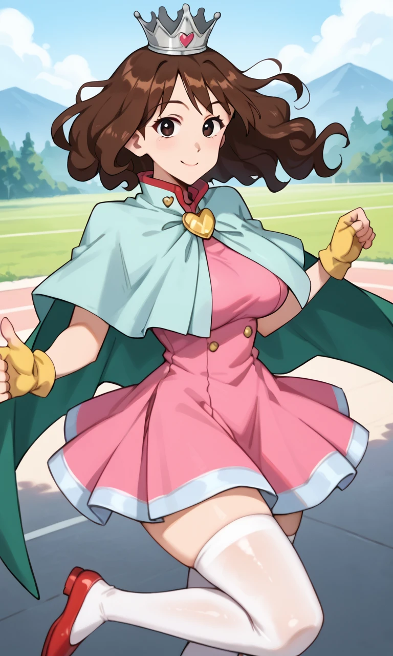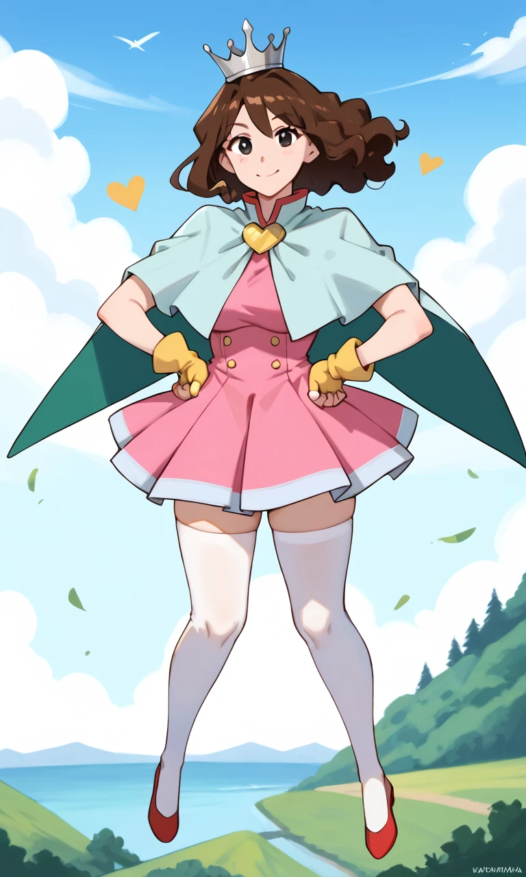 (silver crown, light blue capelet:1.3), pink dress, pleated dress, tutu, layered clothes, green capelet, green split cape, yellow heart brooch, yellow fingerless gloves, white thighhighs, red footwearMagical girl Misarin: ("The Adult Empire Strikes Back")
