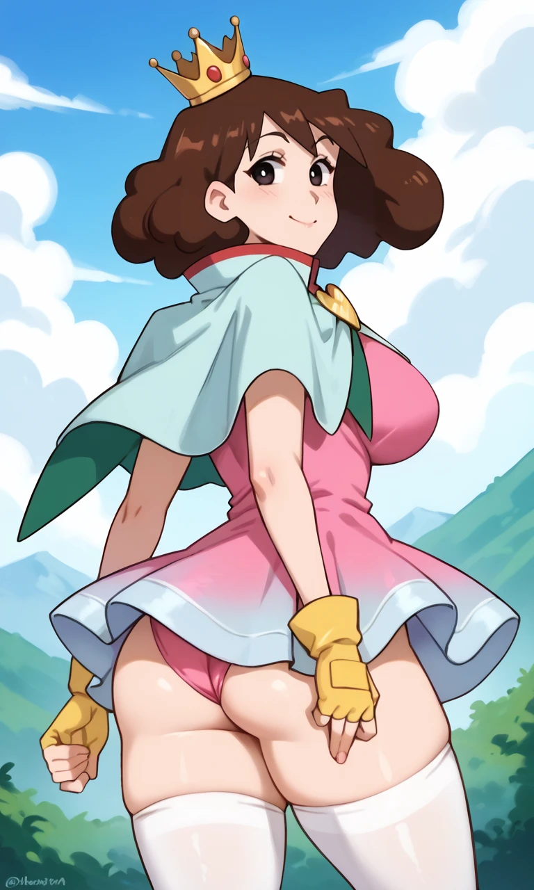 black eyes, brown hair, medium hair, curly hair, voluminous hair, fluffy hair, parody hair, large breasts, wide hips, thick thighs