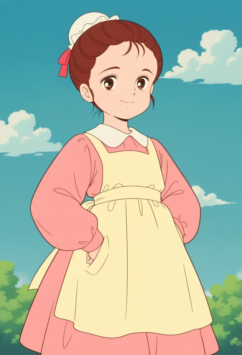 ② 1girl, cocky, bun cover, brown hair, hair bun, long sleeves, apron, dress