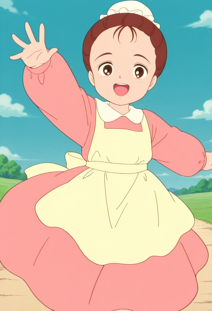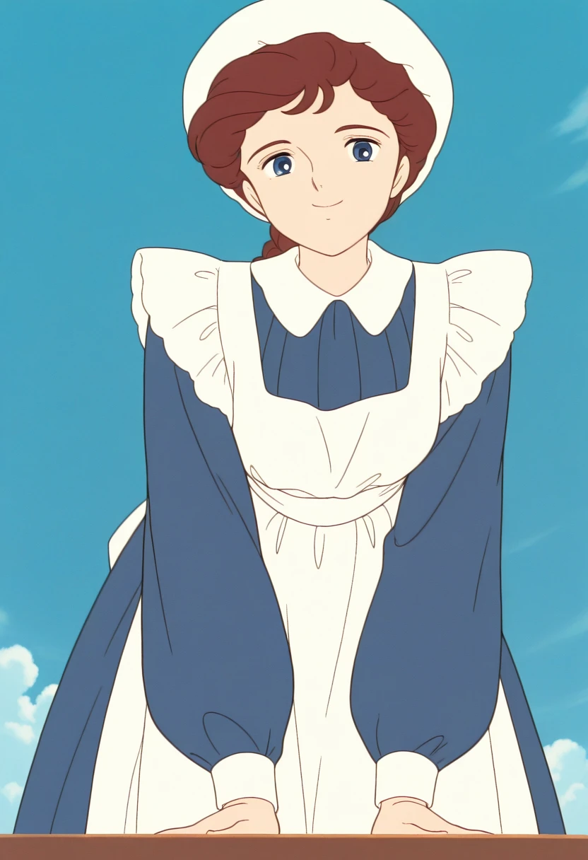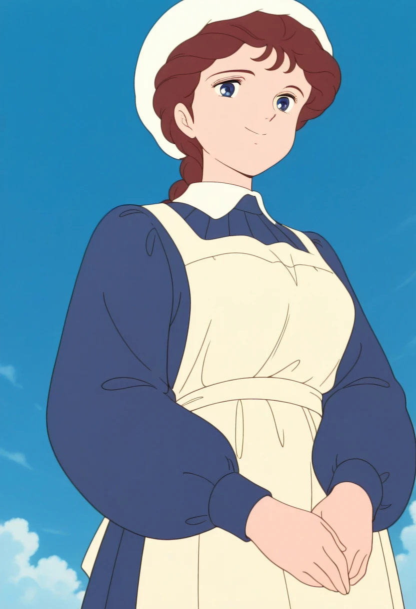 ③ 1girl, jane short, hat, brown hair, braid, apron, blue dress, long sleeves