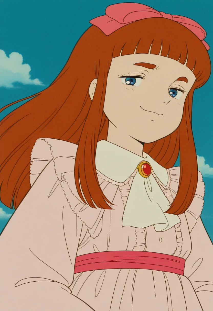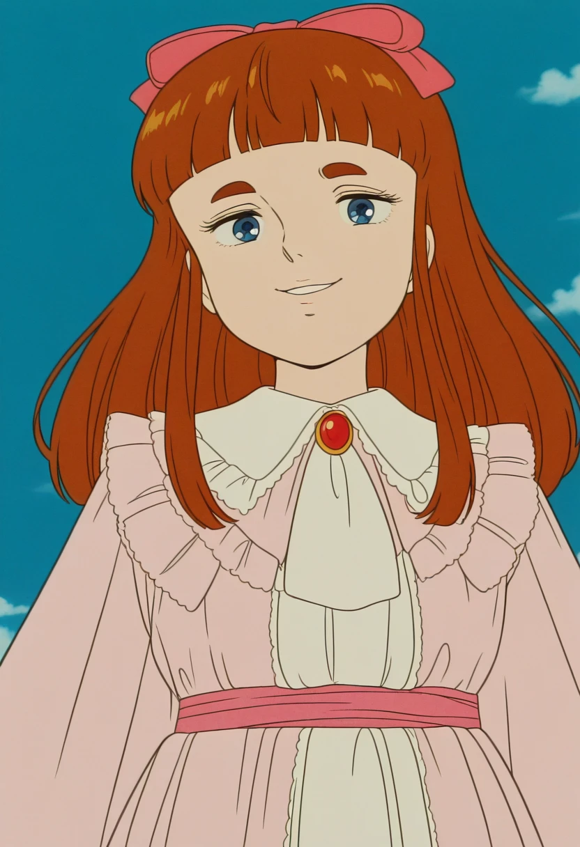 ④ 1girl, brigette, brown hair, blunt bangs, long hair, hair bow, dress, frills