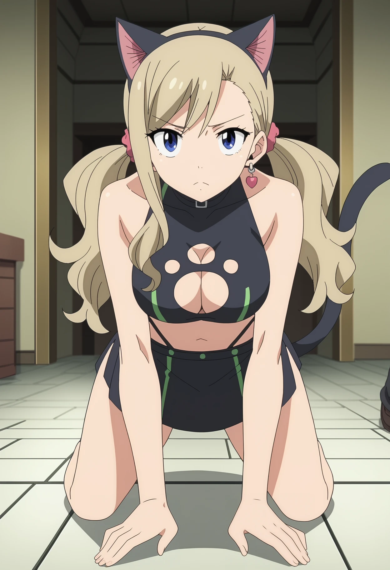 Rebecca second cat outfit | Rebecca Bluegarden, blue eyes, long hair, twintails, blonde hair, large breasts, cat ears, cat tail, skirt, cleavage cutout, earrings, jewelry, crop top