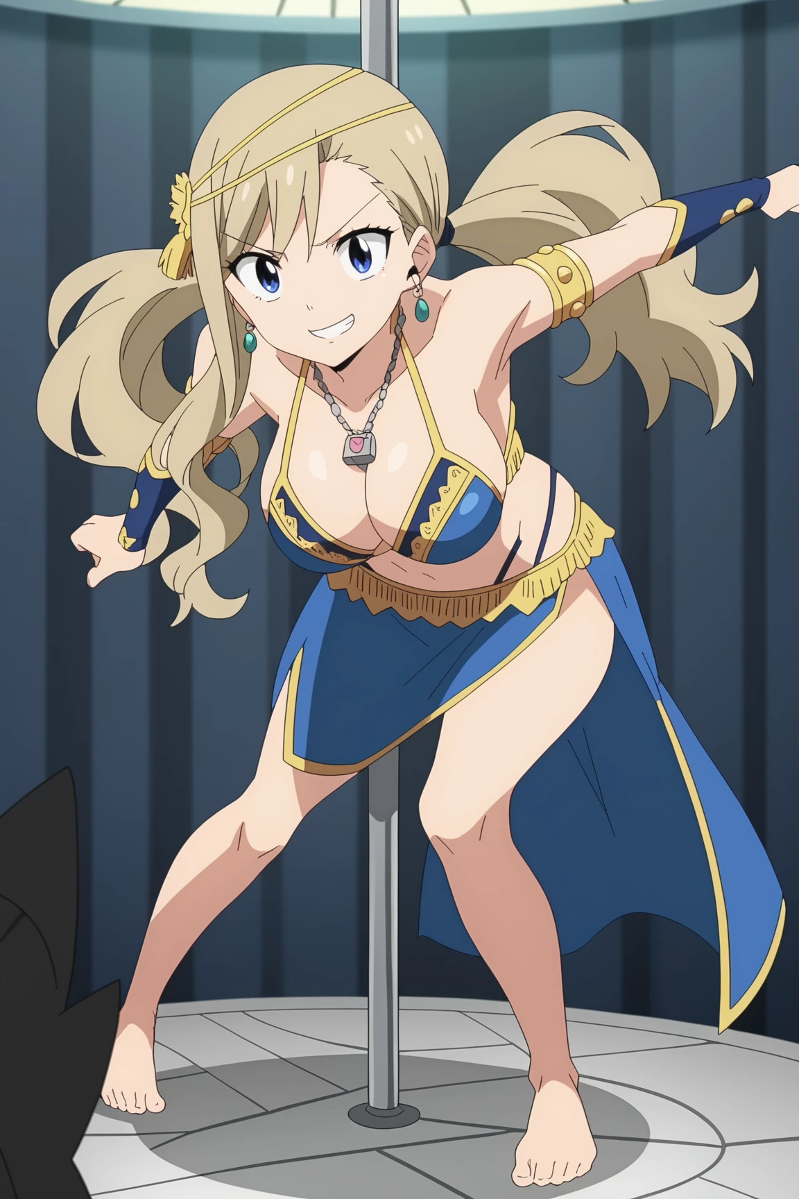 Rebecca blue and gold dancer outfit | Rebecca Bluegarden, blue eyes, long hair, twintails, blonde hair, large breasts, necklace, hair ornament, earrings, cleavage, jewelry, skirt, sandals