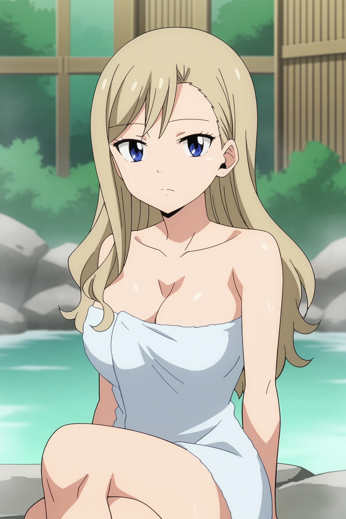 Rebecca towel outfit | Rebecca Bluegarden, blue eyes, long hair, blonde hair, large breasts, cleavage, ????? towel, barefoot