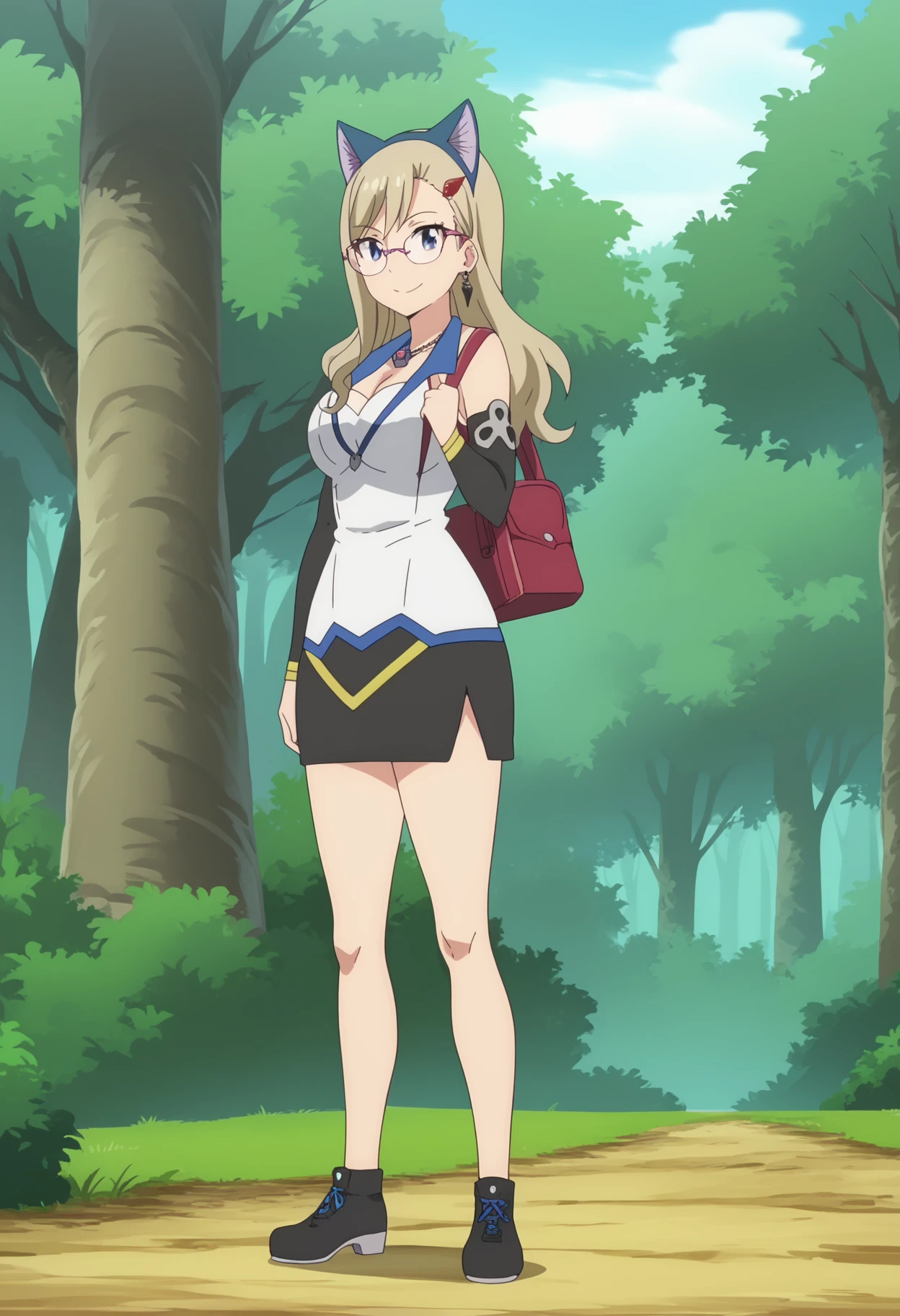 Rebecca default outfit | Rebecca Bluegarden, blue eyes, long hair, blonde hair, large breasts, jewelry, hair ornament, necklace, earrings, cleavage, skirt, boots | bag | animal ears, cat ears | glasses