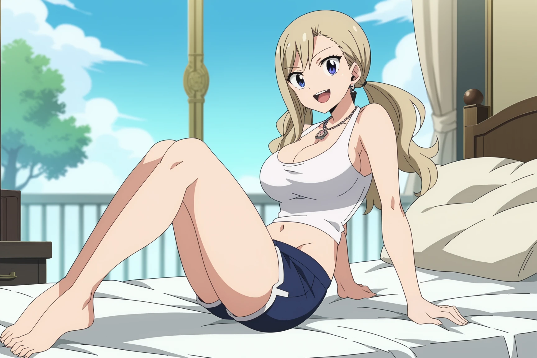 Rebecca white tanktop blue short shorts outfit | Rebecca Bluegarden, blue eyes, long hair, blonde hair, large breasts, sleeveless, cleavage, jewelry, necklace, tanktop, short shorts, navel, earrings | twintails