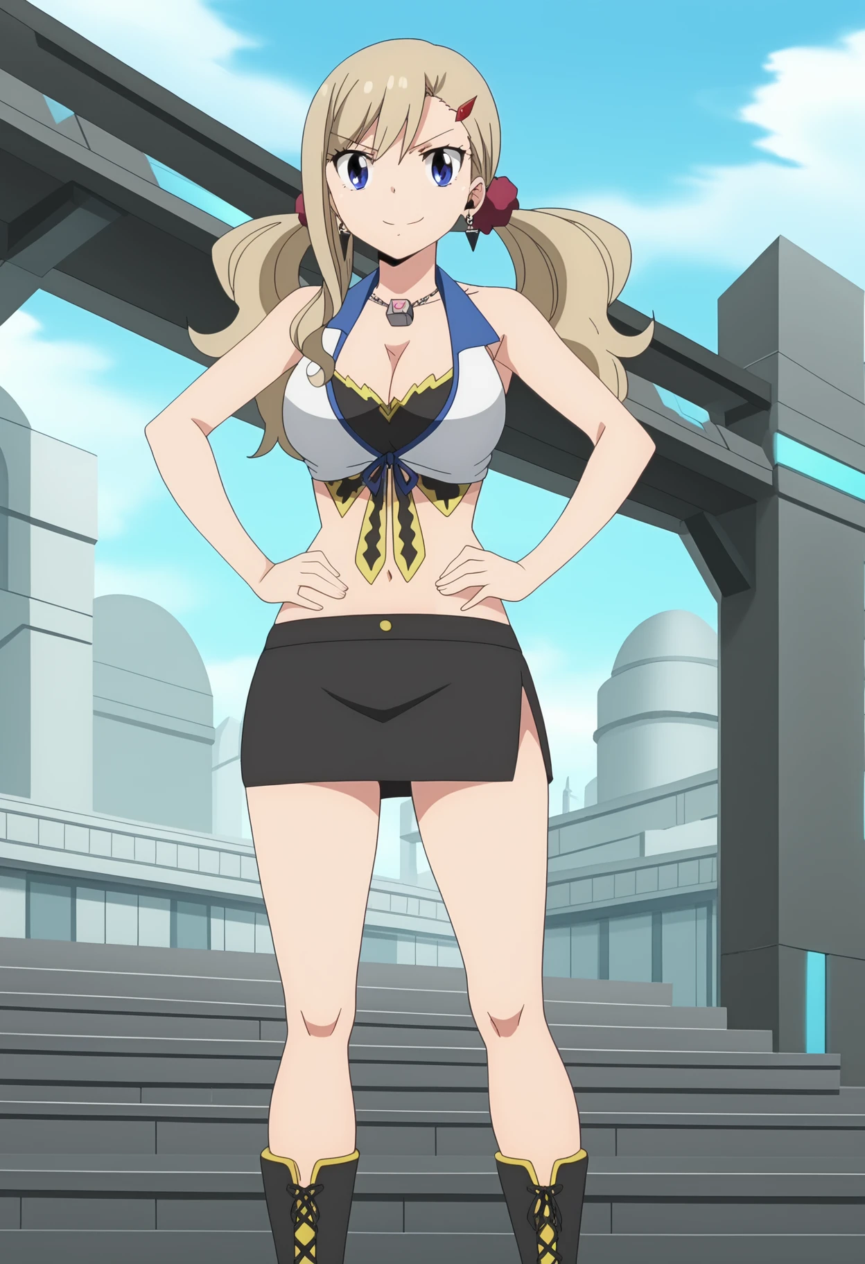 Rebecca default outfit with midriff outfit | | Rebecca Bluegarden, blue eyes, long hair, twintails, blonde hair, large breasts, jewelry, hair ornament, necklace, earrings, cleavage, skirt, boots, bare shoulders, navel