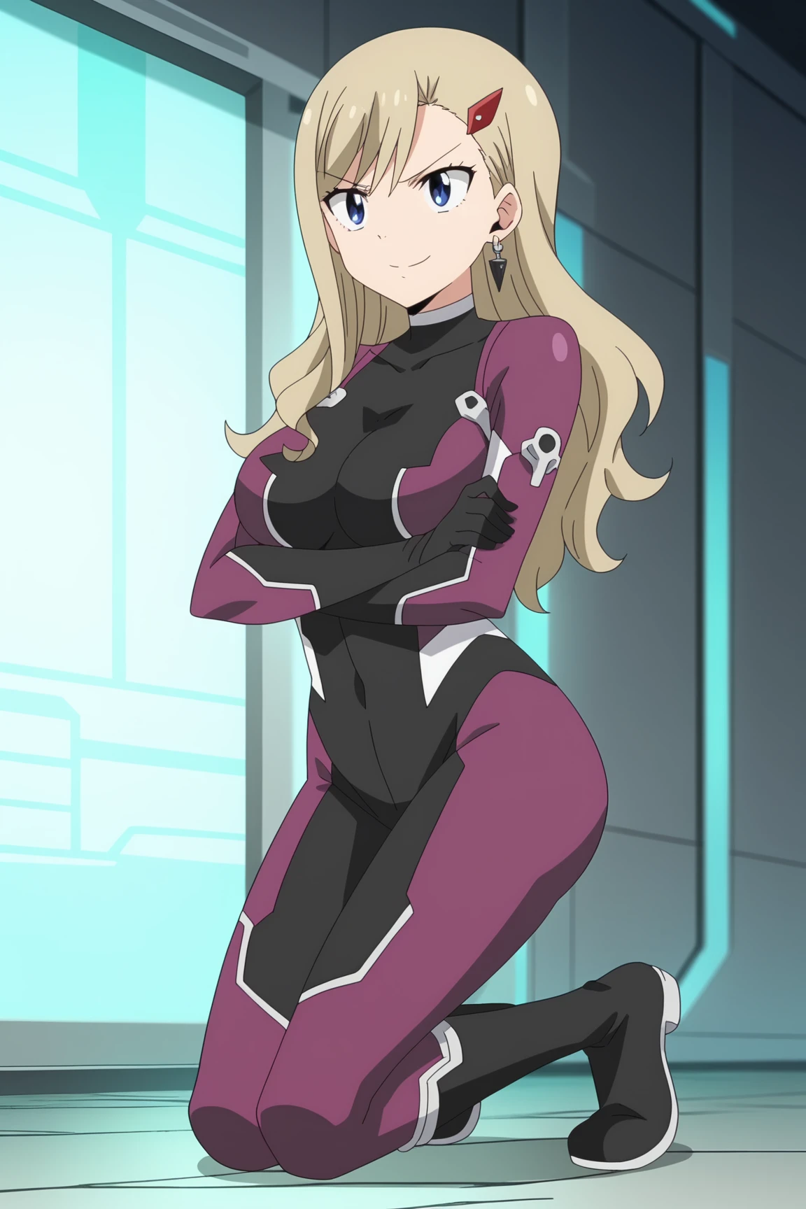 Rebecca black and fuchsia outfit | Rebecca Bluegarden, blue eyes long hair, blonde hair, large breasts, bodysuit, hair ornament, earrings