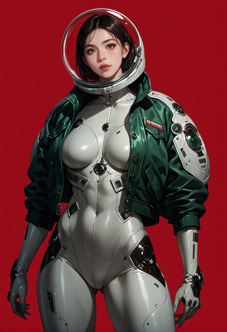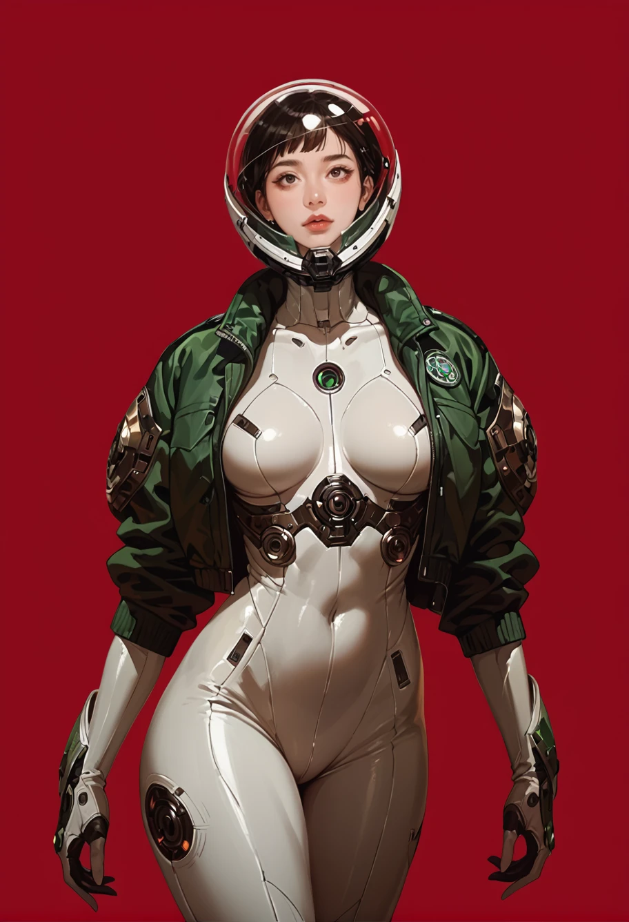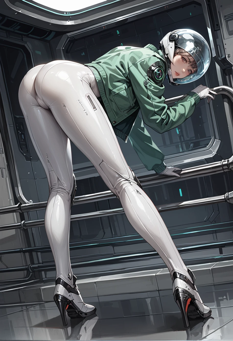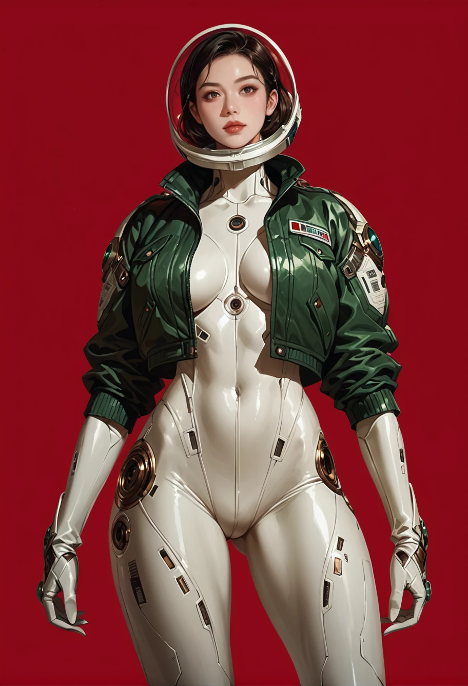 ruanyi0812,white bodysuit,skin tight,science fiction,green jacket,open jacket,glass helmet
