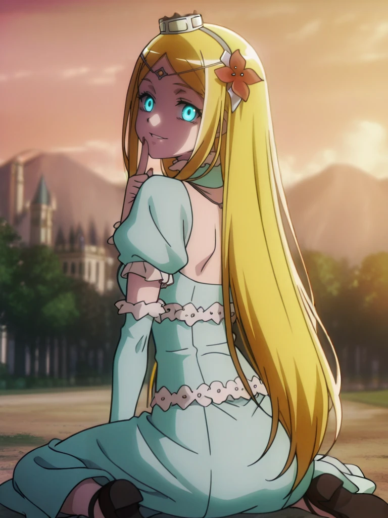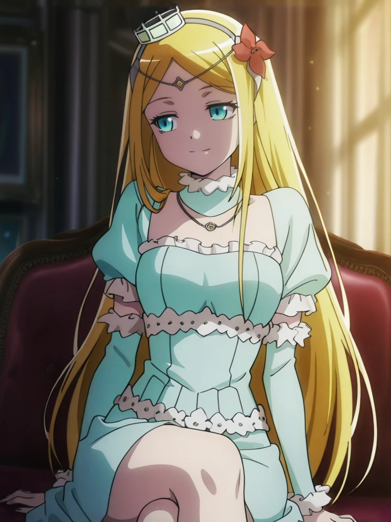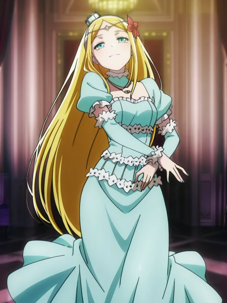 rennerTheiereDress, crown hairband, hair flower, circlet, hair ornament,jewelry, necklace,detached collar, aqua puffy short sleeves, aqua arm warmers,white footwear