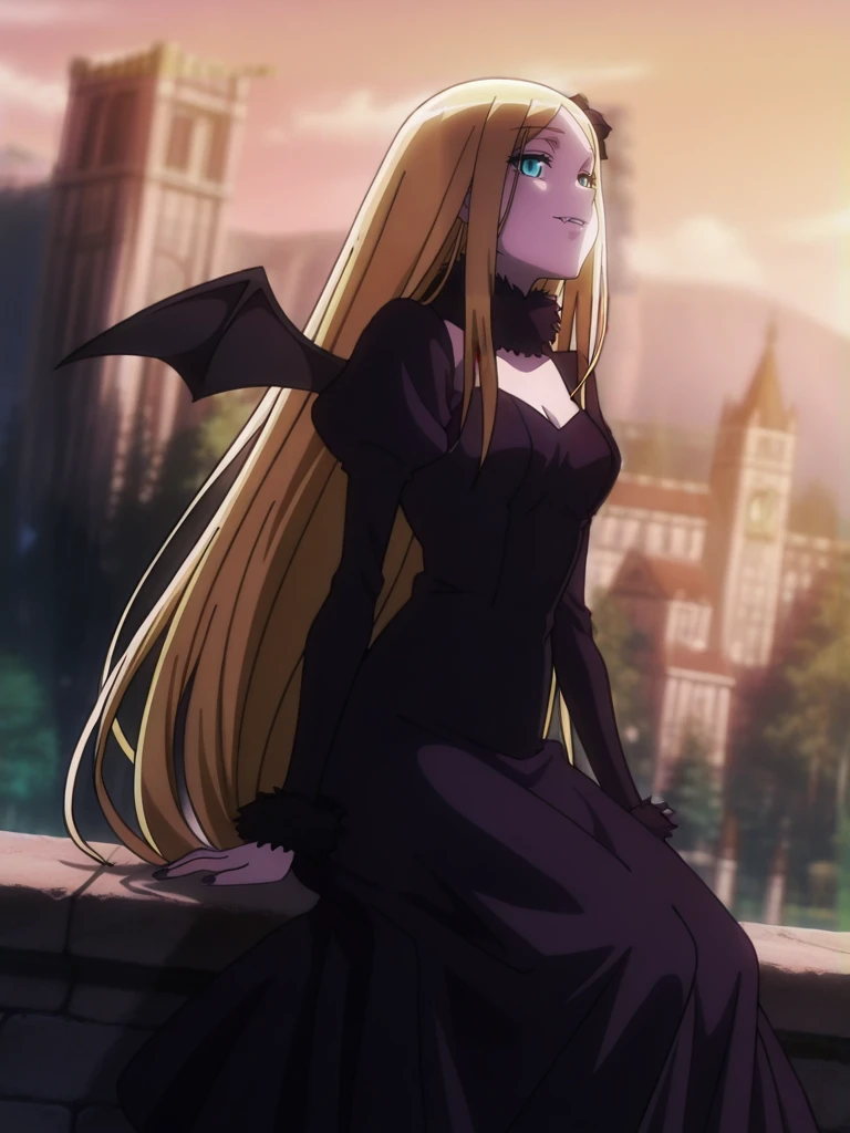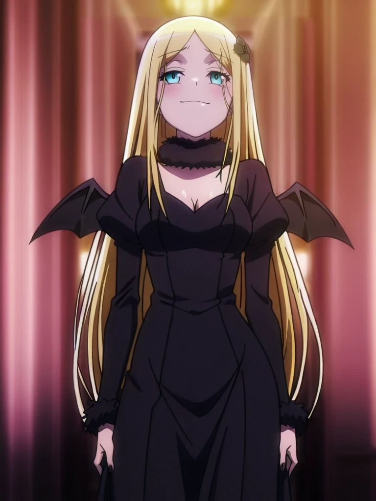 impRennerDress,black fur collar,black hair flower, bat wings, cleavage, black puffy sleeves, black shoes