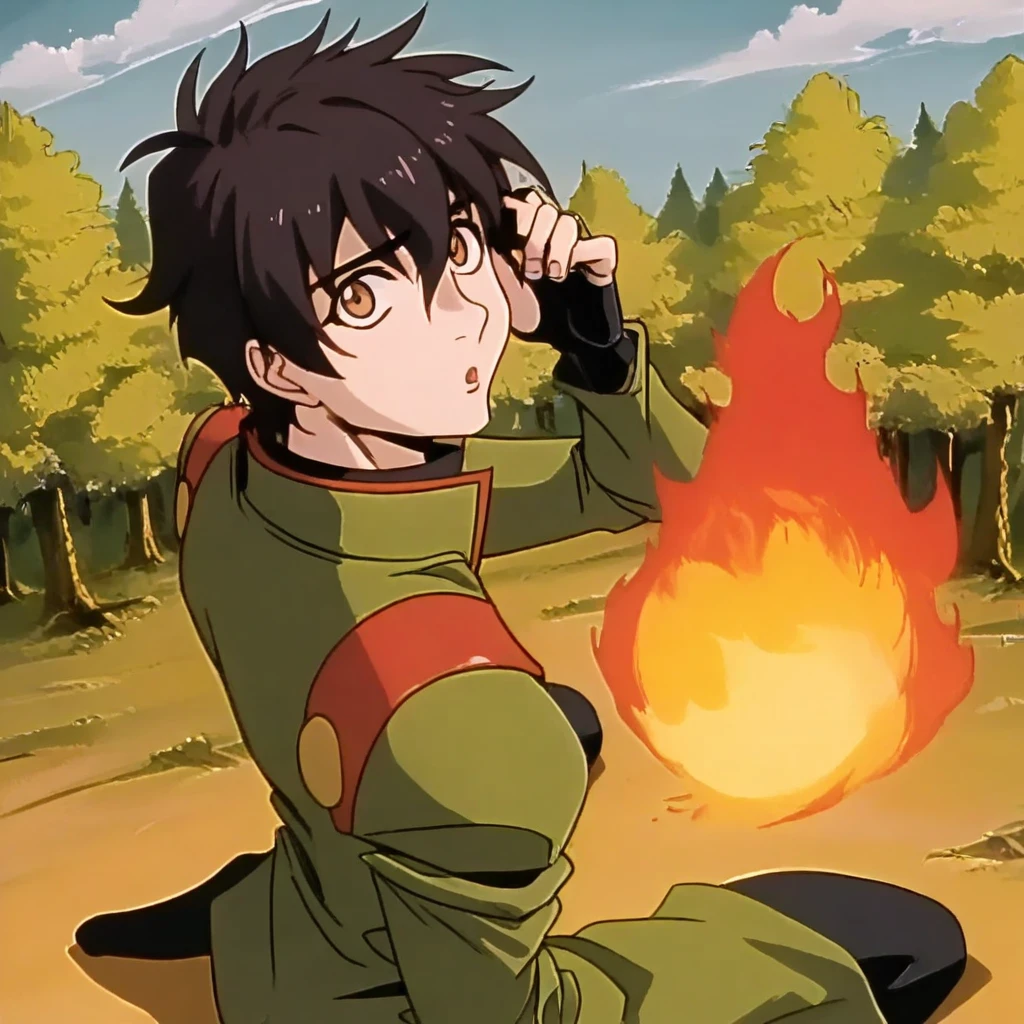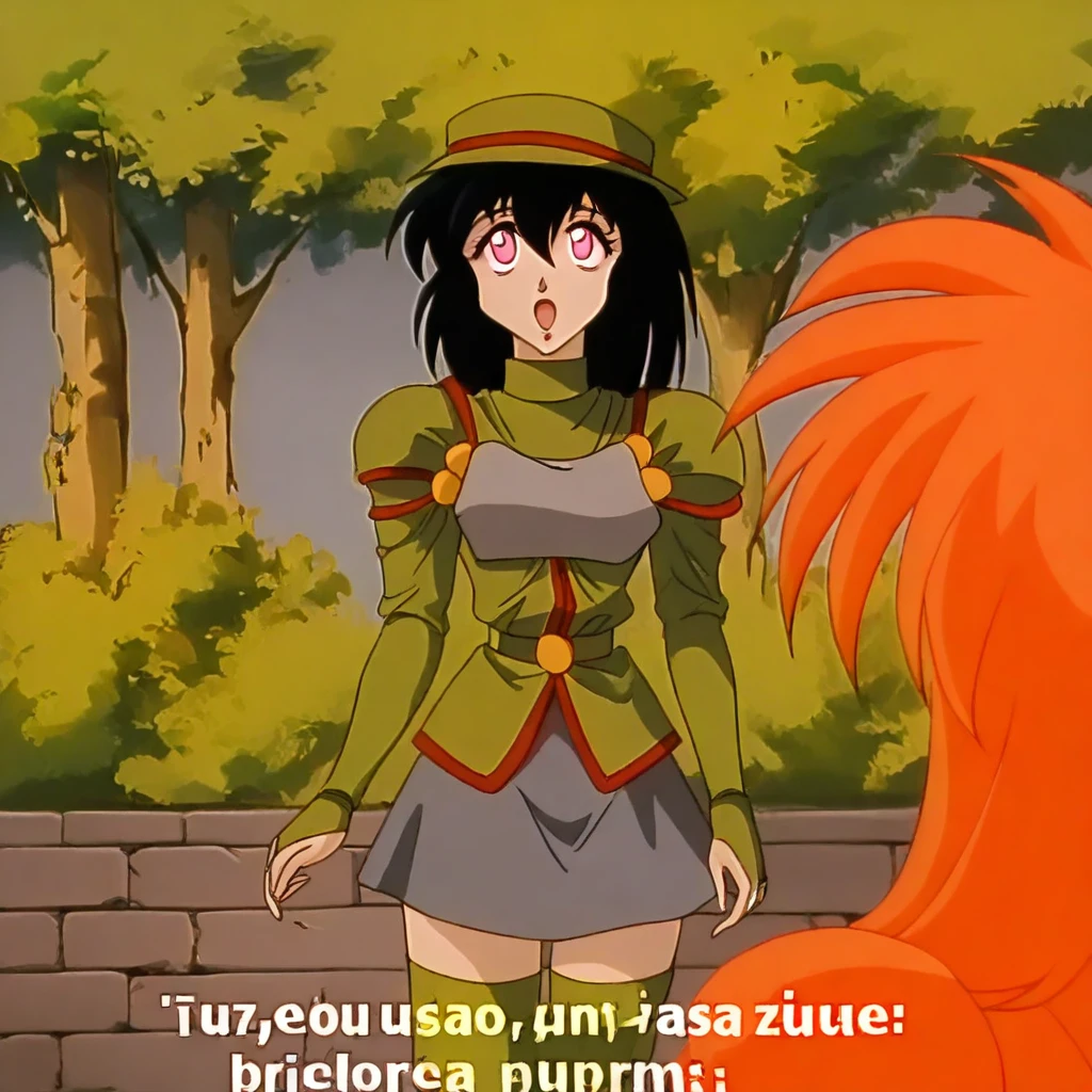Kyuo Lyu, 1girl, solo, red hair, pink hair, short hair, purple eyes, pink eyes, hat, green hat, hat feather, green jacket, armor, dark cyan blue shirt, bridal gauntlets, polearm, grey skirt, thigh boots,