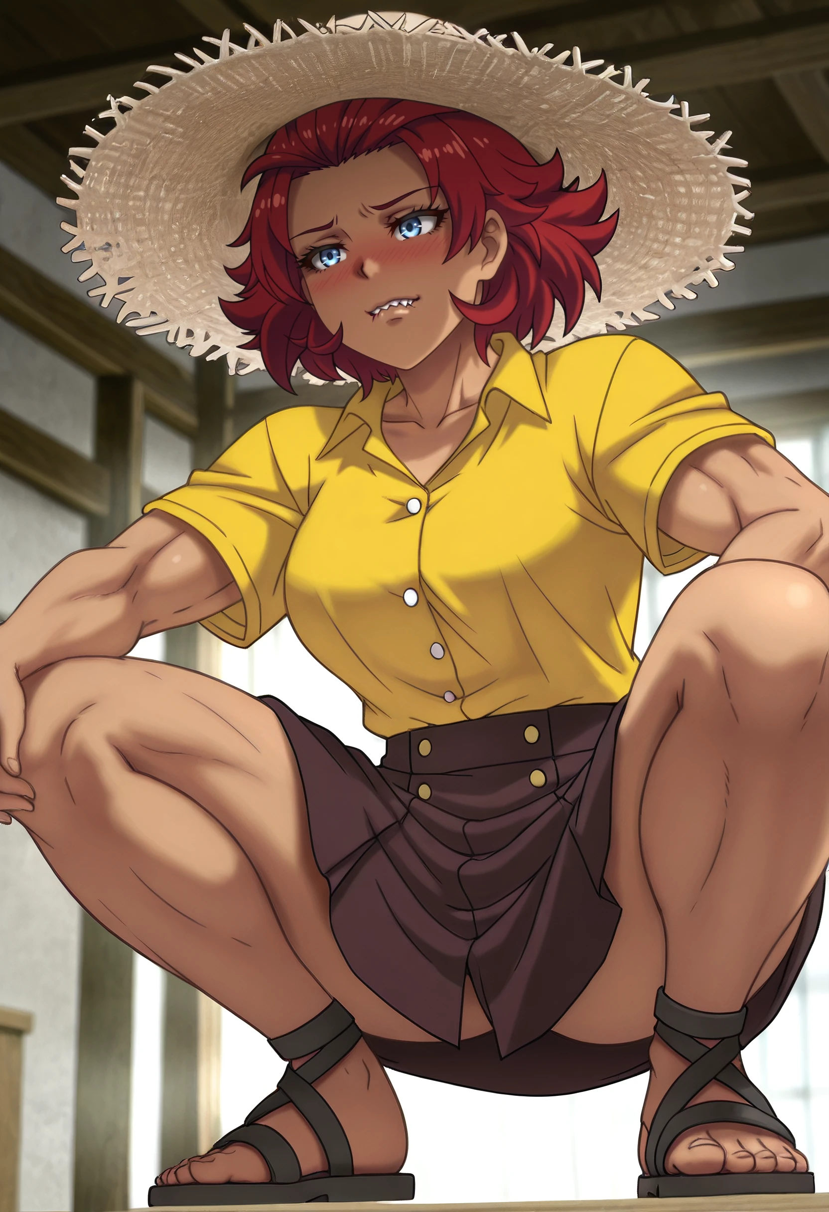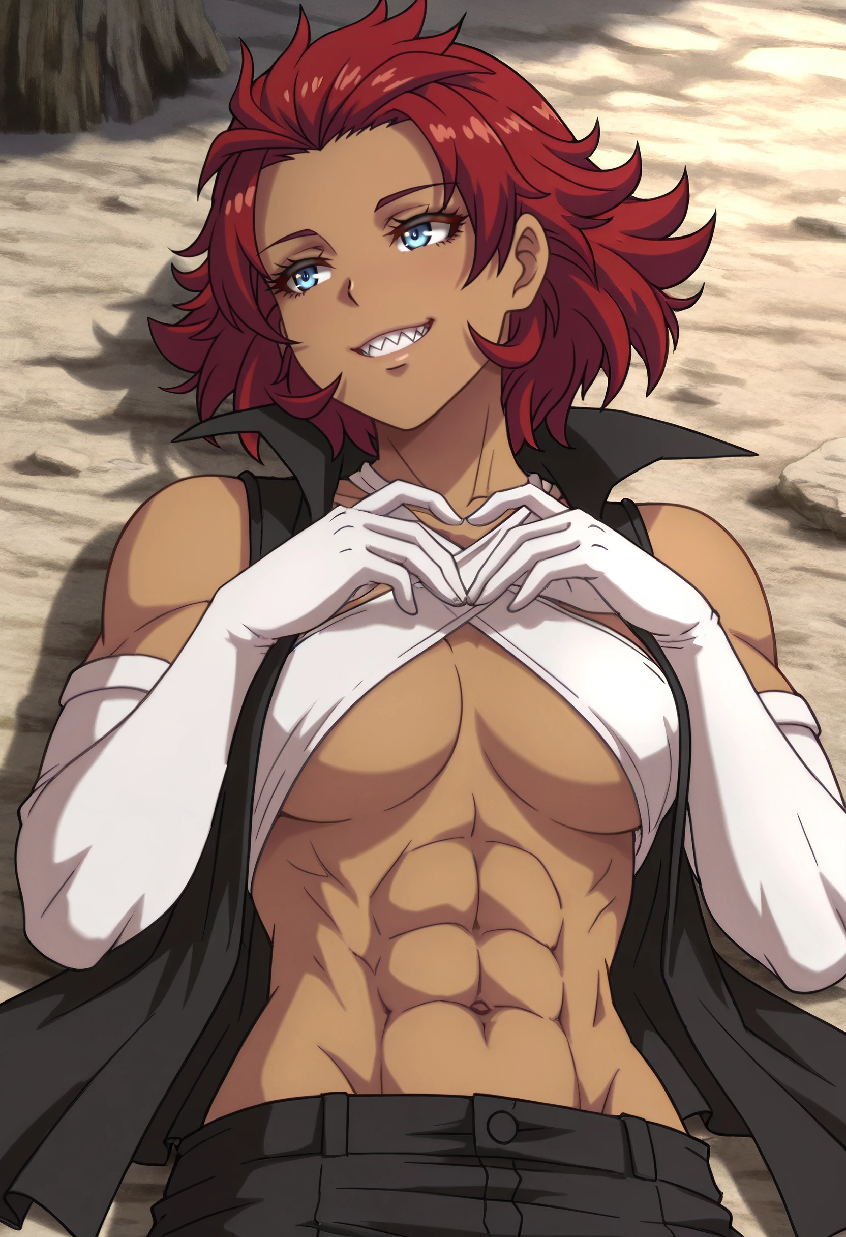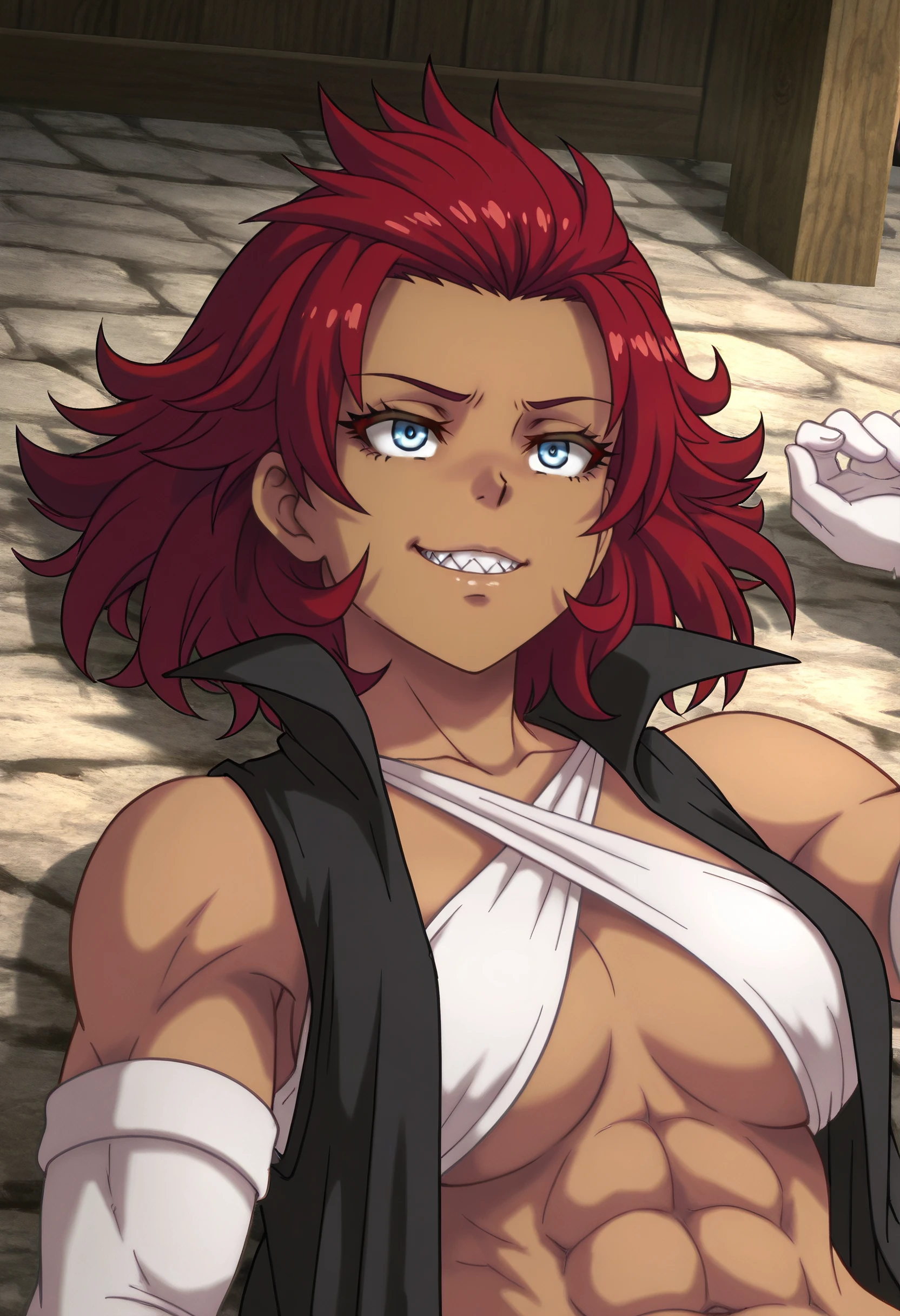 TNSLayla, blue eyes, red hair, short hair, dark skin, dark-skinned female, spiked hair, sharp teeth, muscular female,