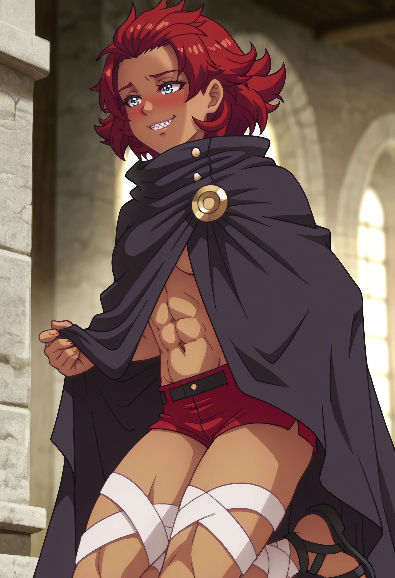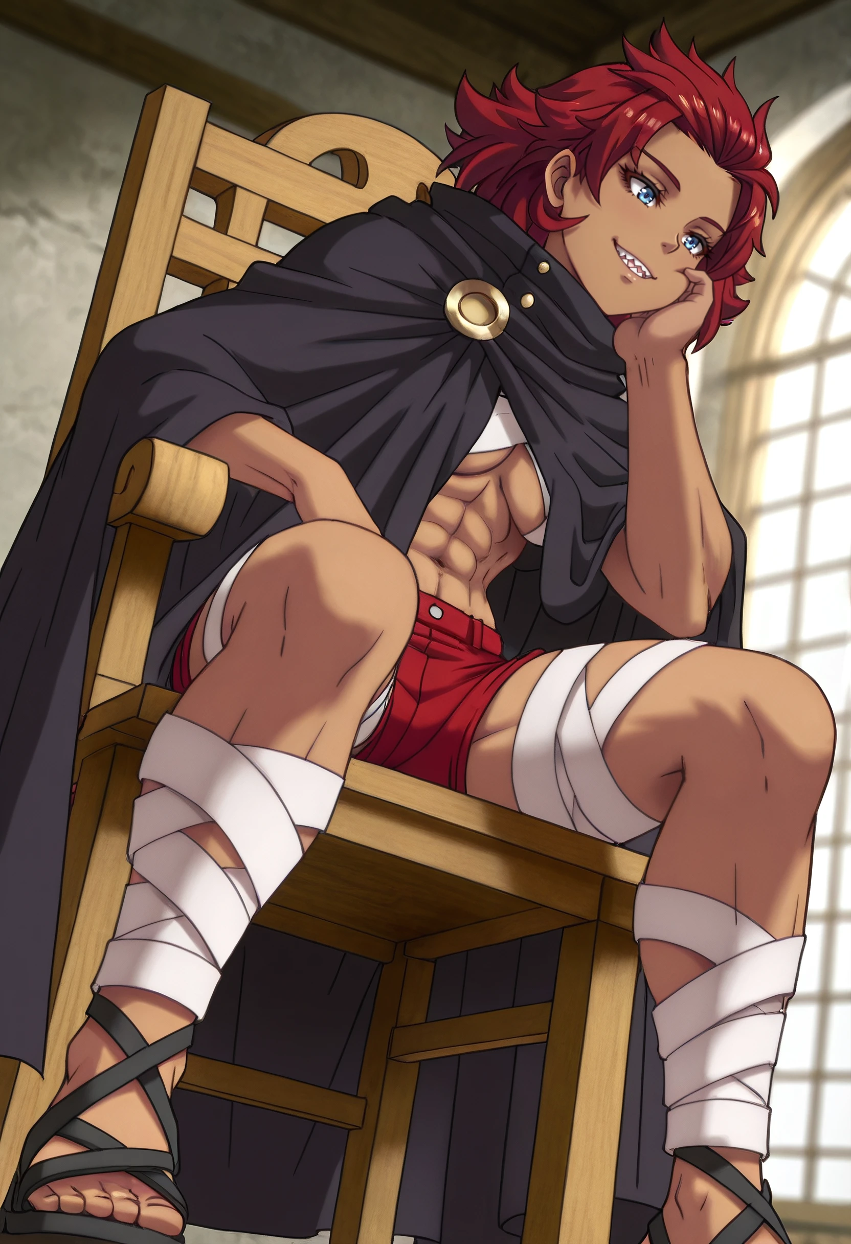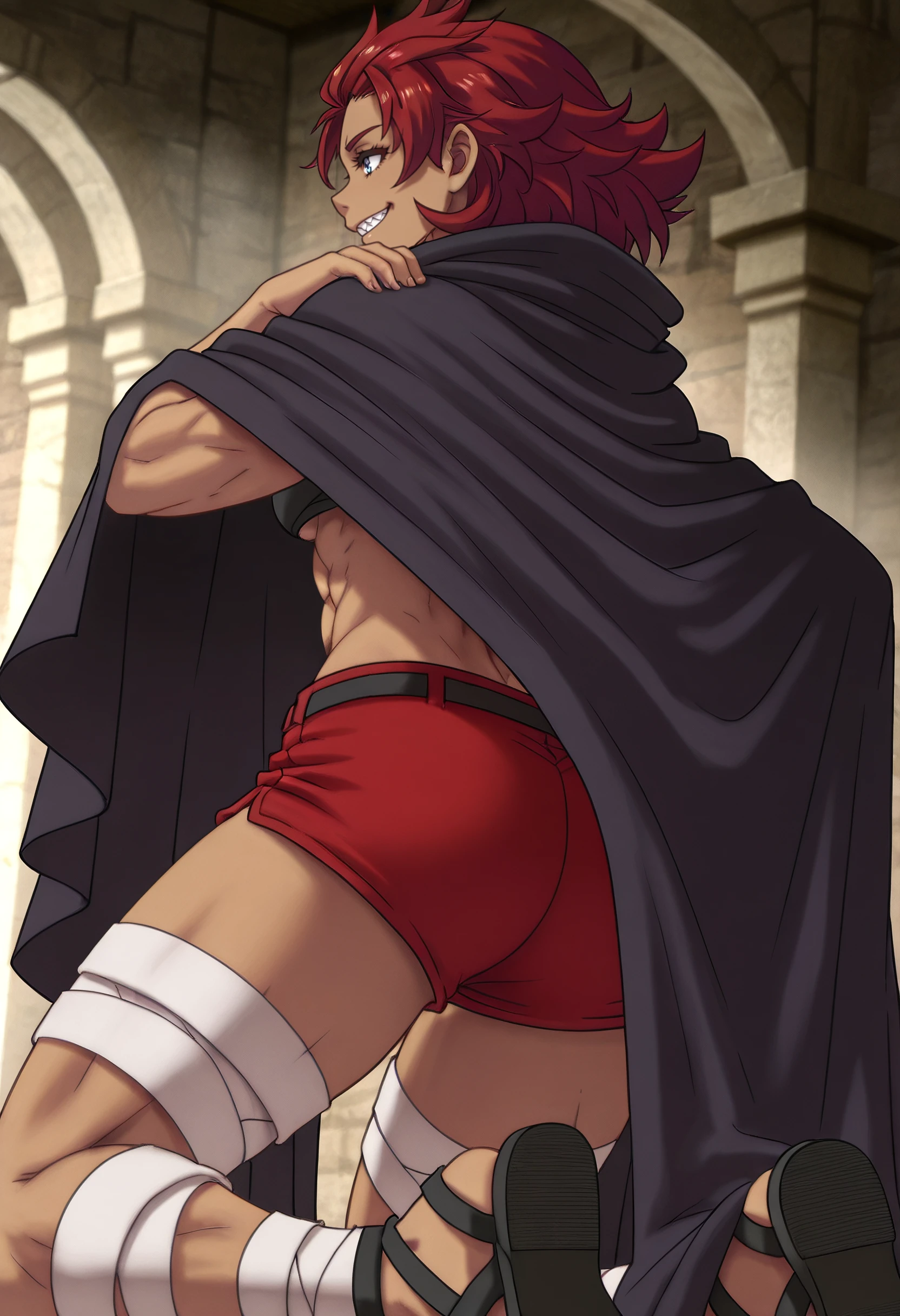 LaylaCoat, cloak, cape, shorts, red shorts, navel, bandages, short shorts, abs, bandaged leg, black cloak, sandals, gladiator sandals, ankle wrap, black footwear,