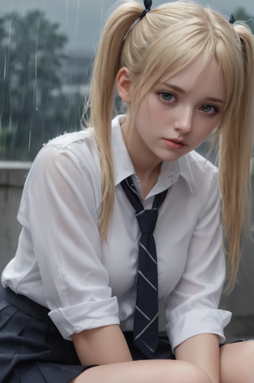 doamarierose, blond hair twin tails, bangs, dark navy eyes, seifuku, white shirt, loose necktie