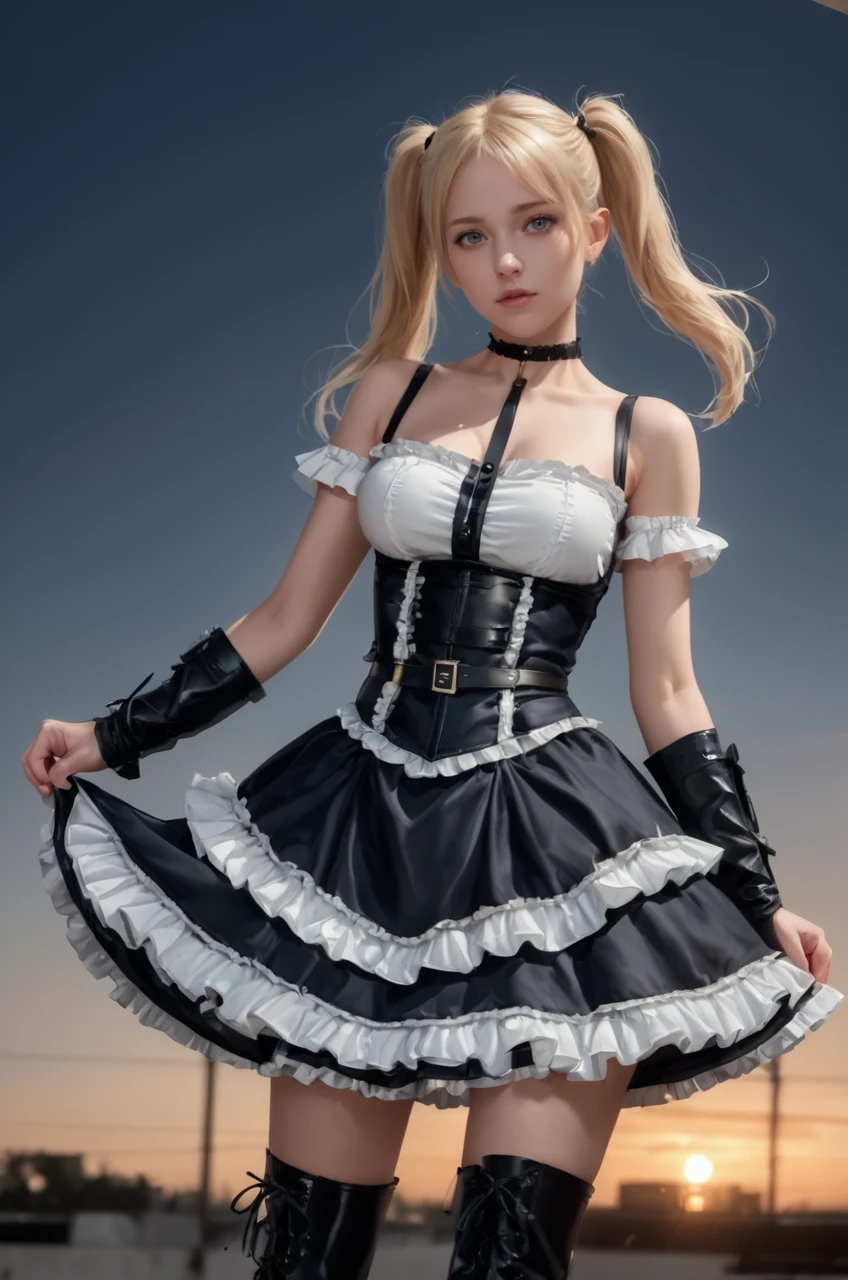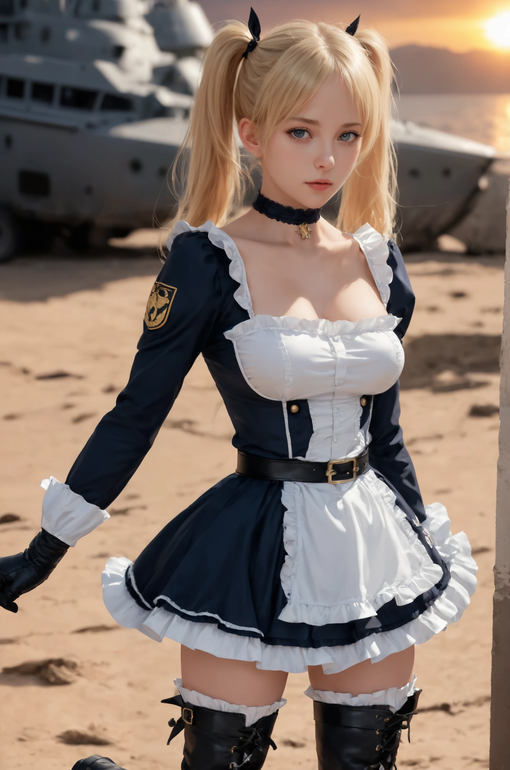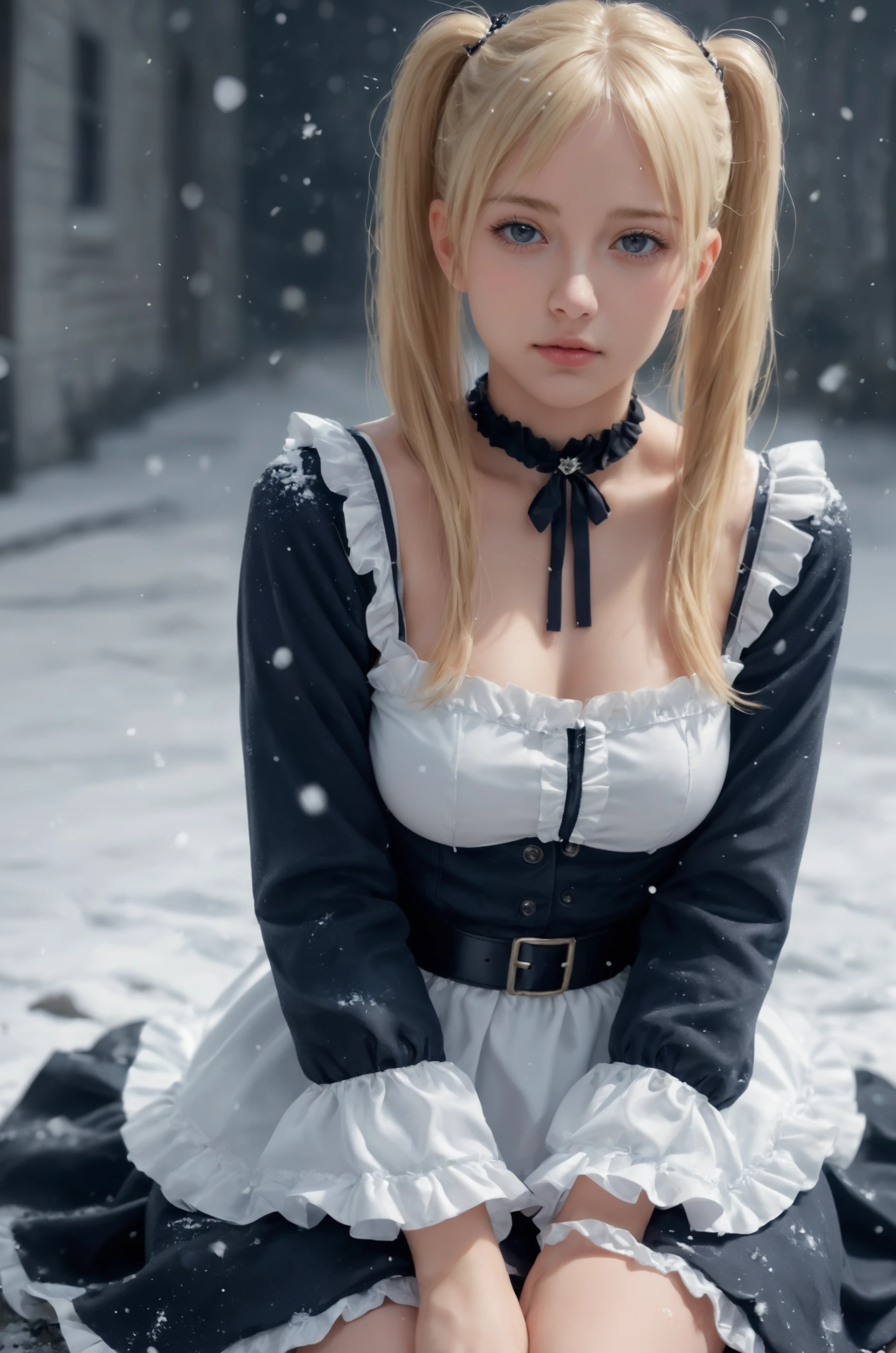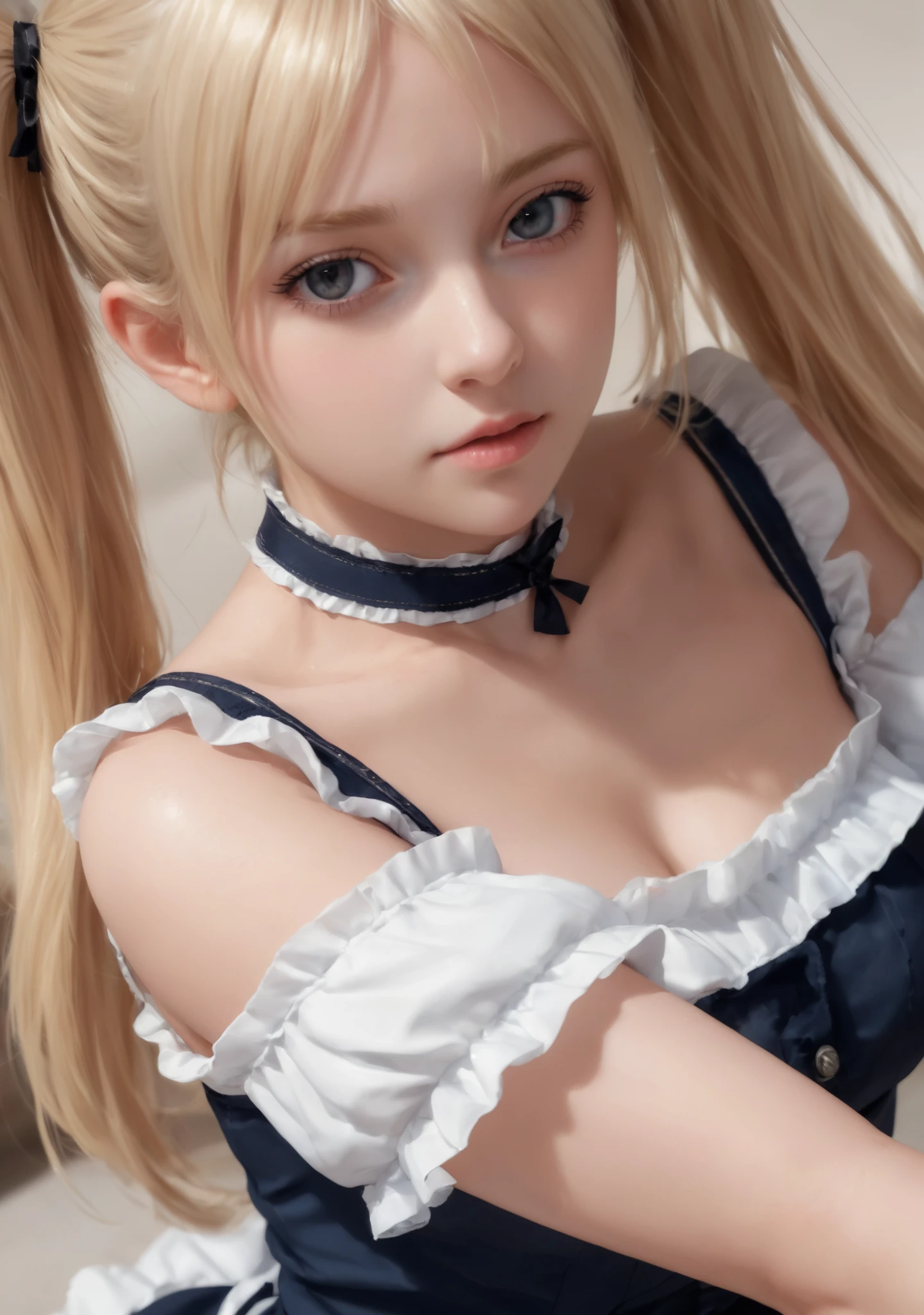 doamarierose, blond hair twin tails, bangs, dark navy eyes, frilled dress, neck choker