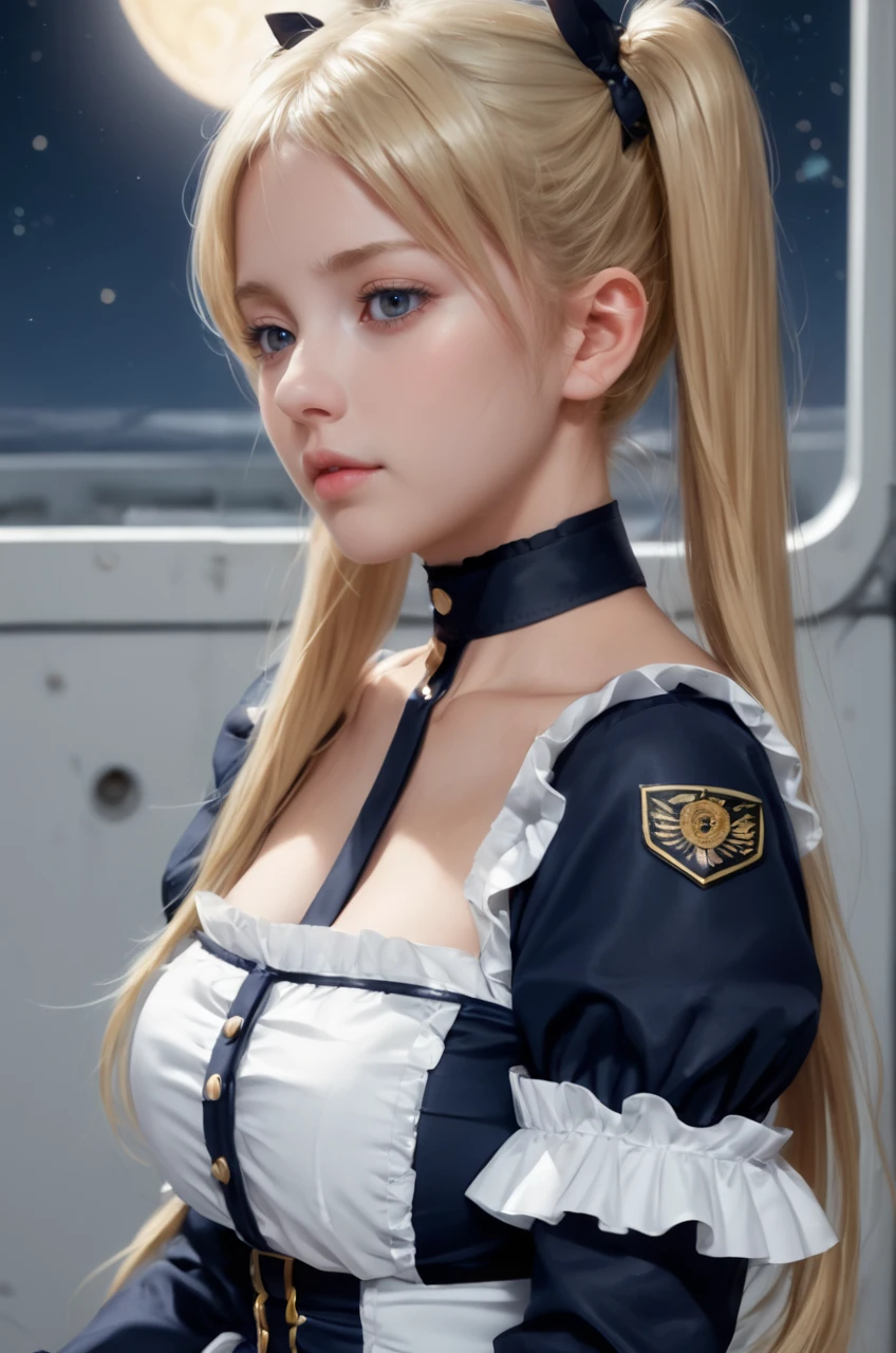 doamarierose, blond hair twin tails, bangs, dark navy eyes, default costume
