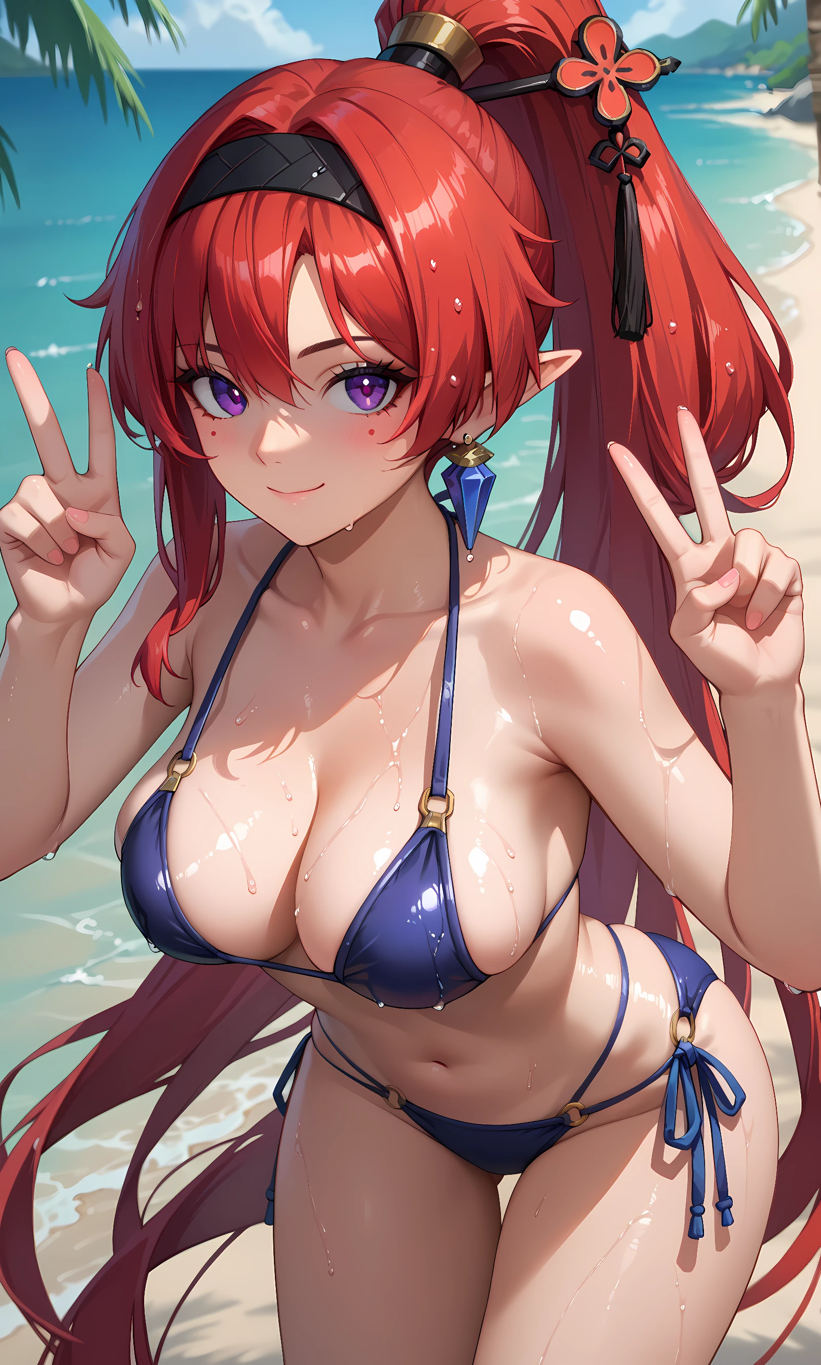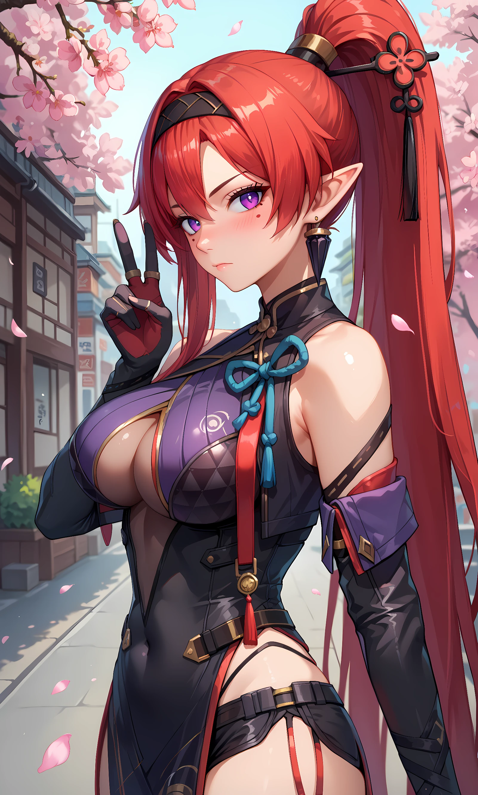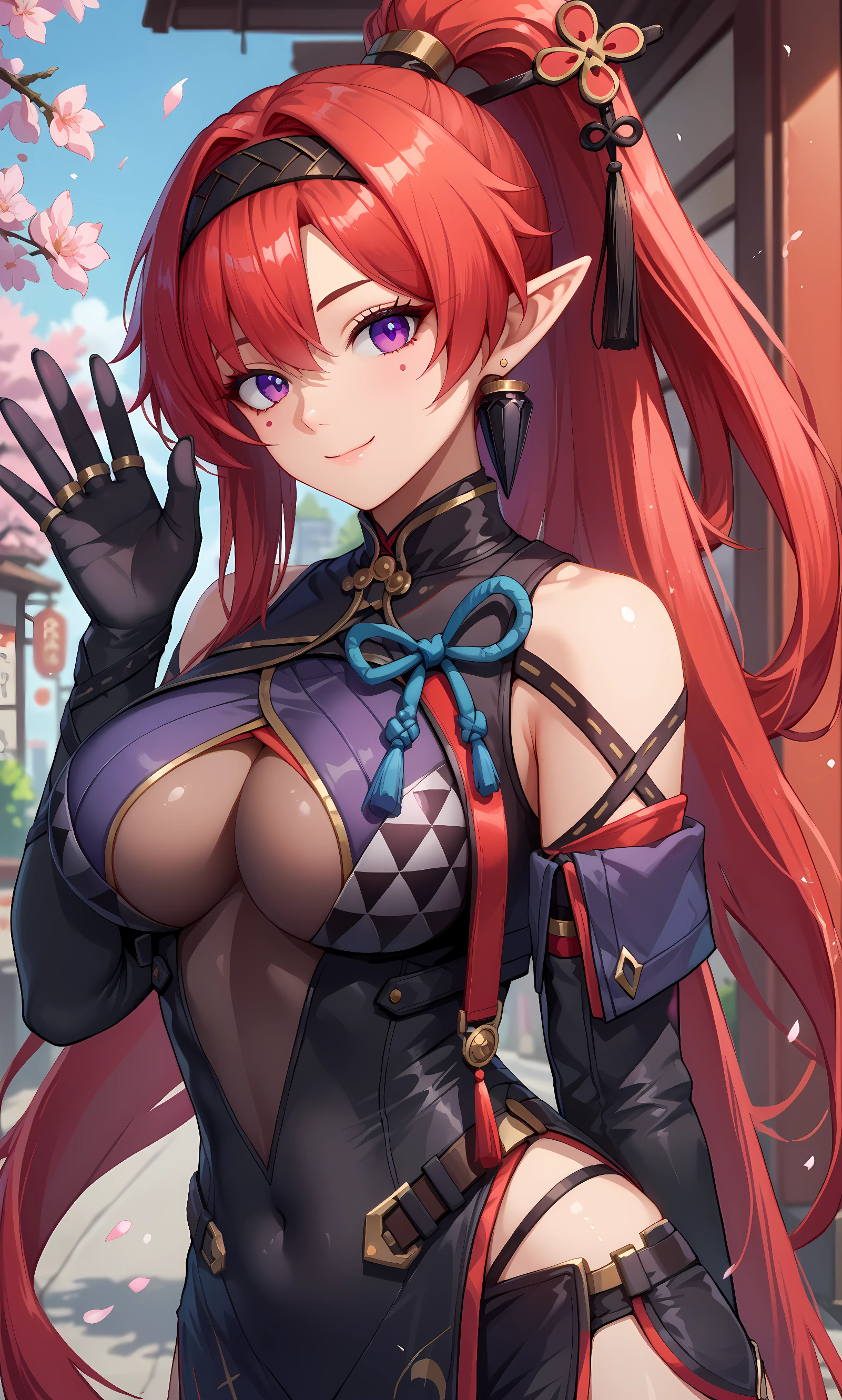 yinlin, purple eyes, pointy ears, red hair, absurdly long hair, high ponytail, hairband, hairpin, tassel, earring, mole, mole under eyes, katsuyamamage