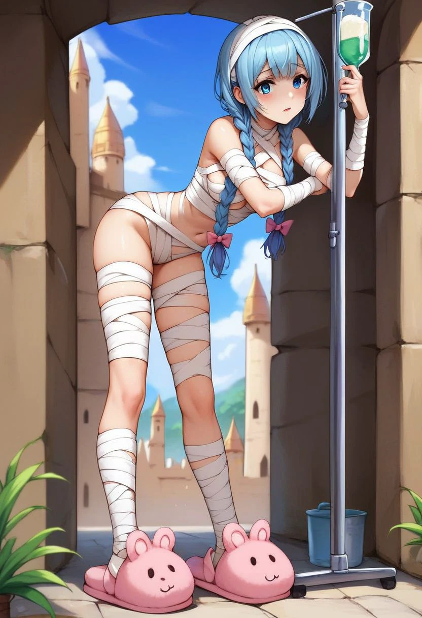 light blue hair, twin braids, pink bow, blue eyes, bangs, weak, frail, pale face,