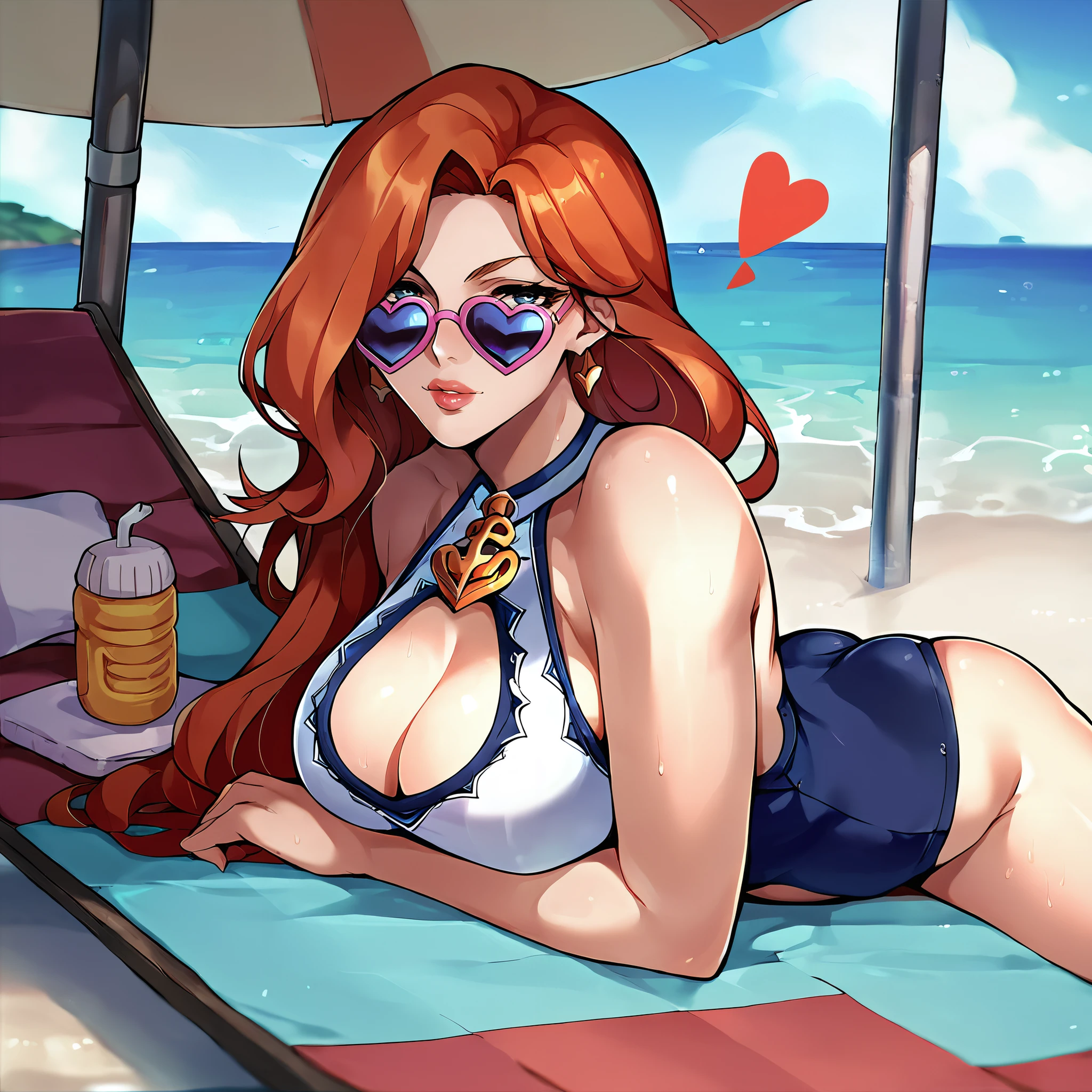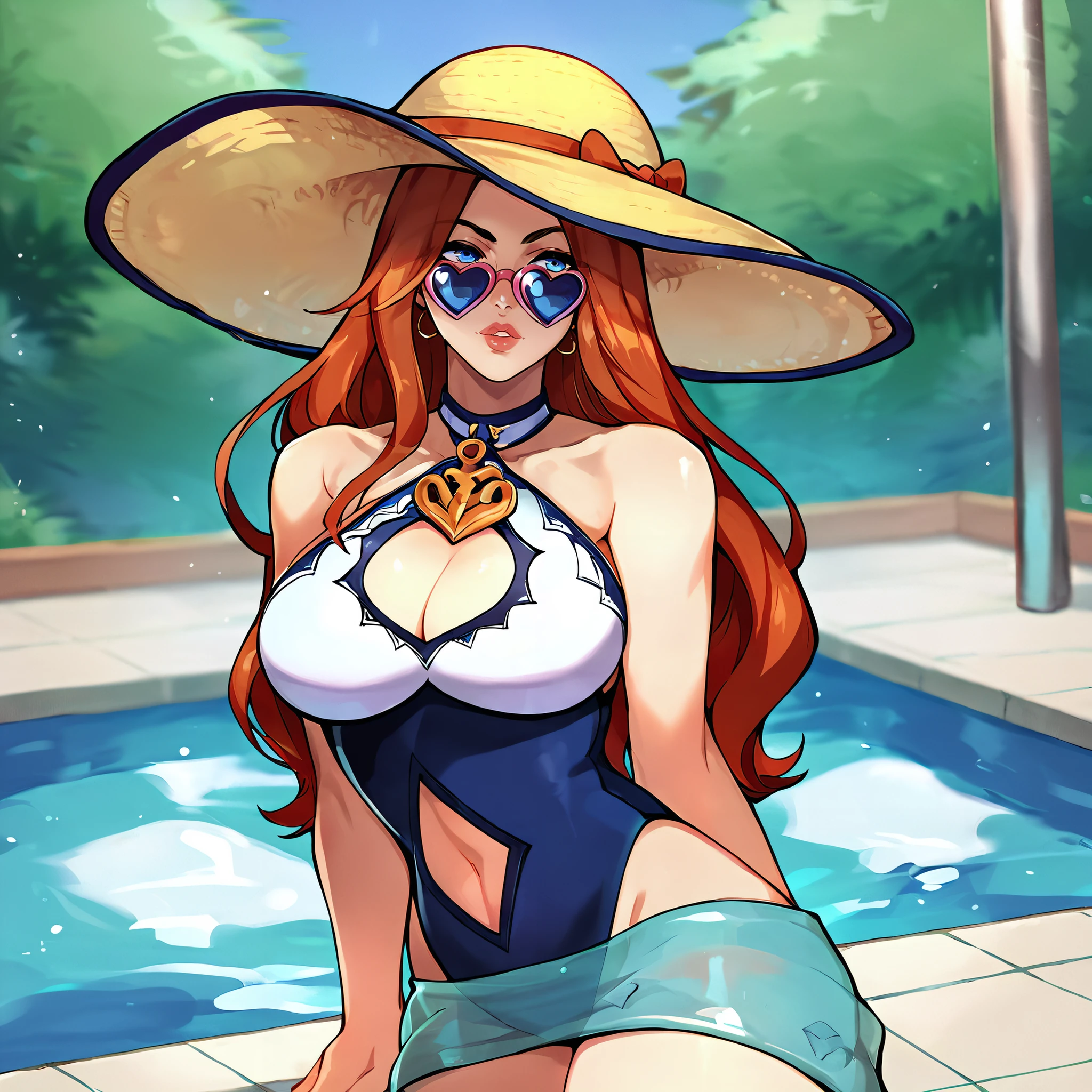 mfppxl, jewelry, one-piece swimsuit, clothing cutout, cleavage cutout, heart-shaped eyewear, looking over eyewear, sun hat, lips, navel
