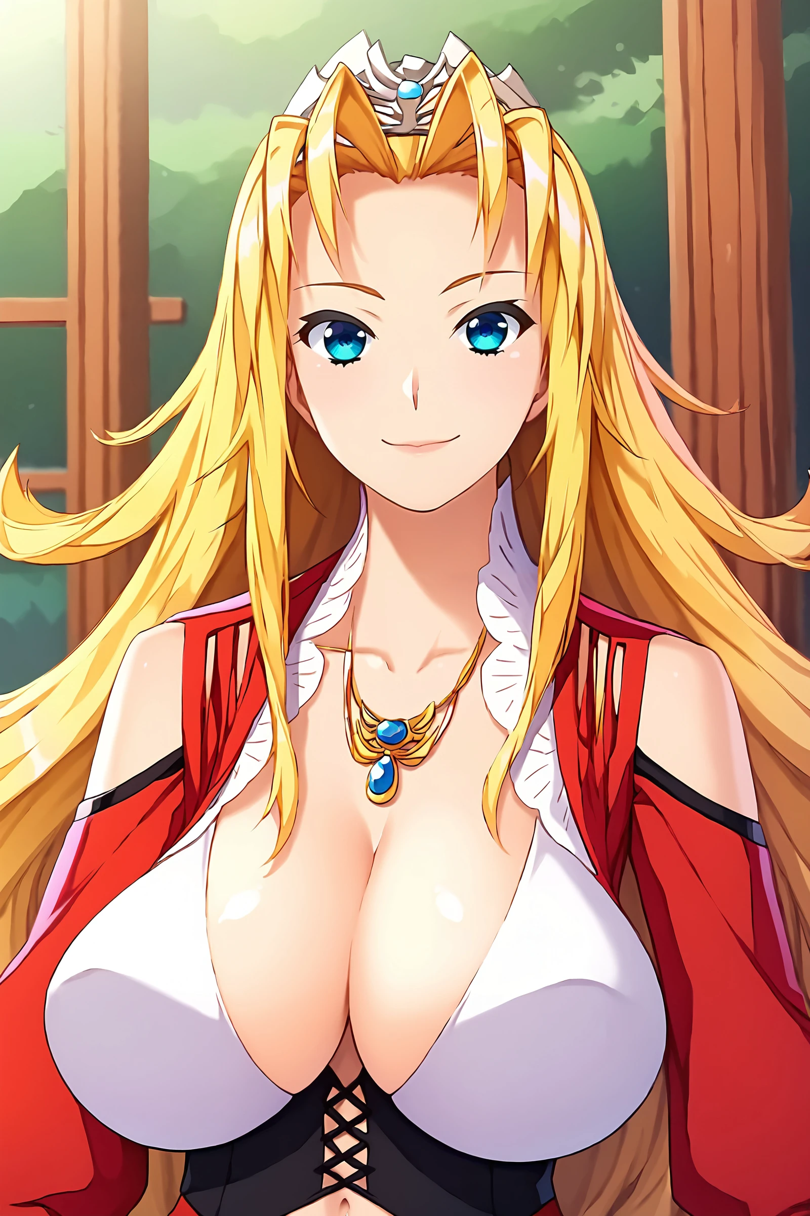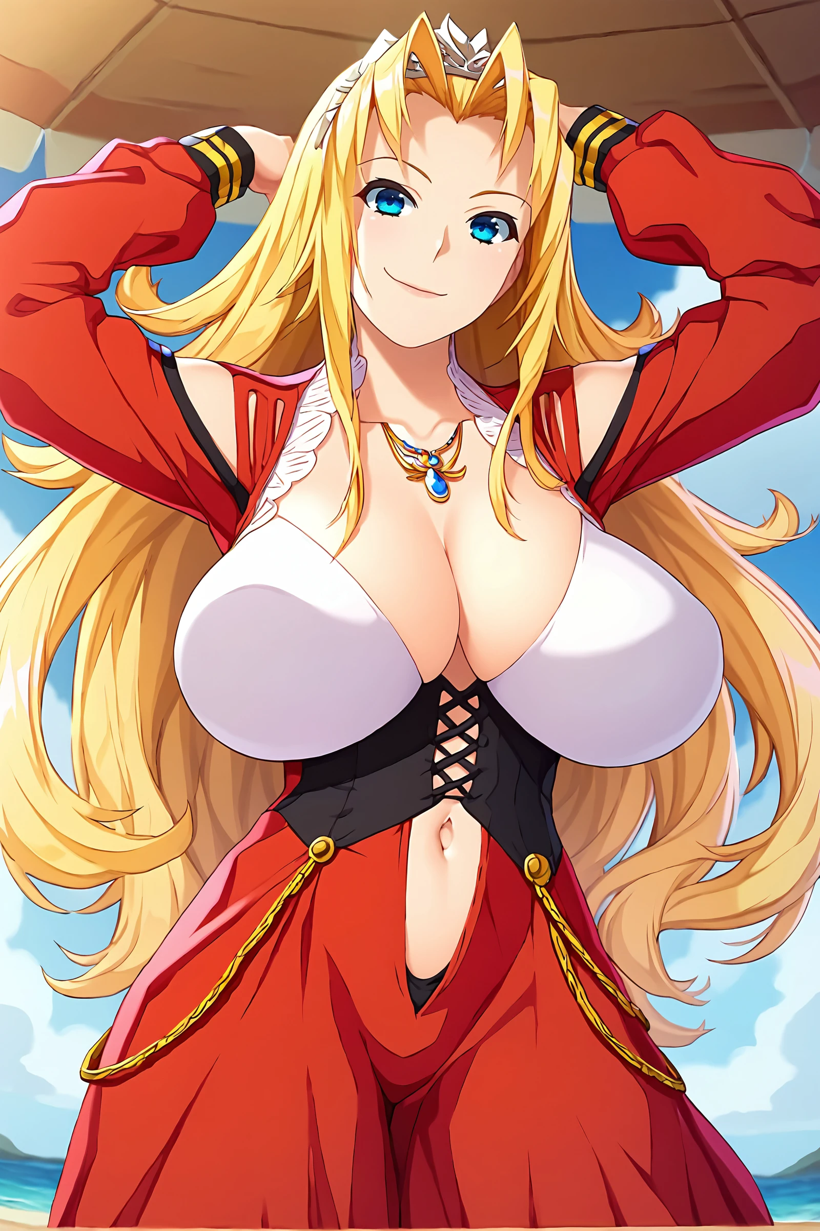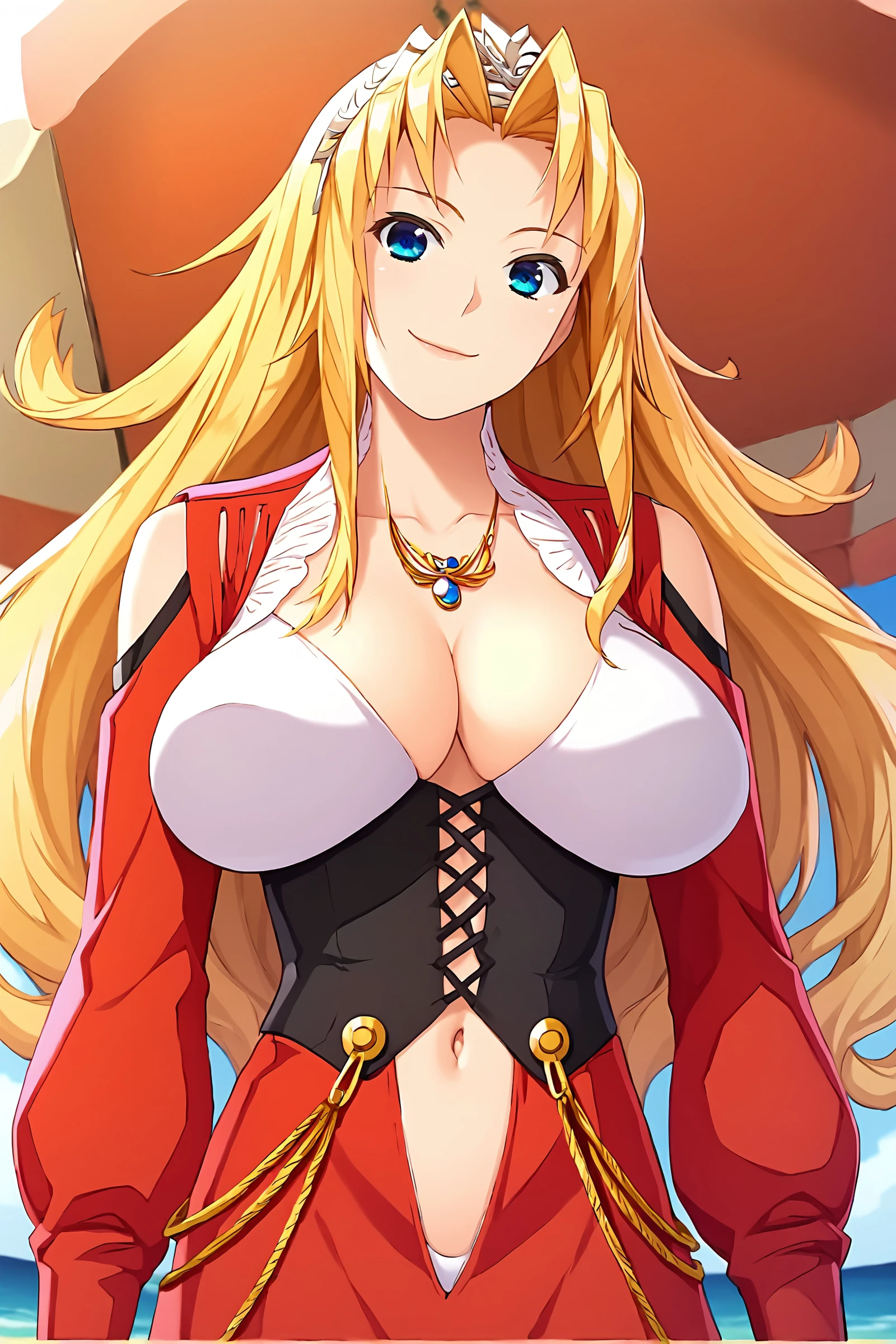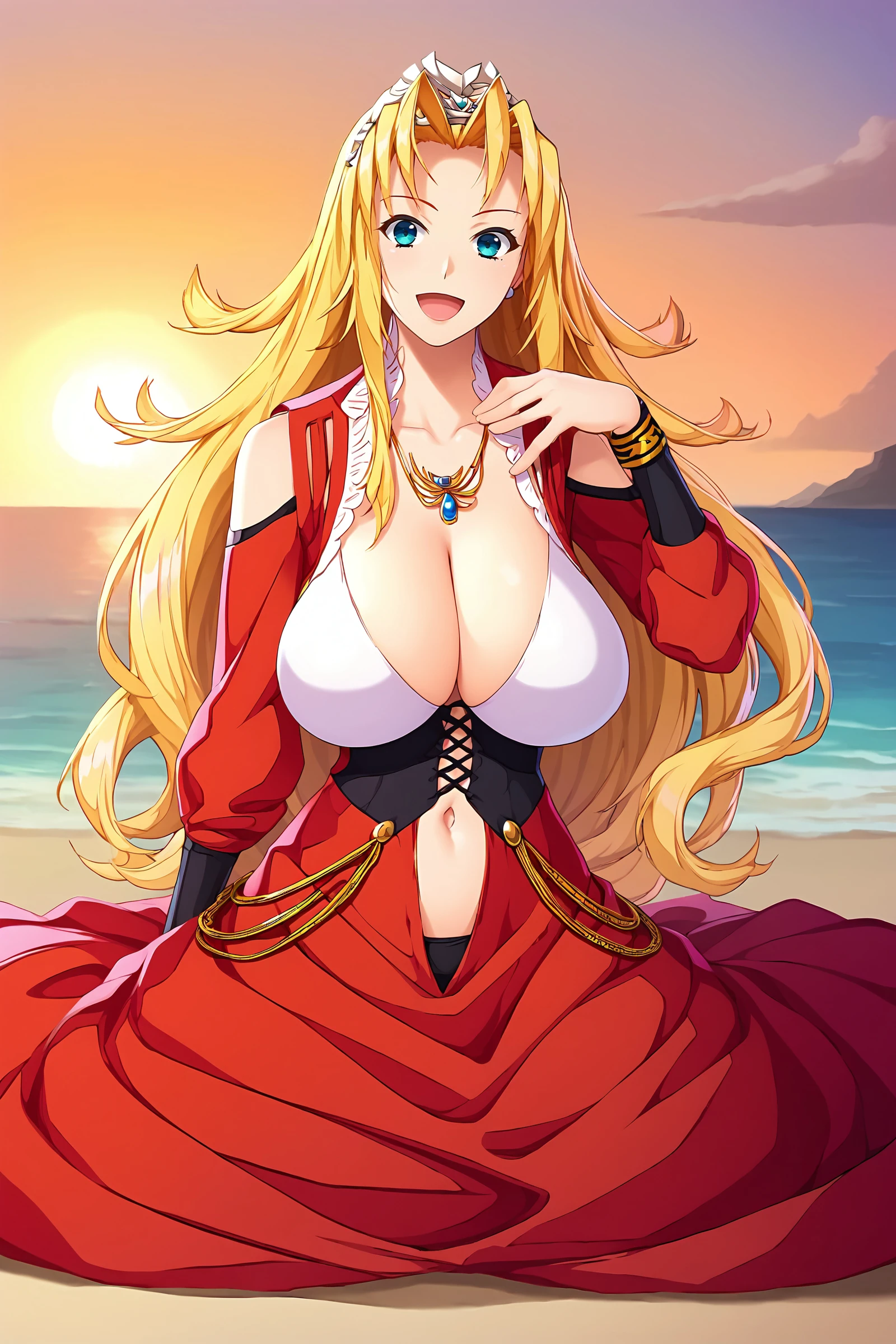 older red dress: bare shoulders, cleavage, black high heels, gem, long dress, long sleeves, necklace, puffy sleeves, red dress, shoulder cutout, tiara, collarbone, corset, navel cutout