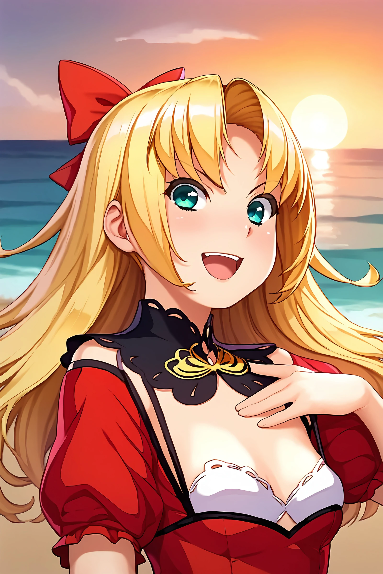 younger red dress: bare shoulders, cleavage, detached collar, dress, hair bow, off-shoulder dress, puffy short sleeves, red bow, red dress, red skirt, red sleeves, short sleeves, strap slip, black shoes