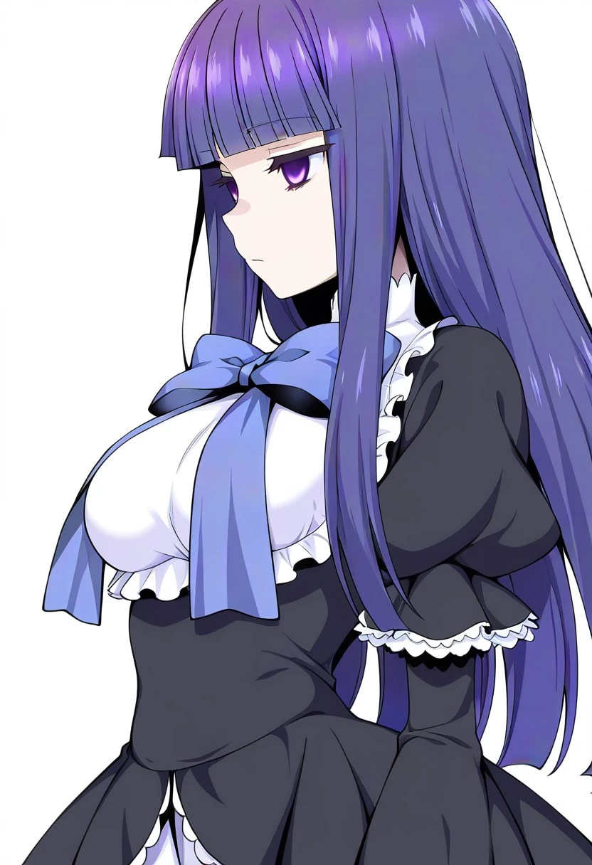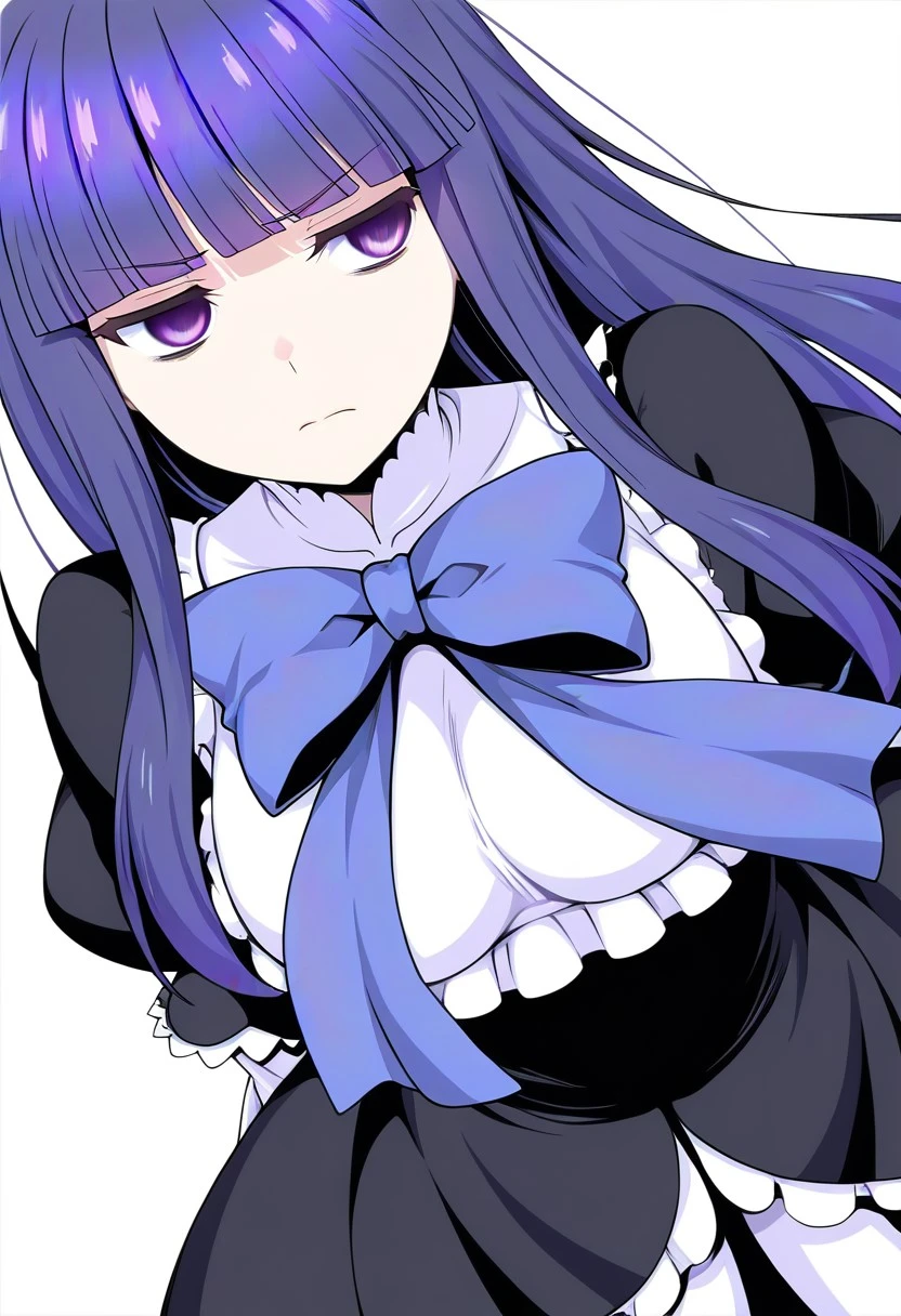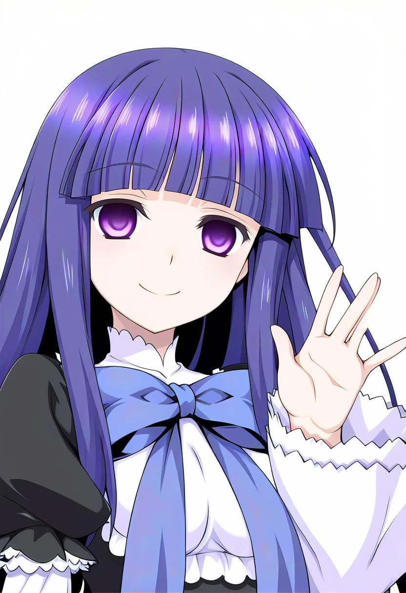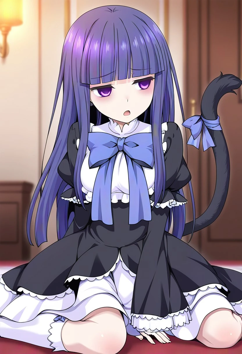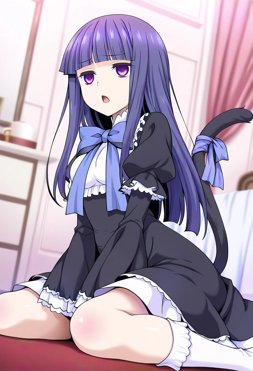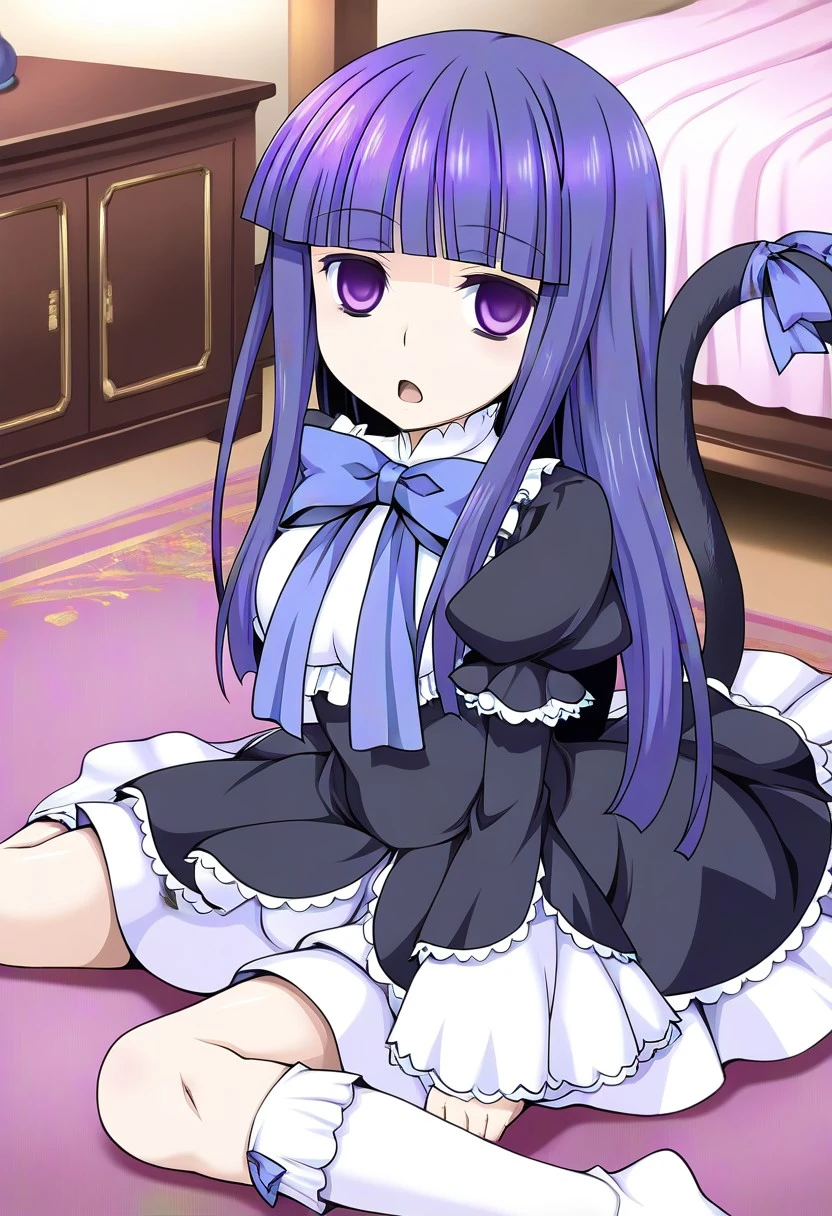 frederica bernkastel, long hair, blue hair, purple eyes, purple hair, bangs, blunt bangs,dress, long sleeves, bow, ribbon, frills, tail, socks, cat tail, white kneehighs,empty eyes