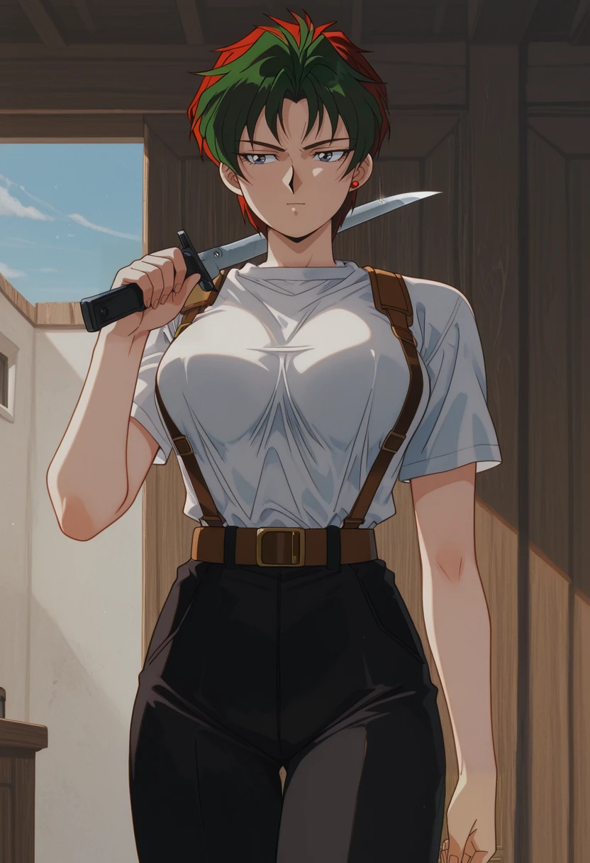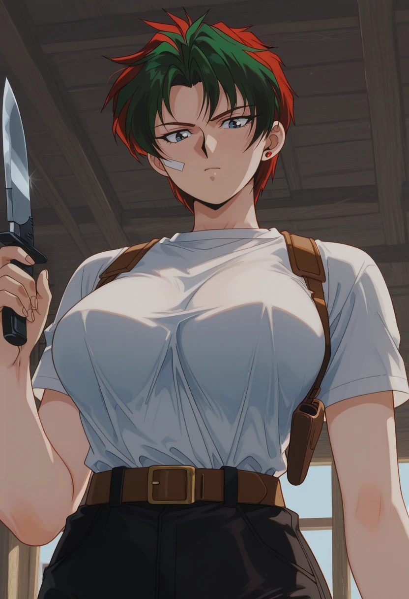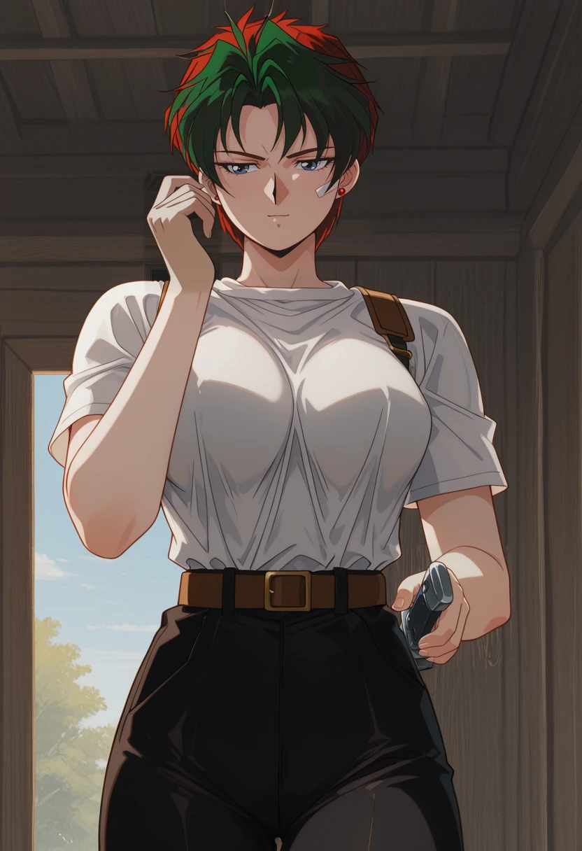NatashaCasual, retro artstyle, 1990s \(style\), 1girl, solo, female focus, blue eyes, red earring, single earring, red hair, multicolored hair, green hair, short hair, large ??????, white t-shirt, short sleeves, black pants, brown belt, sidearm holster, military boots,Natasha Radinov Lingerie: