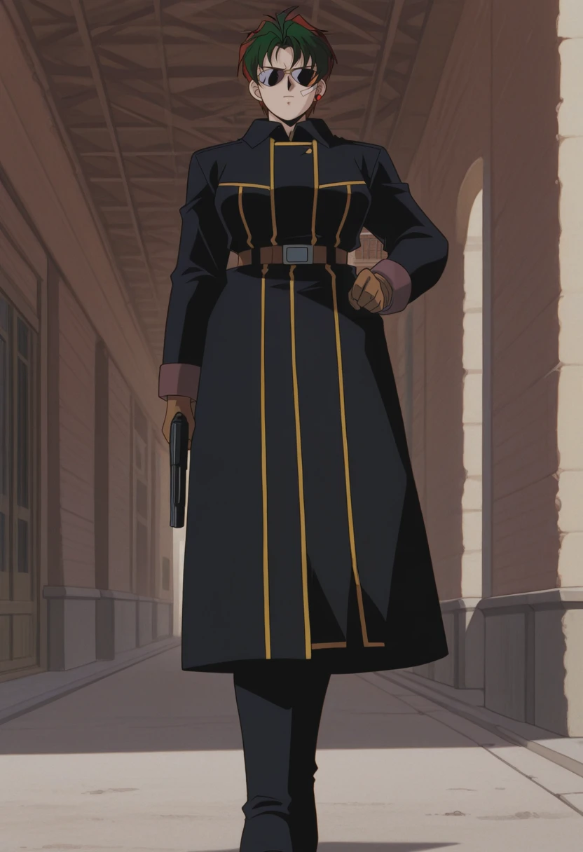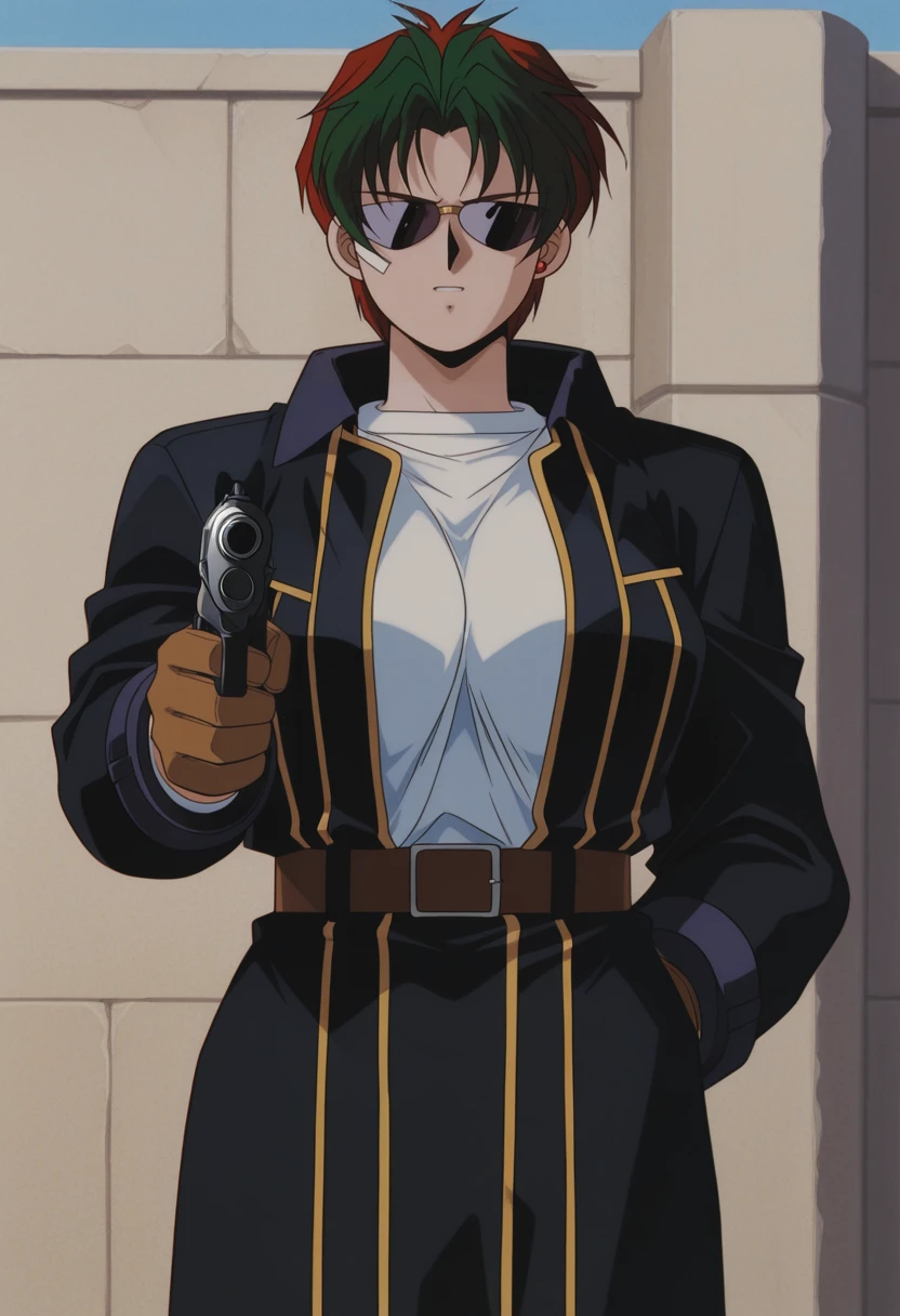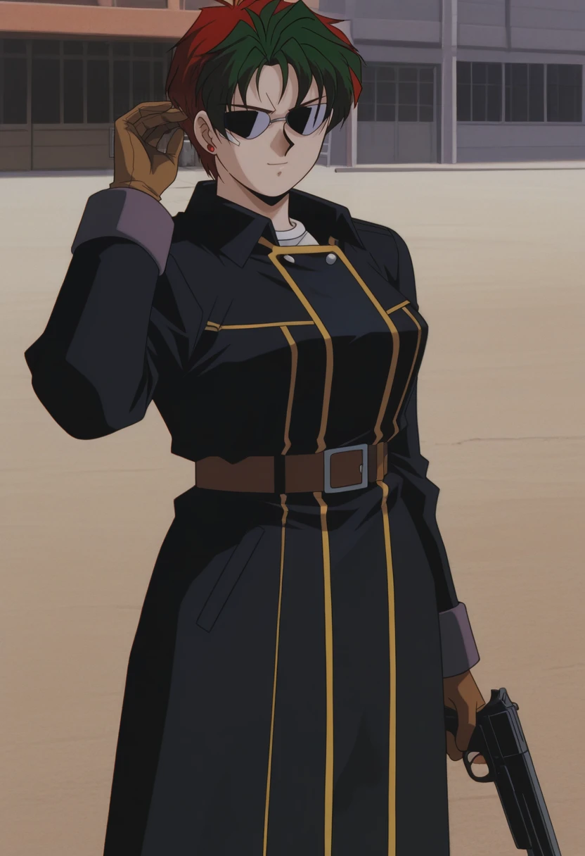 NatashaCoat, retro artstyle, 1990s \(style\), 1girl, solo, female focus, sunglasses, red earring, single earring, red hair, multicolored hair, black coat, coat, green hair, short hair, large ??????, black pants, white t-shirt, brown belt, sidearm holster, long sleeves, brown gloves, military boots,Natasha Radinov Casual: